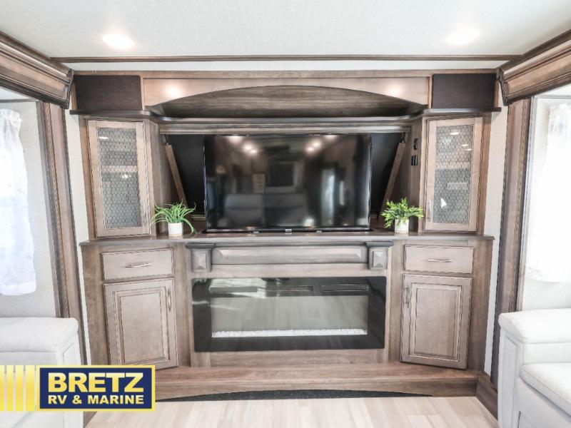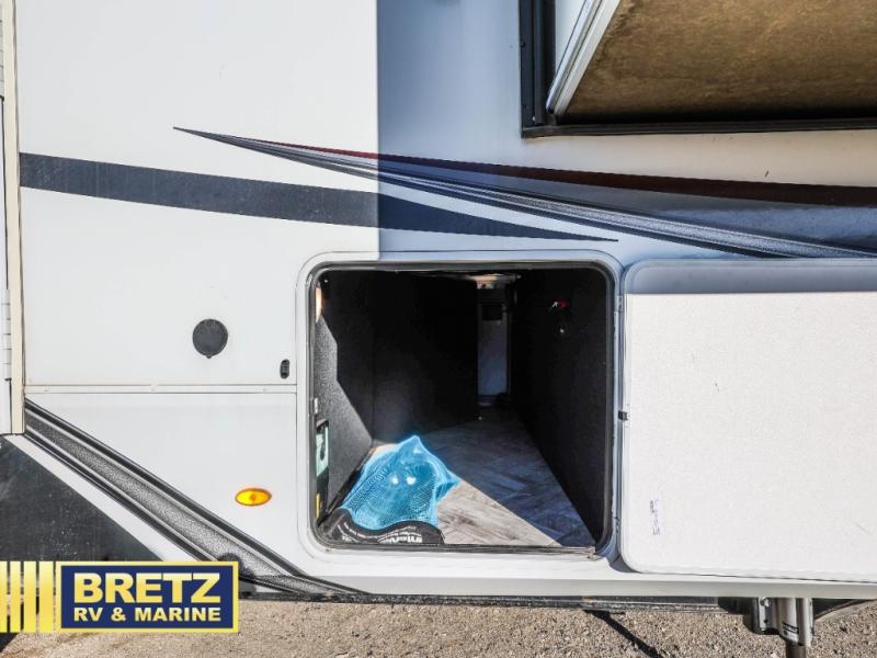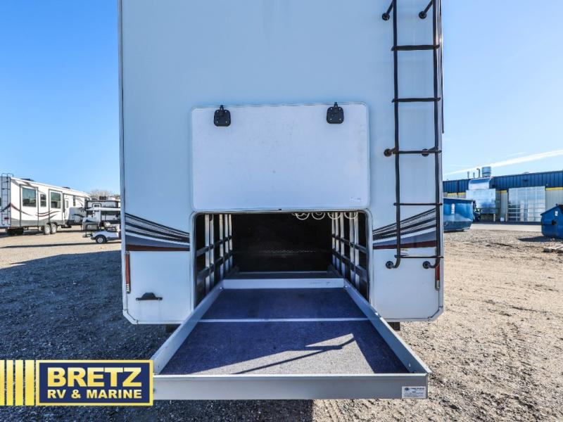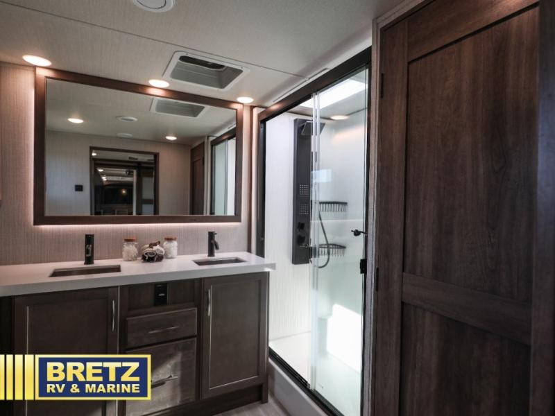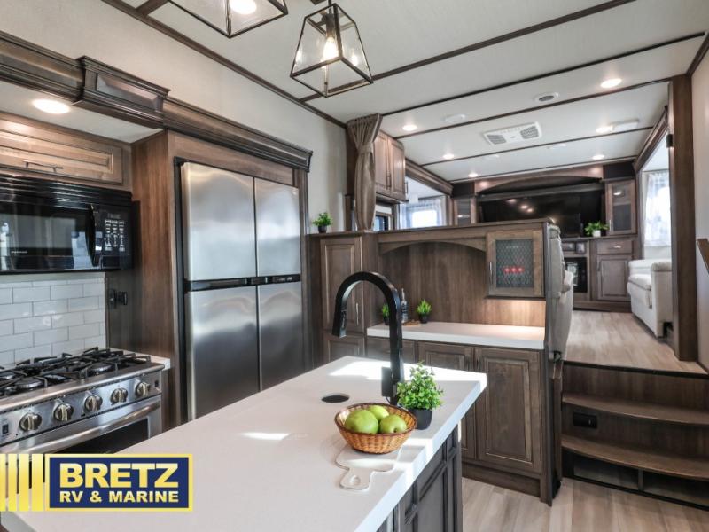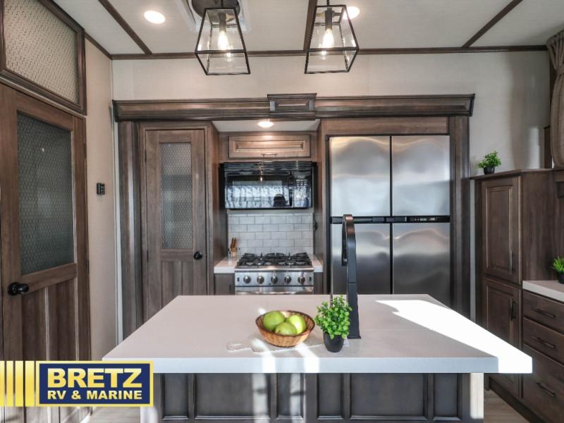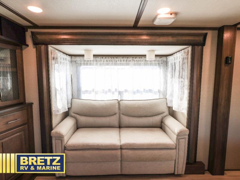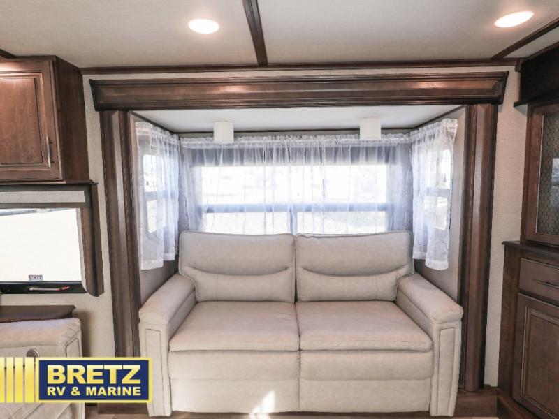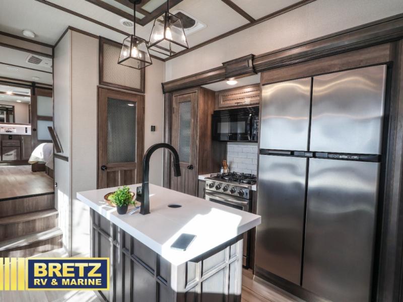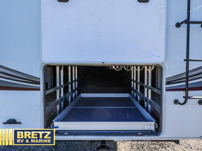 Five slide outs, a full bathroom with dual sinks, a half bath off of the kitchen and a separate front living and entertainment area are a few reasons you will enjoy your time spent in this fifth wheel! And the separate kitchen is a dream with the stainless steel appliances including a 24" residential oven, an oversized pantry, a hutch with counter space, a kitchen island plus a free-standing dinette slide with windows for great views. The entertainment center offers an LED Smart TV with fireplace below and storage, and the dual opposing tri-fold sofas provide sleeping space and you will love the theatre seats in this separate area. The walk-through bedroom includes a queen bed, LED TV and storage, plus space savings sliding doors that lead you to the rear full bathroom with dual sinks, linen storage and space prepped for a washer/dryer option, plus a shower with a seat. You will find more storage throughout the fifth wheel in the overhead cabinets, the entry closet, and under the interior steps for shoes. And the exterior has several storage choices including the pass-through compartment for fishing poles and such, plus the unique sliding tray in the rear allows you to bring along the larger items such as camping tables, portable grills, golf clubs, totes and such.