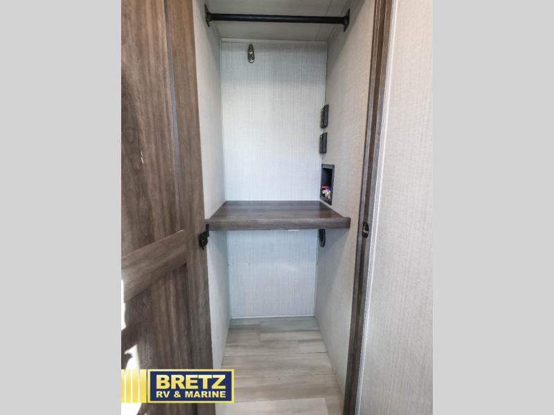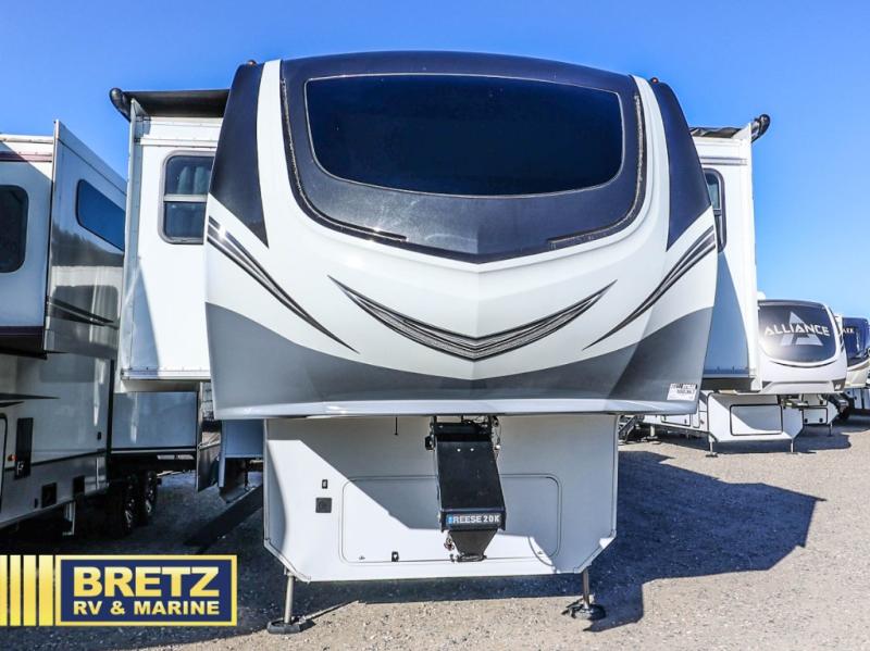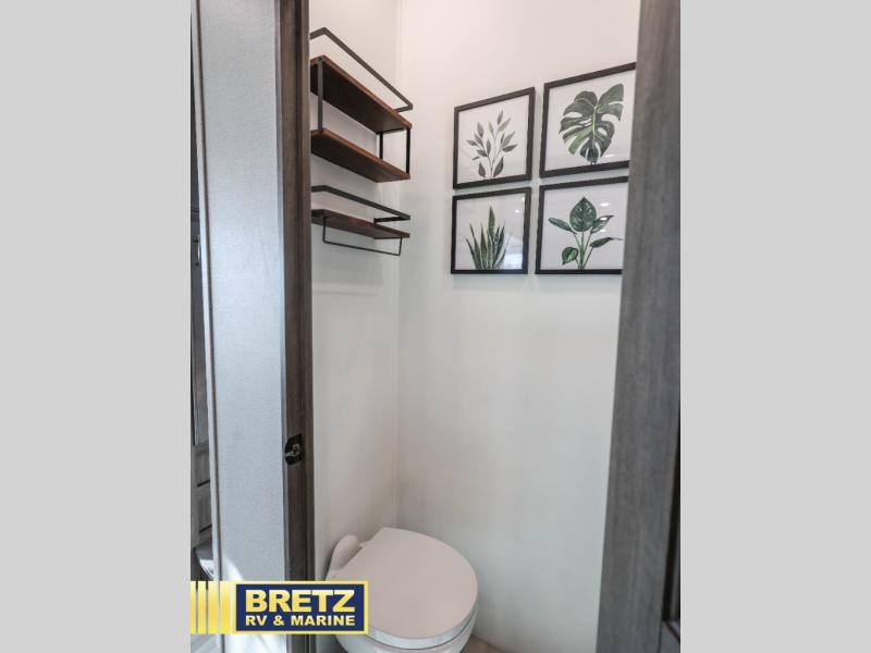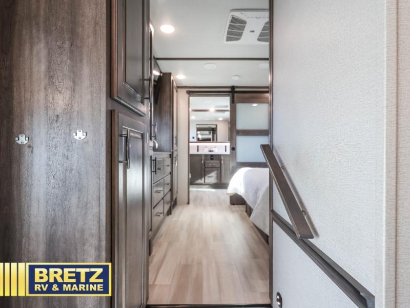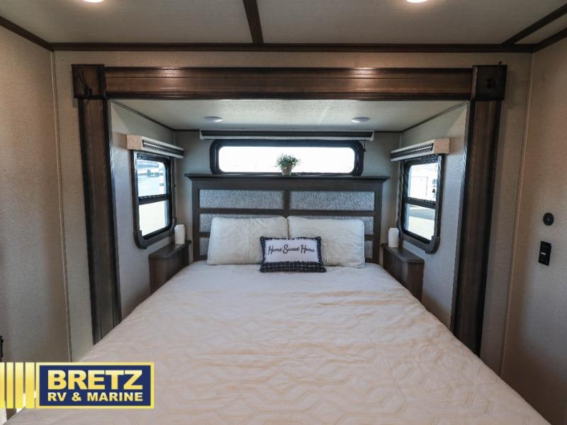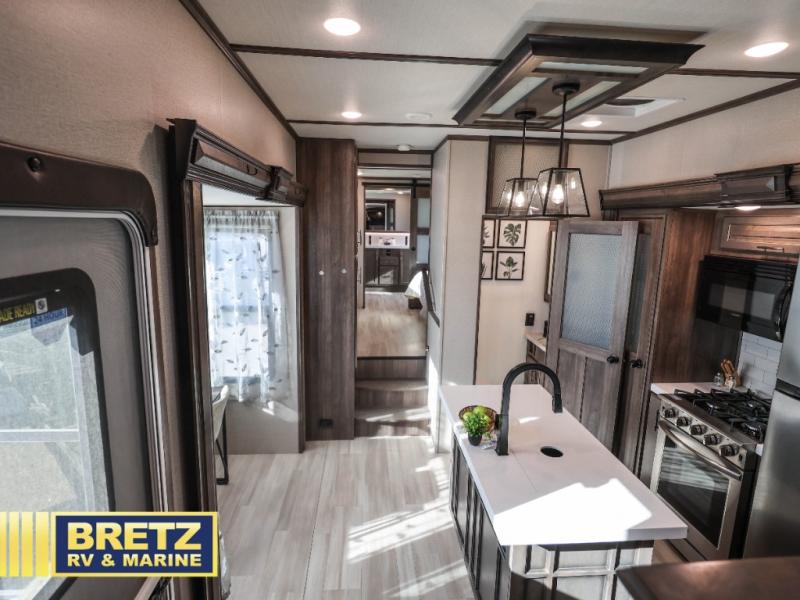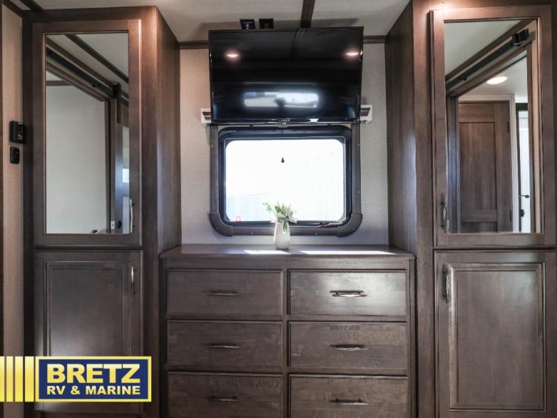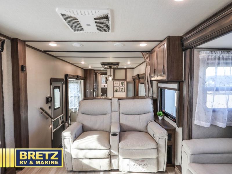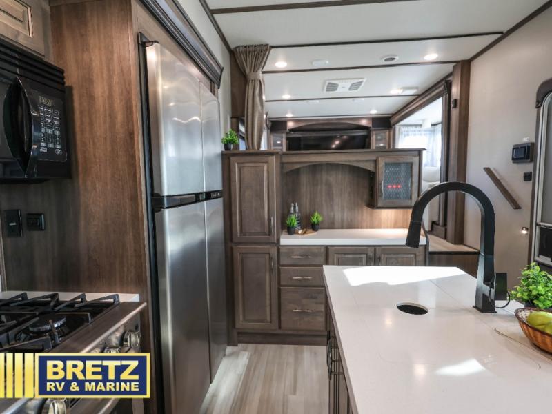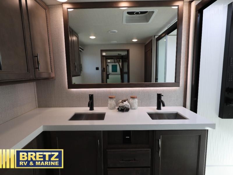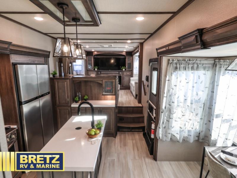 Five slide outs, a full bathroom with dual sinks, a half bath off of the kitchen and a separate front living and entertainment area are a few reasons you will enjoy your time spent in this fifth wheel! And the separate kitchen is a dream with the stainless steel appliances including a 24" residential oven, an oversized pantry, a hutch with counter space, a kitchen island plus a free-standing dinette slide with windows for great views. The entertainment center offers an LED Smart TV with fireplace below and storage, and the dual opposing tri-fold sofas provide sleeping space and you will love the theatre seats in this separate area. The walk-through bedroom includes a queen bed, LED TV and storage, plus space savings sliding doors that lead you to the rear full bathroom with dual sinks, linen storage and space prepped for a washer/dryer option, plus a shower with a seat. You will find more storage throughout the fifth wheel in the overhead cabinets, the entry closet, and under the interior steps for shoes. And the exterior has several storage choices including the pass-through compartment for fishing poles and such, plus the unique sliding tray in the rear allows you to bring along the larger items such as camping tables, portable grills, golf clubs, totes and such.