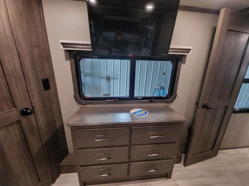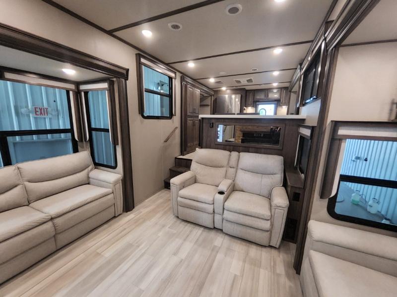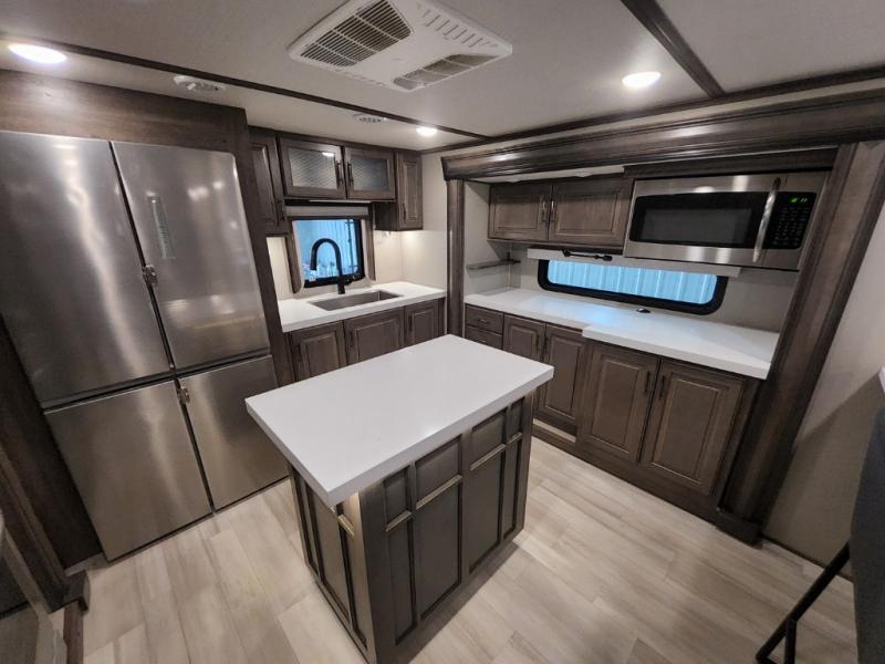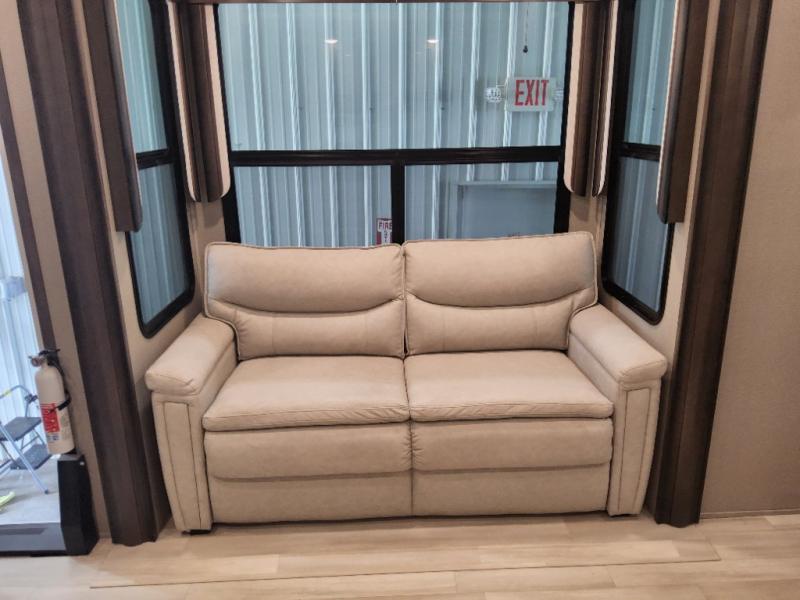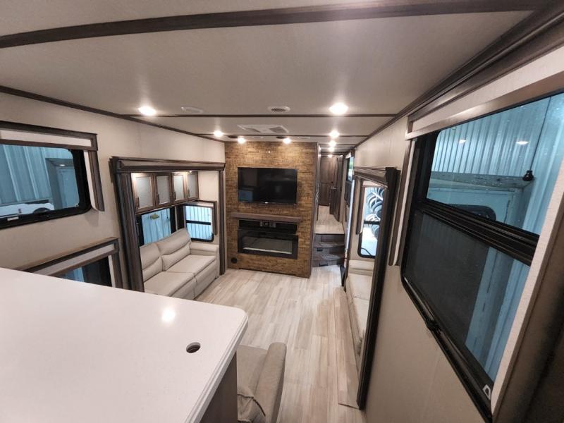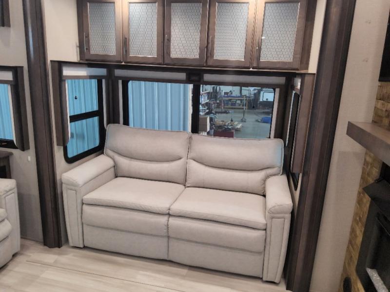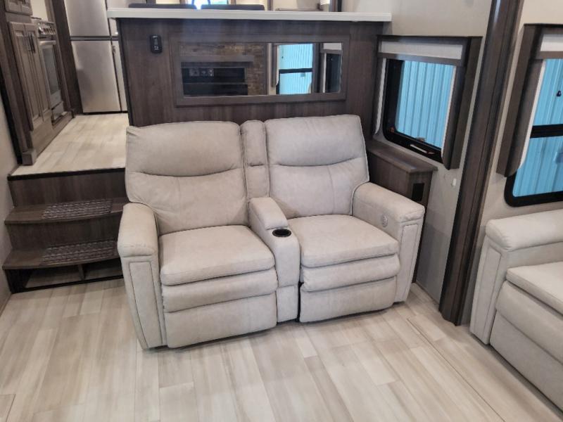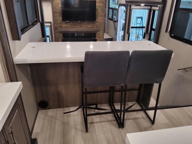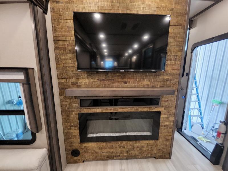 Enjoy each and every vacation, month-long trip or even extended stay at an RV park in this fifth wheel that is spacious from the front to the rear! The raised kitchen gives the cook plenty of room to whip up any type of meal using the stainless steel appliances including the 24" residential oven, the oversized pantry and the raised bar top will provide you even more counter space on top of dining with two chairs that overlook the middle living area. Relaxing is made easy with the two tri-fold sofas and theatre seating while watching the big game on the LED Smart TV and enjoying the fireplace below. Dual sinks in the full bathroom allow two people to easily get ready at once, and the seat in the shower is a nice convenience. At night, retire to your own queen bed slide after sitting on the pull-out ottoman to take your shoes off, and enjoy a show on the LED TV above the flip-top dresser, or wash some linens in the closet with a washer/dryer if you added that option.