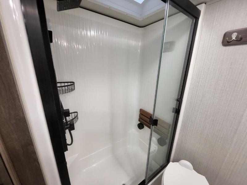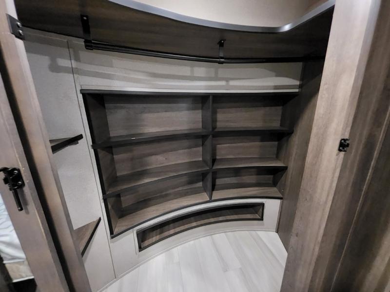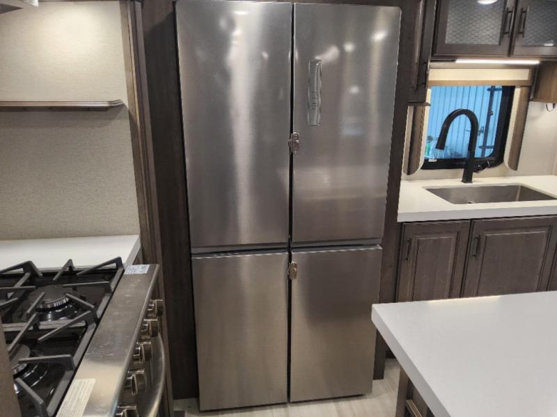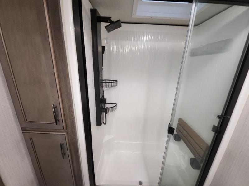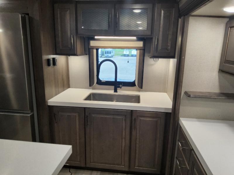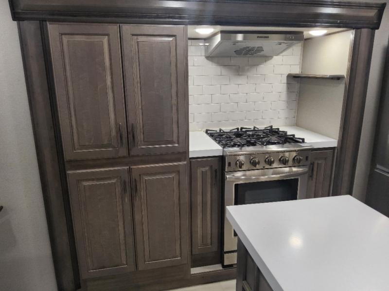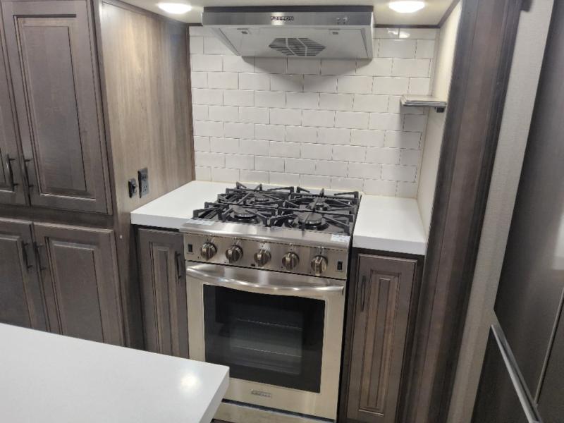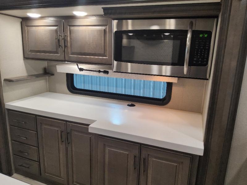 Enjoy each and every vacation, month-long trip or even extended stay at an RV park in this fifth wheel that is spacious from the front to the rear! The raised kitchen gives the cook plenty of room to whip up any type of meal using the stainless steel appliances including the 24" residential oven, the oversized pantry and the raised bar top will provide you even more counter space on top of dining with two chairs that overlook the middle living area. Relaxing is made easy with the two tri-fold sofas and theatre seating while watching the big game on the LED Smart TV and enjoying the fireplace below. Dual sinks in the full bathroom allow two people to easily get ready at once, and the seat in the shower is a nice convenience. At night, retire to your own queen bed slide after sitting on the pull-out ottoman to take your shoes off, and enjoy a show on the LED TV above the flip-top dresser, or wash some linens in the closet with a washer/dryer if you added that option.