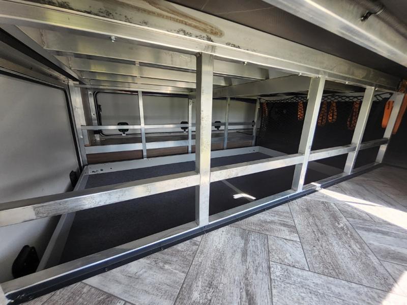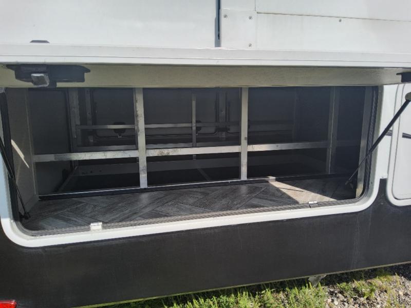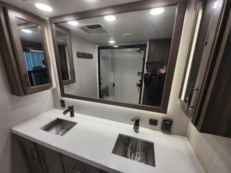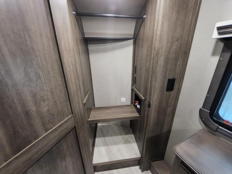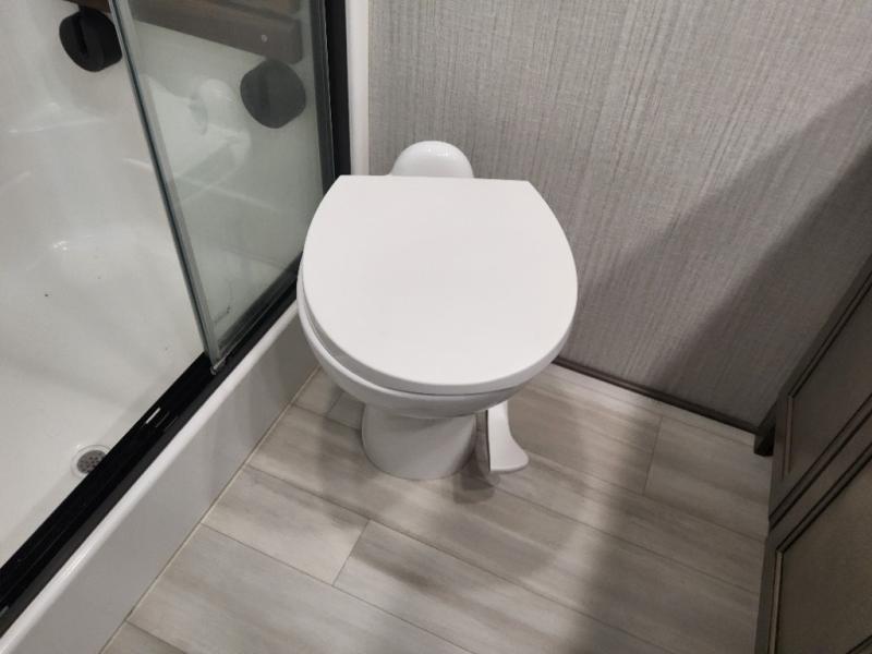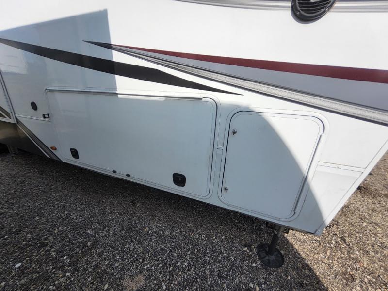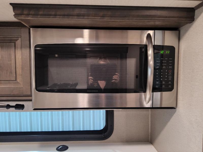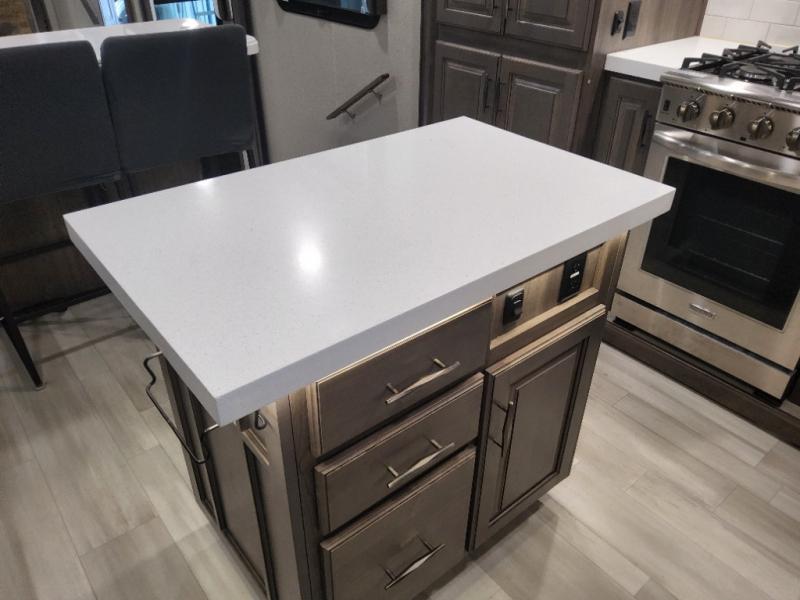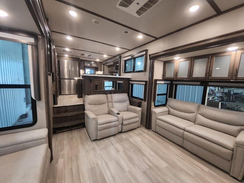 Enjoy each and every vacation, month-long trip or even extended stay at an RV park in this fifth wheel that is spacious from the front to the rear! The raised kitchen gives the cook plenty of room to whip up any type of meal using the stainless steel appliances including the 24" residential oven, the oversized pantry and the raised bar top will provide you even more counter space on top of dining with two chairs that overlook the middle living area. Relaxing is made easy with the two tri-fold sofas and theatre seating while watching the big game on the LED Smart TV and enjoying the fireplace below. Dual sinks in the full bathroom allow two people to easily get ready at once, and the seat in the shower is a nice convenience. At night, retire to your own queen bed slide after sitting on the pull-out ottoman to take your shoes off, and enjoy a show on the LED TV above the flip-top dresser, or wash some linens in the closet with a washer/dryer if you added that option.