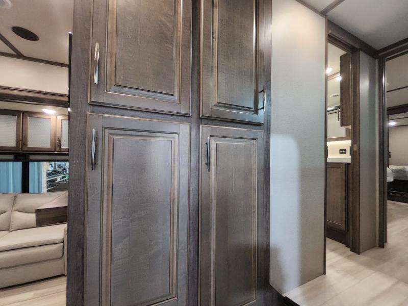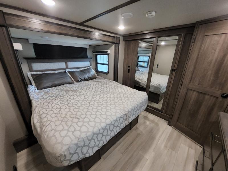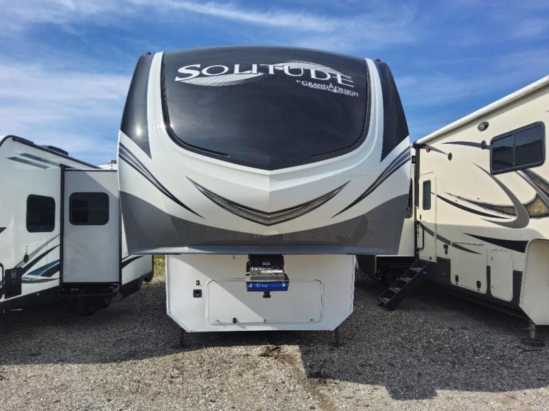 With any Solitude fifth wheel by Grand Design, you will get maximum insulation from the thermal roof design, the exclusive fully laminated walls, the triple insulated main floor, the Rail-Tite underbelly seal, the insulated gooseneck and the insulated baggage doors. The MORryde rubber pin box system utilizes a unique rubber shear spring to positively deal with rough towing and road shock, the Tire Linc TPMS system monitors pressure and temperature, and the 6-point hydraulic system allows you to setup easily. And the upgraded shower system, the hardwood window valances, the oversized kitchen pantry, the window above the master bed headboard, and the Rockford Fosgate stereo entertainment system with HDMI and App controls are a few more reasons you will love these extended-stay fifth wheels!