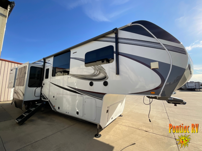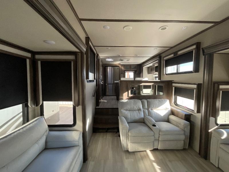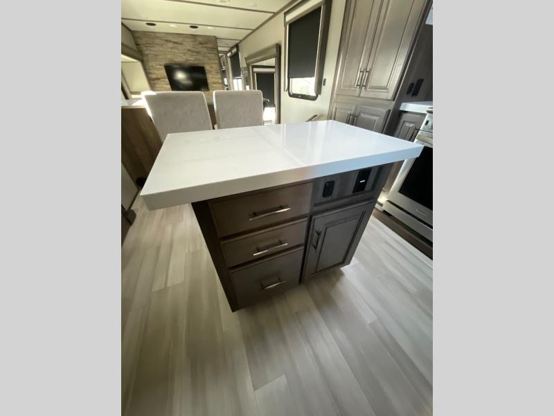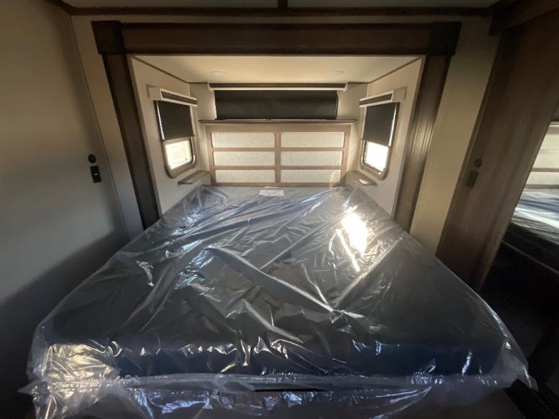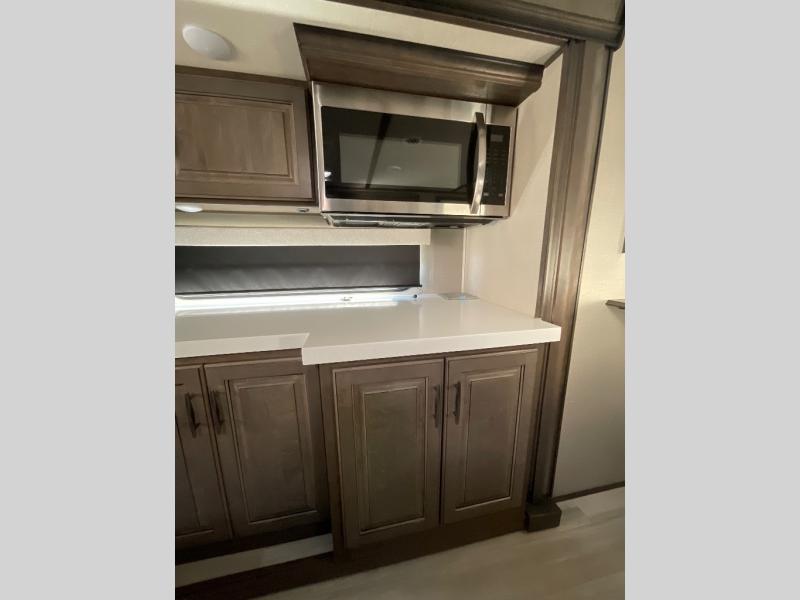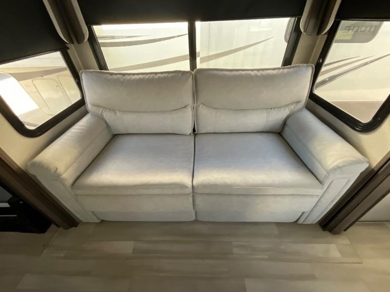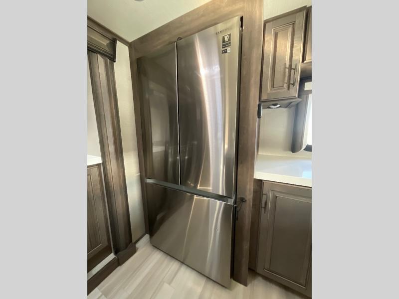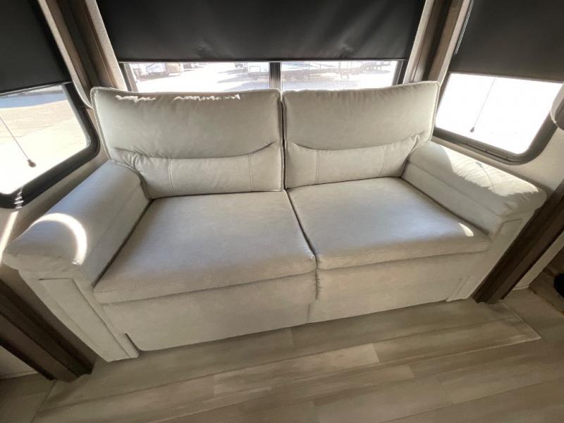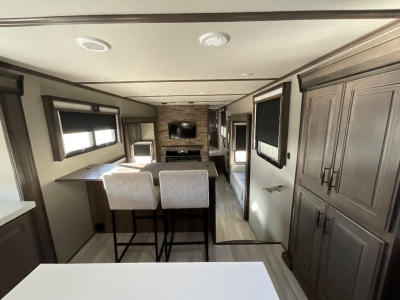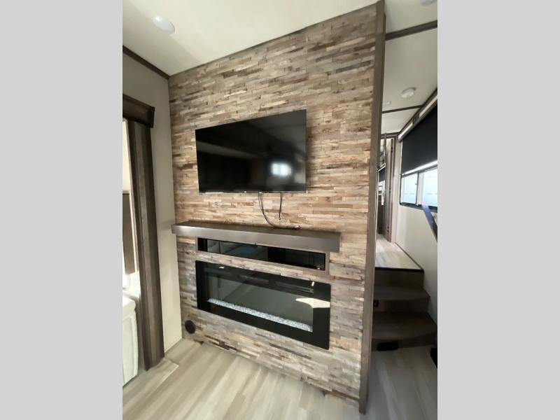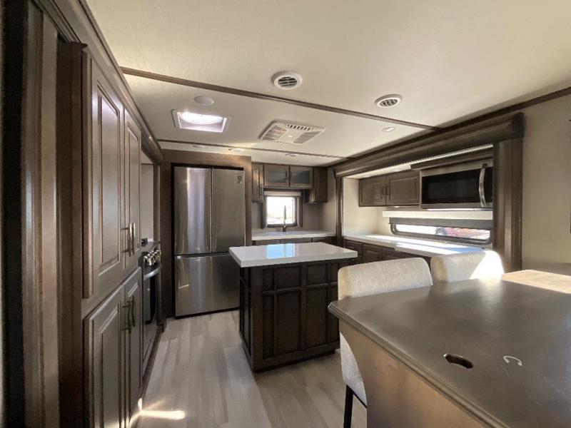 Enjoy each and every vacation, month-long trip or even extended stay at an RV park in this fifth wheel that is spacious from the front to the rear! The raised kitchen gives the cook plenty of room to whip up any type of meal using the stainless steel appliances including the 24" residential oven, the oversized pantry and the raised bar top will provide you even more counter space on top of dining with two chairs that overlook the middle living area. Relaxing is made easy with the two tri-fold sofas and theatre seating while watching the big game on the LED Smart TV and enjoying the fireplace below. Dual sinks in the full bathroom allow two people to easily get ready at once, and the seat in the shower is a nice convenience. At night, retire to your own queen bed slide after sitting on the pull-out ottoman to take your shoes off, and enjoy a show on the LED TV above the flip-top dresser, or wash some linens in the closet with a washer/dryer if you added that option.
