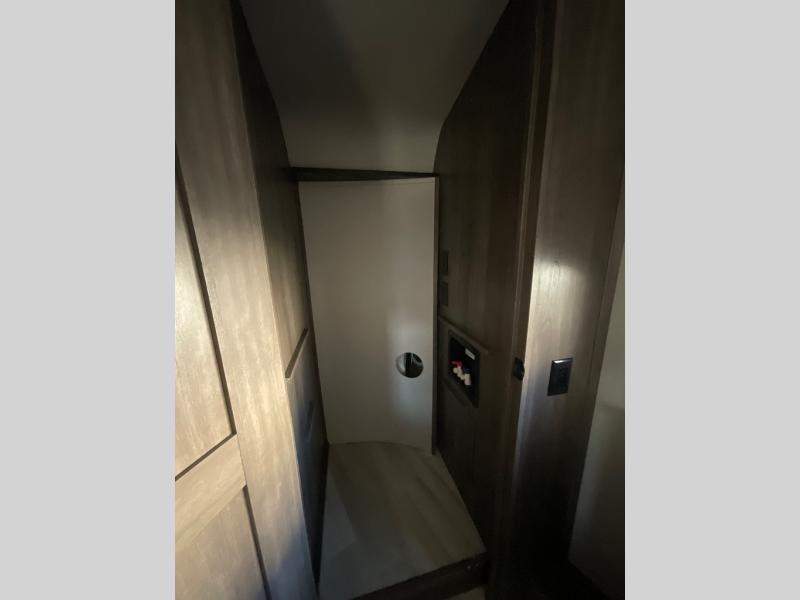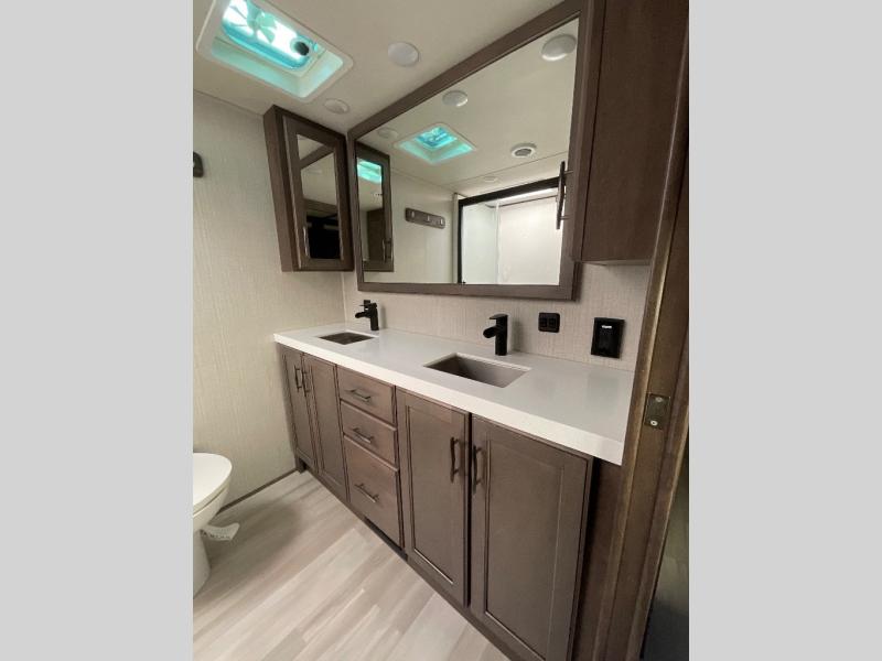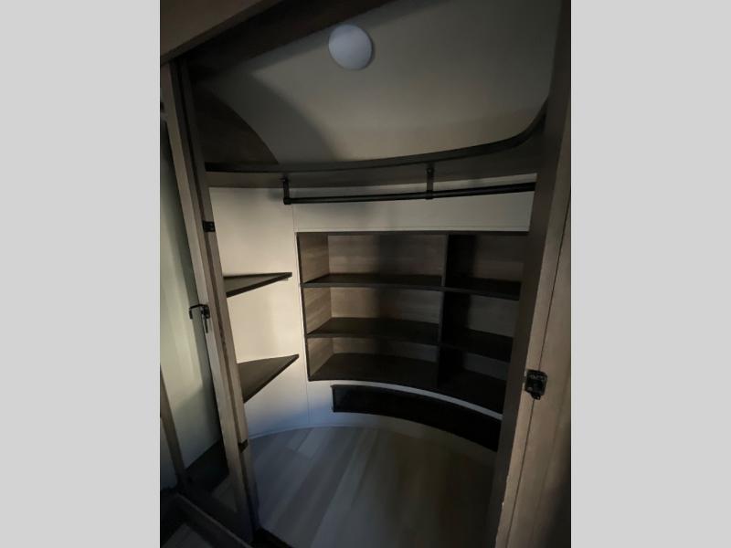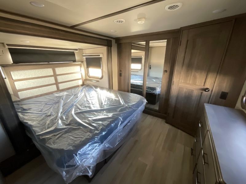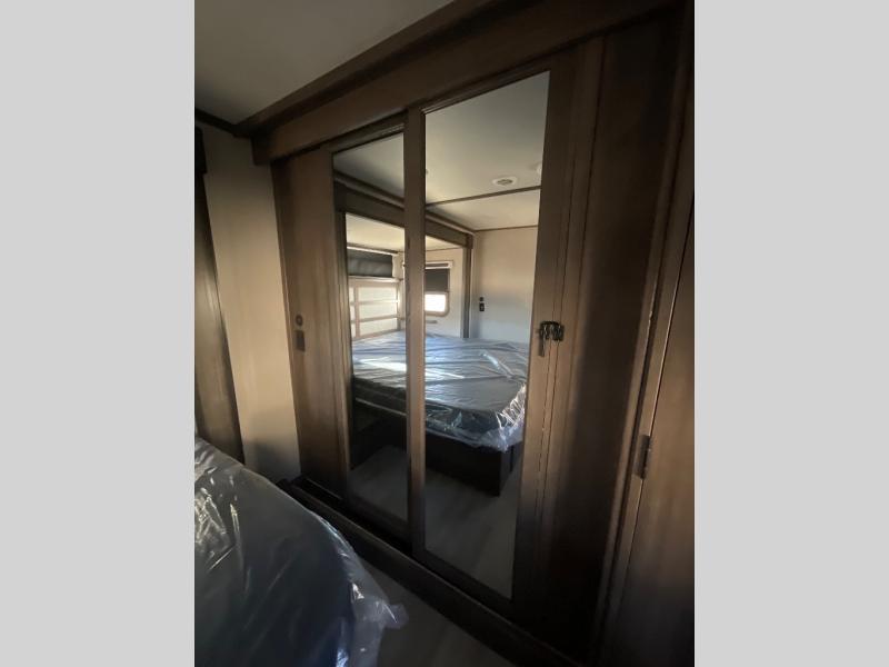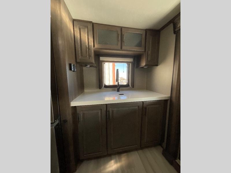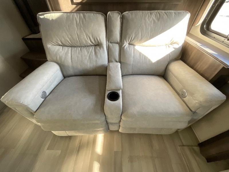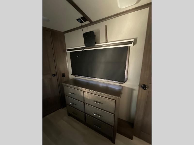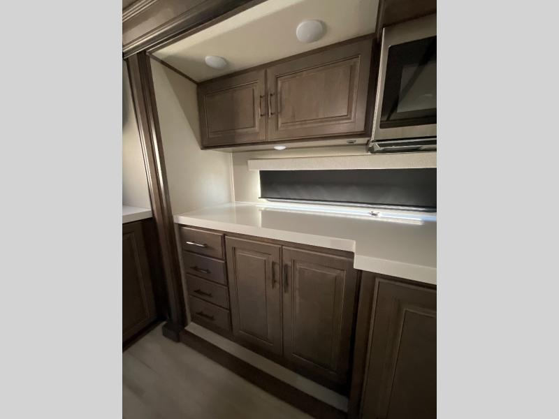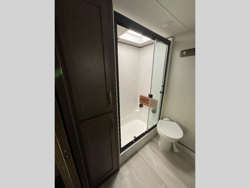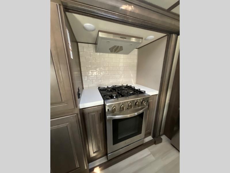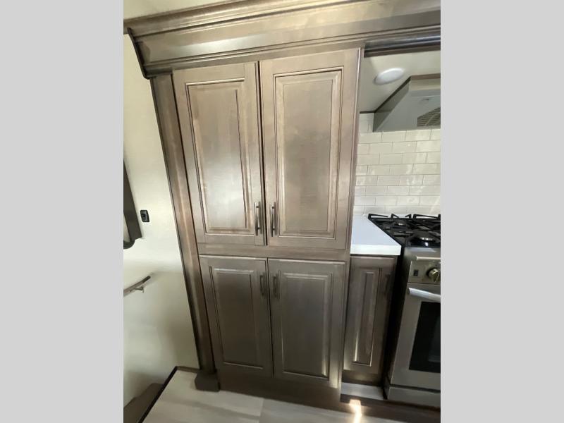 Enjoy each and every vacation, month-long trip or even extended stay at an RV park in this fifth wheel that is spacious from the front to the rear! The raised kitchen gives the cook plenty of room to whip up any type of meal using the stainless steel appliances including the 24" residential oven, the oversized pantry and the raised bar top will provide you even more counter space on top of dining with two chairs that overlook the middle living area. Relaxing is made easy with the two tri-fold sofas and theatre seating while watching the big game on the LED Smart TV and enjoying the fireplace below. Dual sinks in the full bathroom allow two people to easily get ready at once, and the seat in the shower is a nice convenience. At night, retire to your own queen bed slide after sitting on the pull-out ottoman to take your shoes off, and enjoy a show on the LED TV above the flip-top dresser, or wash some linens in the closet with a washer/dryer if you added that option.