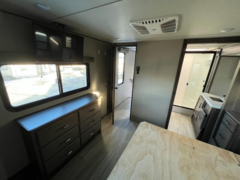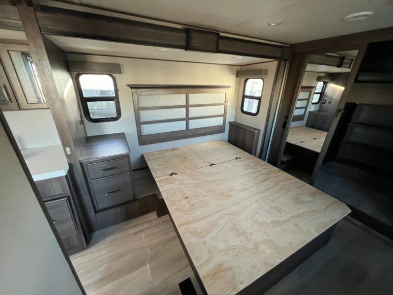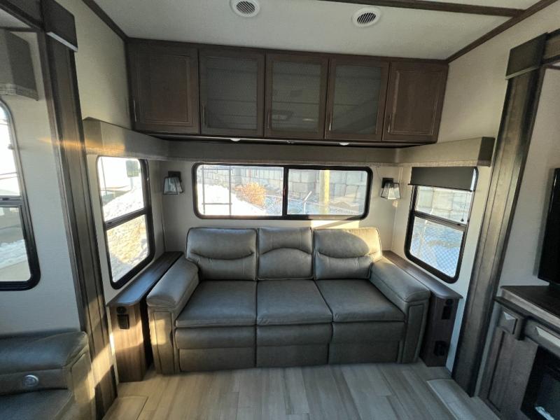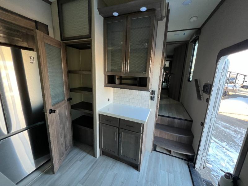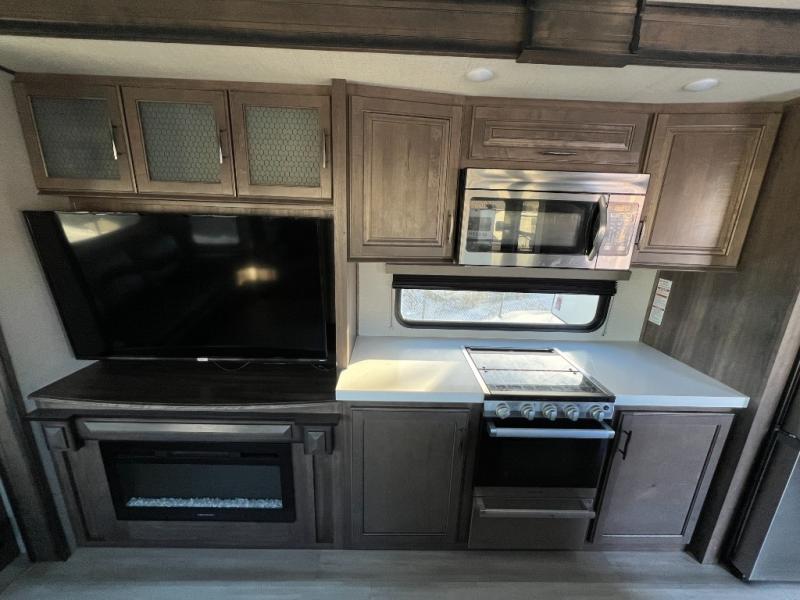Step into luxury with this fifth wheel! Your crew can visit in the rear living area on the tri-fold sofa, the theatre seating, or at the free-standing dinette. The LED TV and fireplace will make it feel more like home, and the chef of your group can cook dinner on the stainless steel cooktop with an oven. There is also a large pantry and a hutch for extra storage space. You will love the front master bedroom with a slide out queen bed that can be optioned out for a king bed, a dresser with an LED TV, plus a large front closet to keep your clothes wrinkle-free. There is even washer and dryer prep to keep up on laundry if you plan to go full-time!