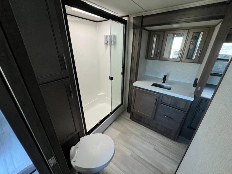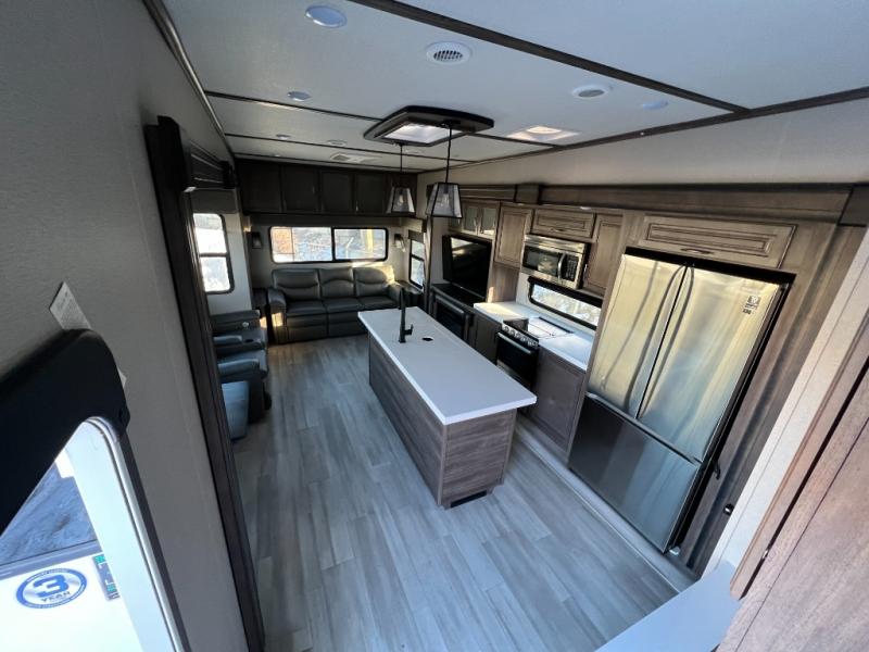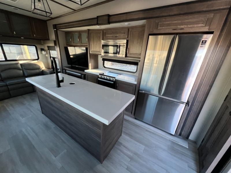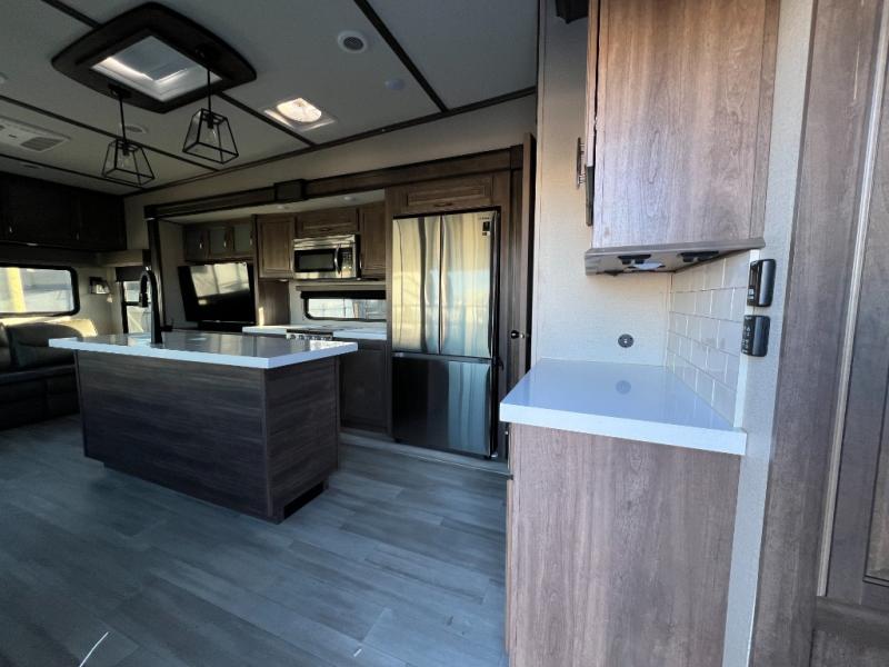 With any Solitude S-Class fifth wheel by Grand Design you will appreciate the Max Built Construction Package that features a 101" wide-body, gel coat exterior sidewalls, heavy-duty 7,000 lb. axles, plus many more durable construction materials. The self-adjusting brakes and the MORryde CRE3000 suspension system will provide a smooth towing experience, and each model includes heavy duty 17.5" H-rated tires with NitroFill. Some of the features you are sure to love are included in the Residential Living Package, like the solid surface countertops and sink covers, the hardwood cabinet doors, the night stands with USB ports, and the Rockford Fosgate stereo entertainment system with HDMI and App controls. These fifth wheels are extended-stay approved thanks to the Weather-Tek Package with a 35,000 BTU high-capacity furnace, the Stealth A/C system, and many high-end residential finishes to make you feel like you taken home with you!