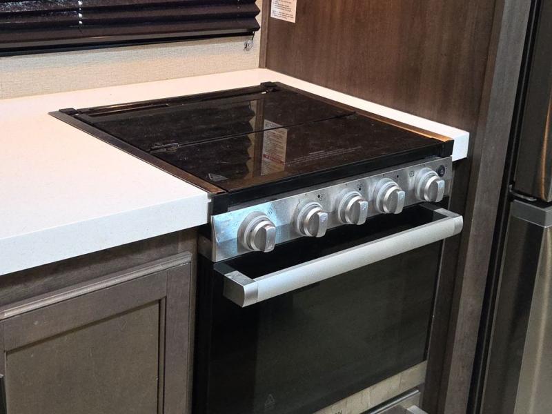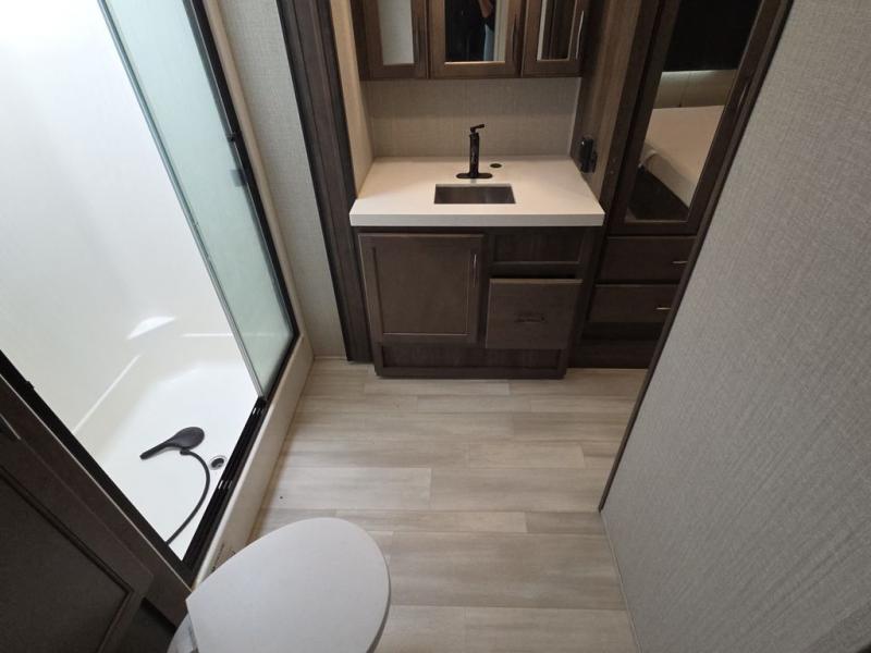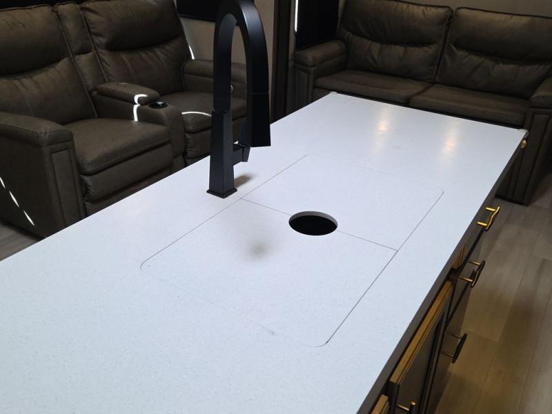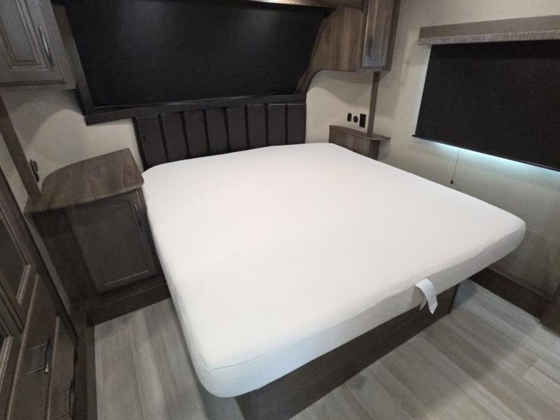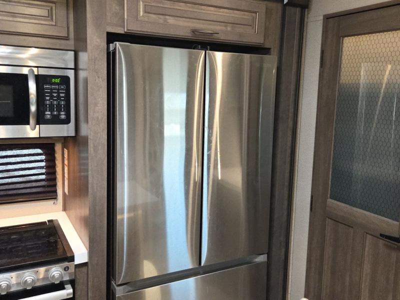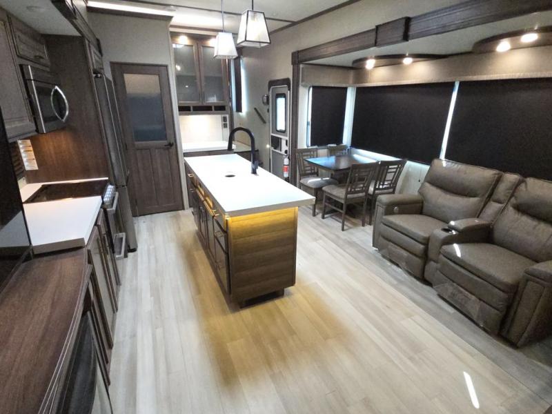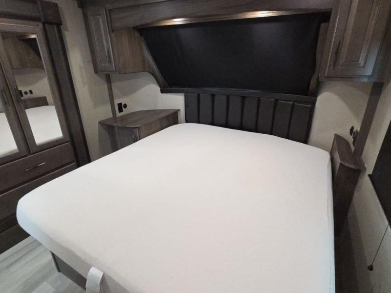 With any Solitude S-Class fifth wheel by Grand Design you will appreciate the Max Built Construction Package that features a 101" wide-body, gel coat exterior sidewalls, heavy-duty 7,000 lb. axles, plus many more durable construction materials. The self-adjusting brakes and the MORryde CRE3000 suspension system will provide a smooth towing experience, and each model includes heavy duty 17.5" H-rated tires with NitroFill. Some of the features you are sure to love are included in the Residential Living Package, like the solid surface countertops and sink covers, the hardwood cabinet doors, the night stands with USB ports, and the Rockford Fosgate stereo entertainment system with HDMI and App controls. These fifth wheels are extended-stay approved thanks to the Weather-Tek Package with a 35,000 BTU high-capacity furnace, the Stealth A/C system, and many high-end residential finishes to make you feel like you taken home with you!
