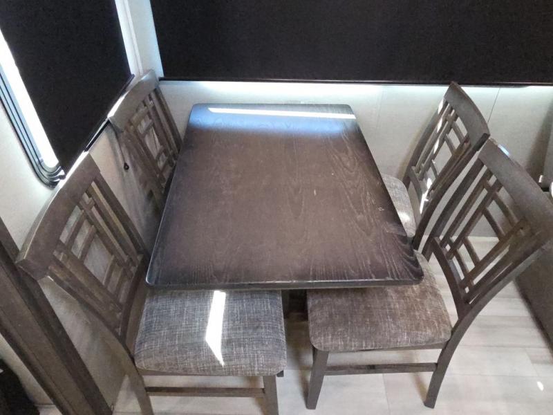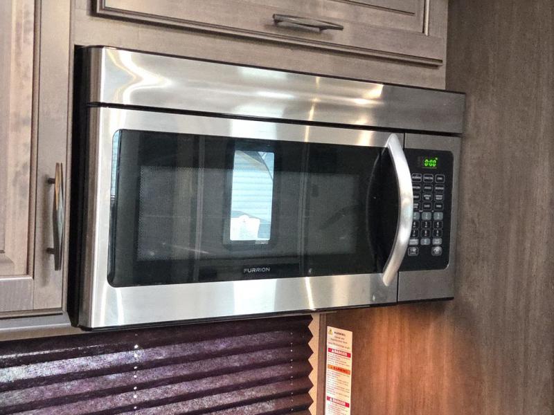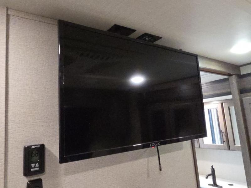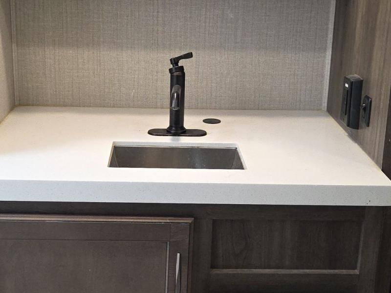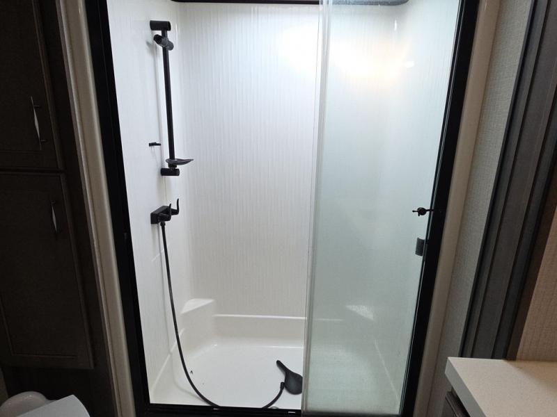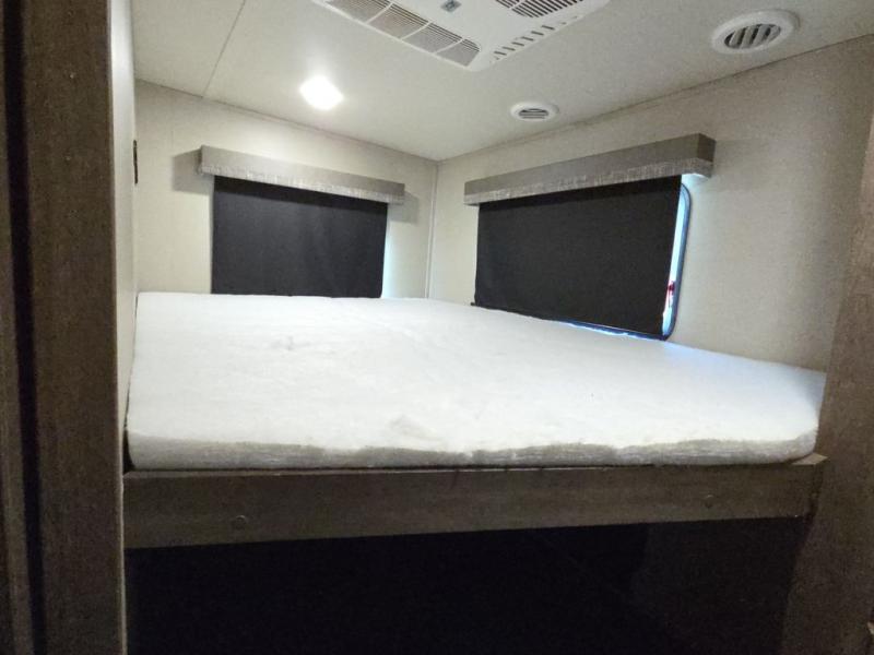 Camping with family and friends is easier than ever in this fifth wheel that can sleep eight people each night. The little ones can take the double-size bunks in the rear private bunkhouse, and there is also a wardrobe here to hang their clothes. There is a tri-fold sofa in the main living area for any other guests you have over, and you will enjoy the front master bedroom with a queen bed. The bedroom also includes access into the dual entry bath, a large slide out with two drawers and space to hang your clothes, plus nightstands with USB ports to charge your gadgets. Head outdoors to grill up some burgers on the outside grill, and don't forget to grab a cold drink from the outdoor beverage cooler!