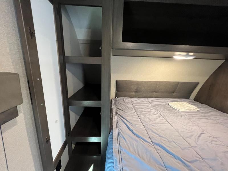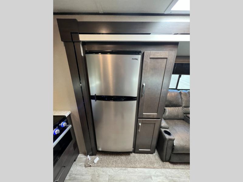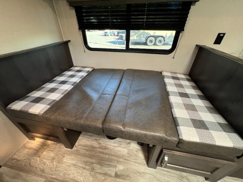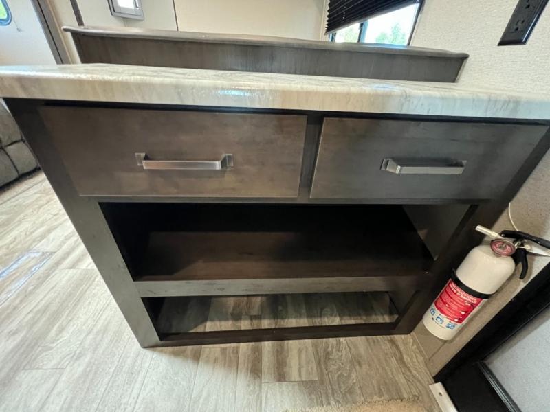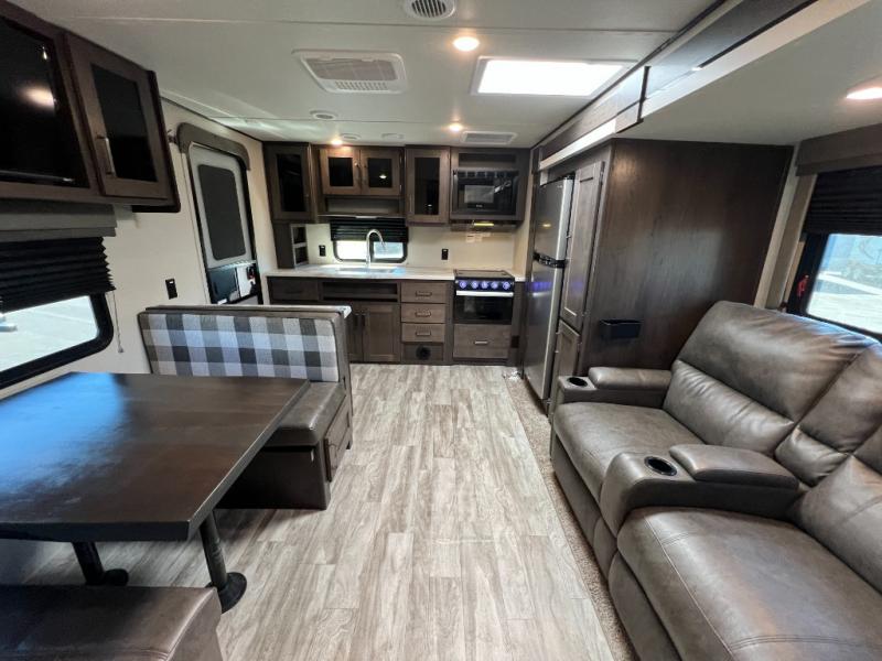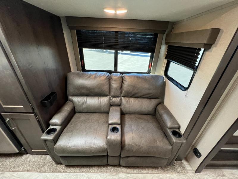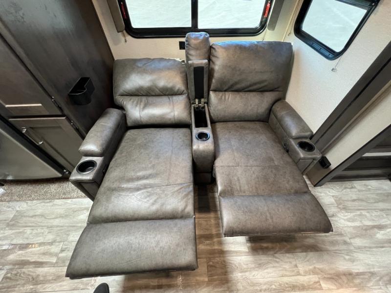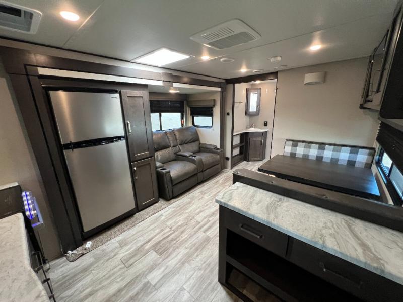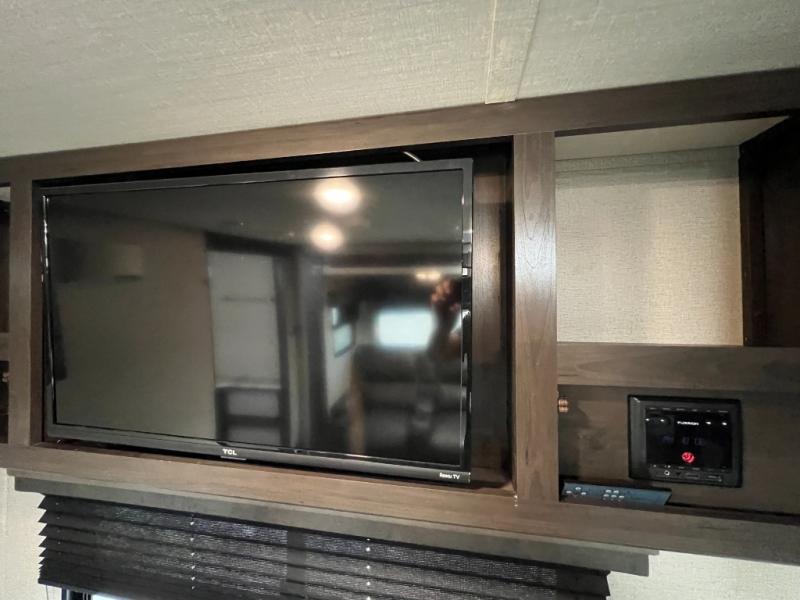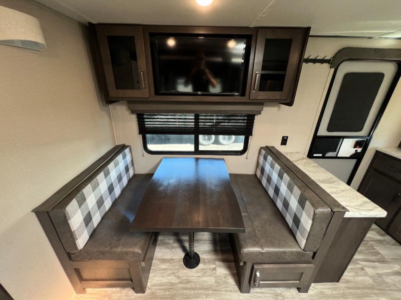 This couple's trailer is perfect for all your outdoor excursions. When you aren't relaxing with a cold drink under the 20' power awning, you may find yourself cooking in the rear kitchen or relaxing on the 62" theater seating. There is a booth dinette perfect for a guest or two little ones to sleep on, plus there is a walk-through bath that is conveniently located for everyone. You'll get a great night's rest on the queen bed in the front master bedroom, plus you have your own exterior entry door so that you can sneak out early to get some fishing done!