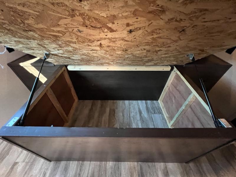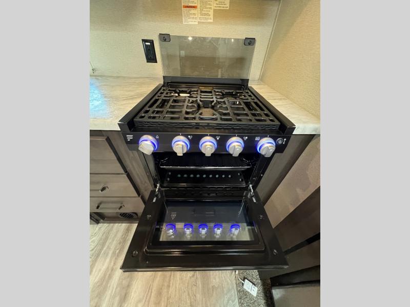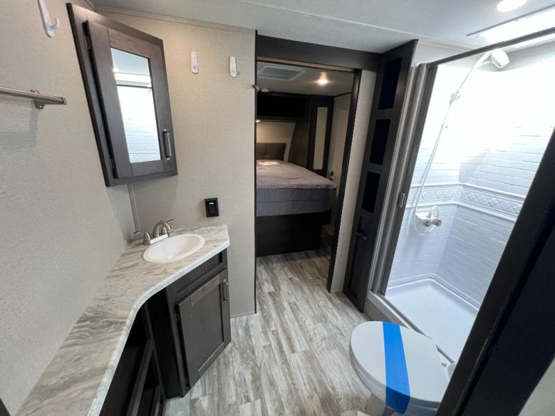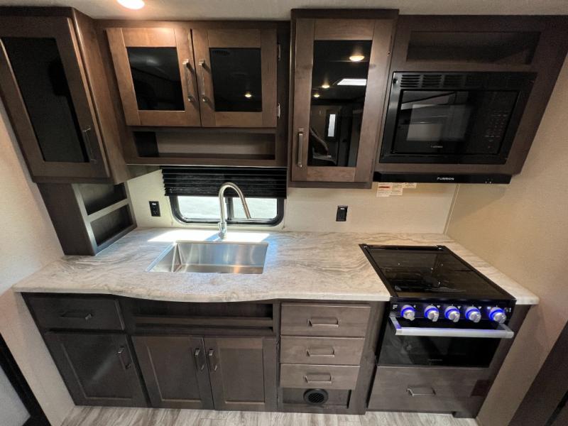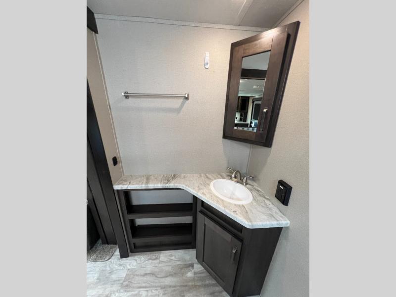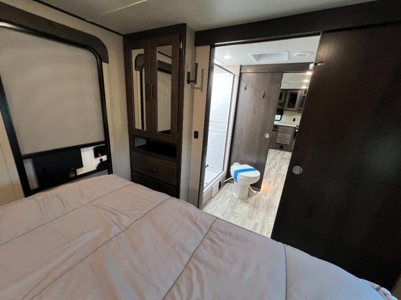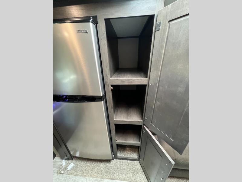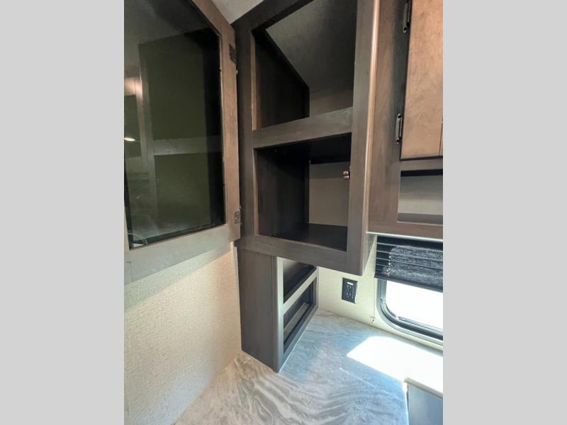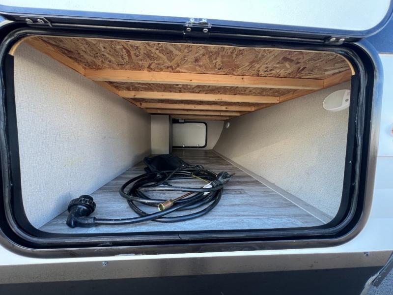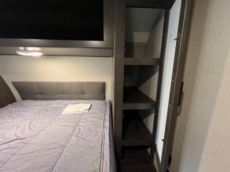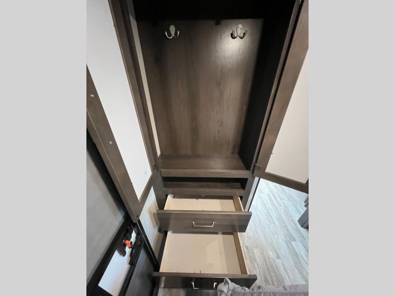 This couple's trailer is perfect for all your outdoor excursions. When you aren't relaxing with a cold drink under the 20' power awning, you may find yourself cooking in the rear kitchen or relaxing on the 62" theater seating. There is a booth dinette perfect for a guest or two little ones to sleep on, plus there is a walk-through bath that is conveniently located for everyone. You'll get a great night's rest on the queen bed in the front master bedroom, plus you have your own exterior entry door so that you can sneak out early to get some fishing done!