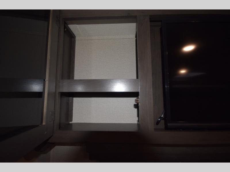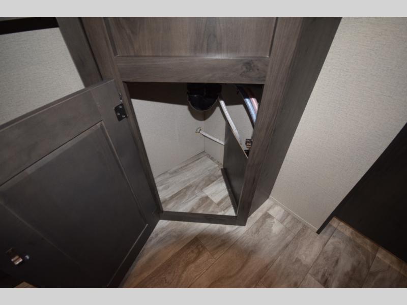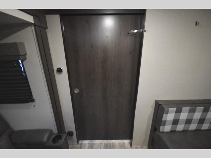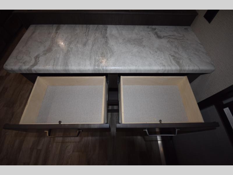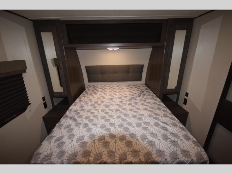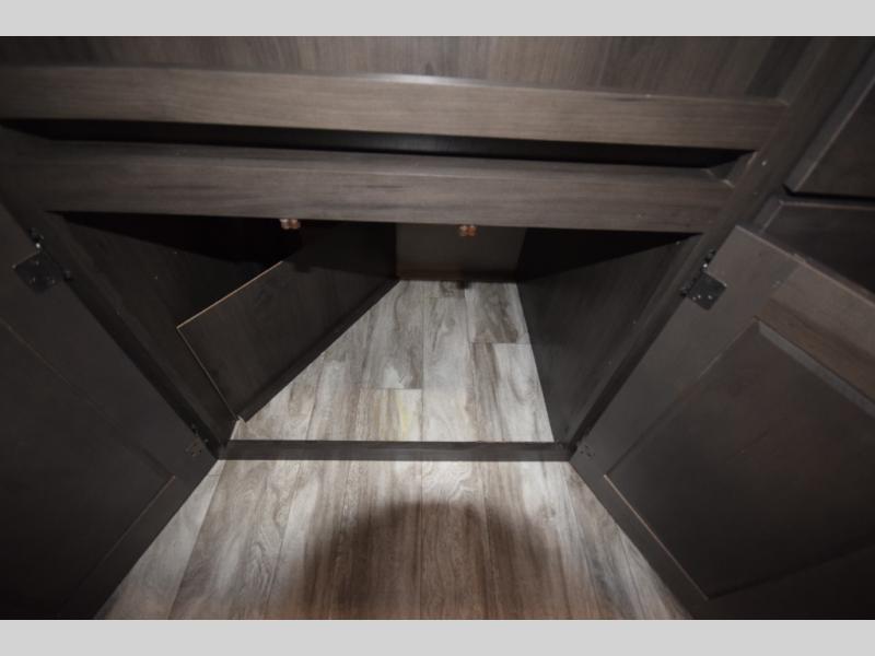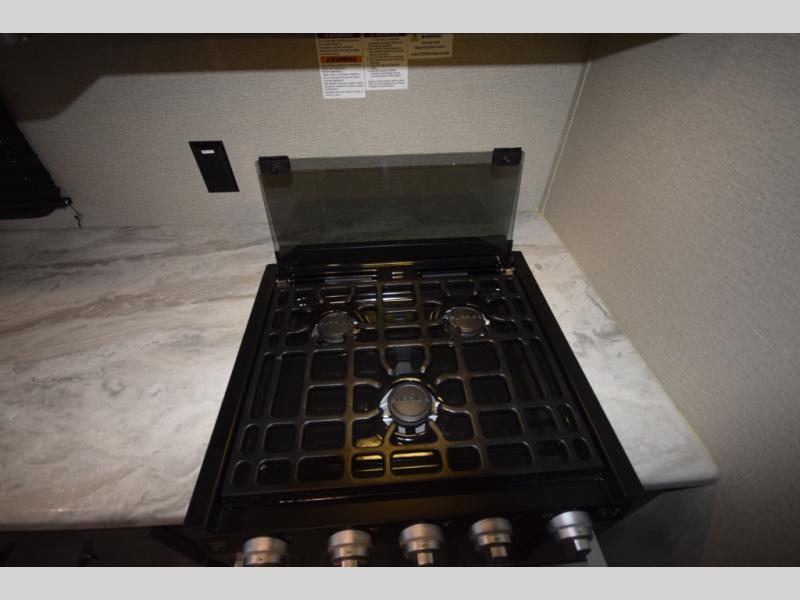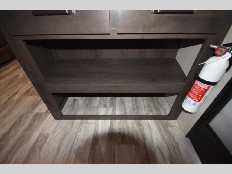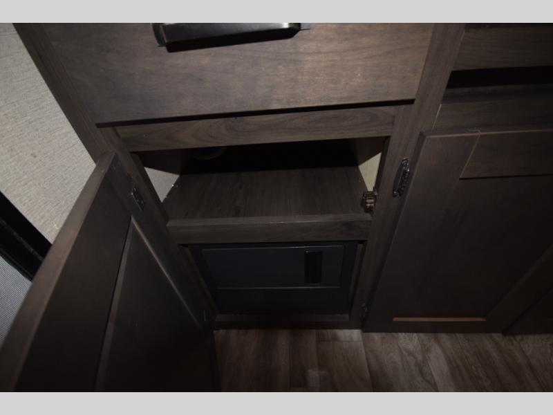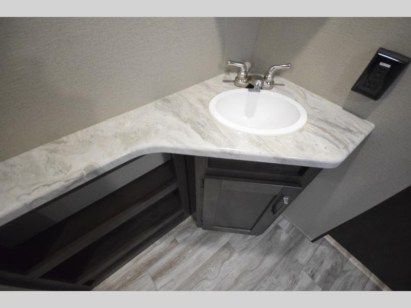 Setting up camp is a breeze with a power tongue jack, all-in-one utility center, and detachable LED power cord. Inside, you’ll love the residential-style furniture, solid bedroom door, and sleek countertops that bring a touch of home to every adventure. Stay connected and entertained with multiple outlets, USB charging ports, and an AM/FM/Bluetooth stereo with exterior speakers.