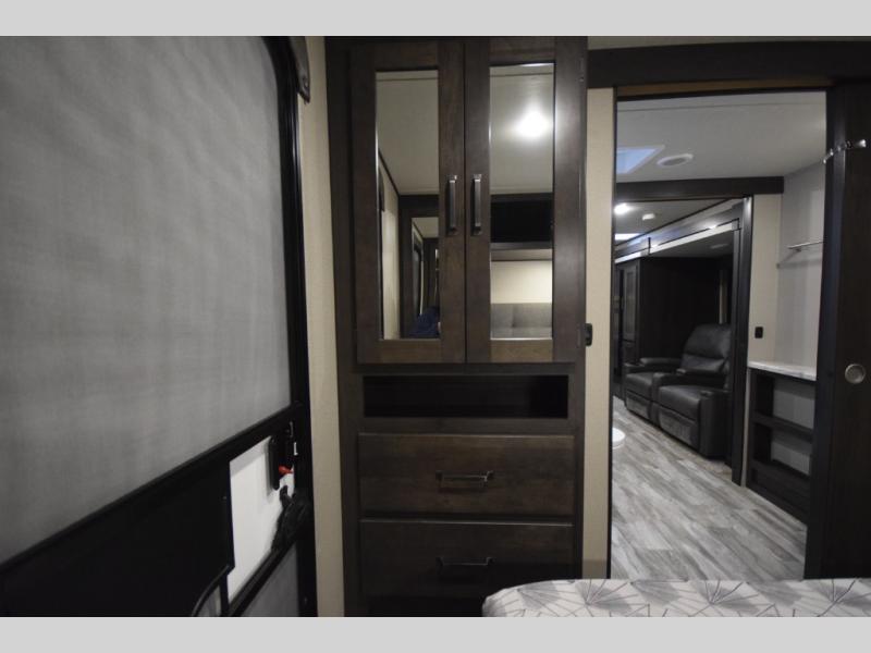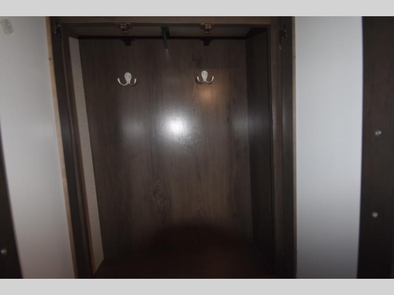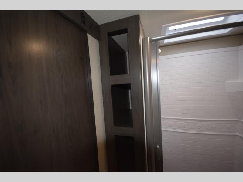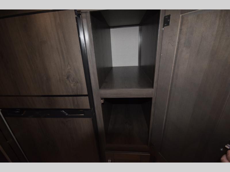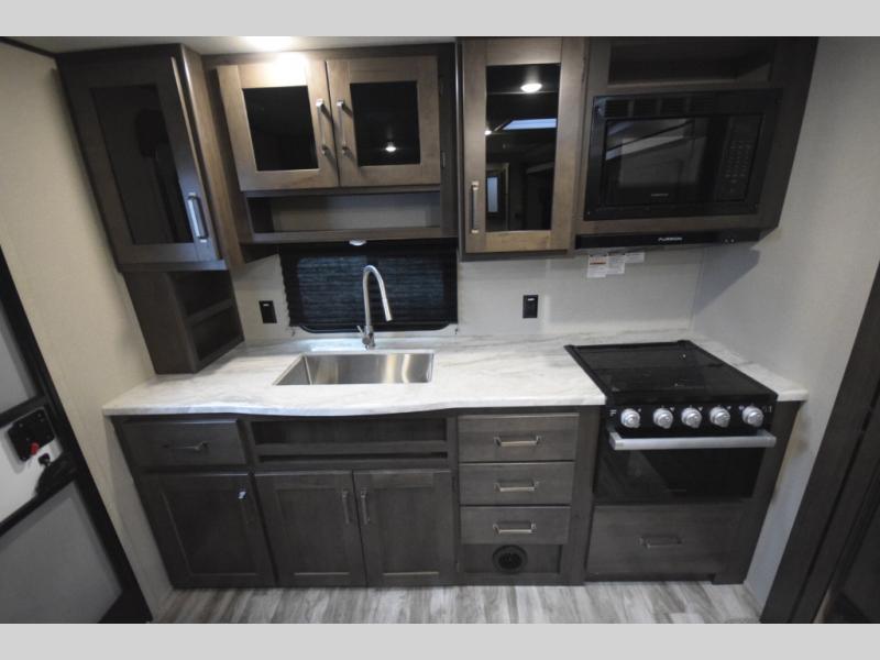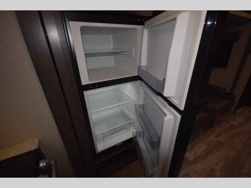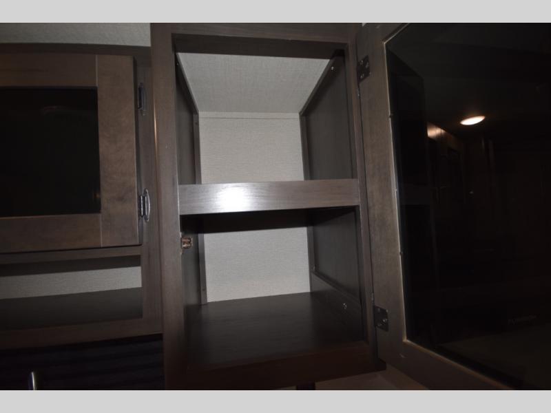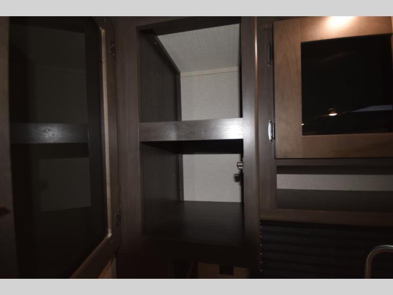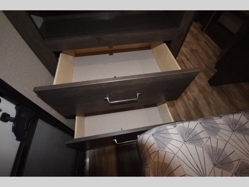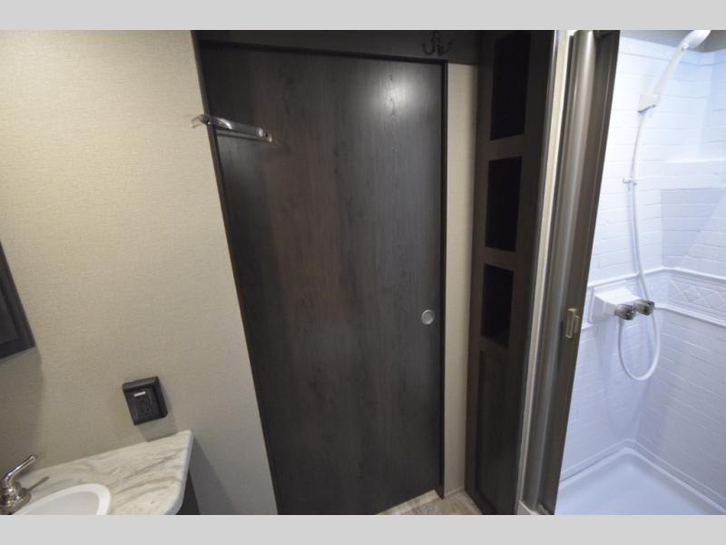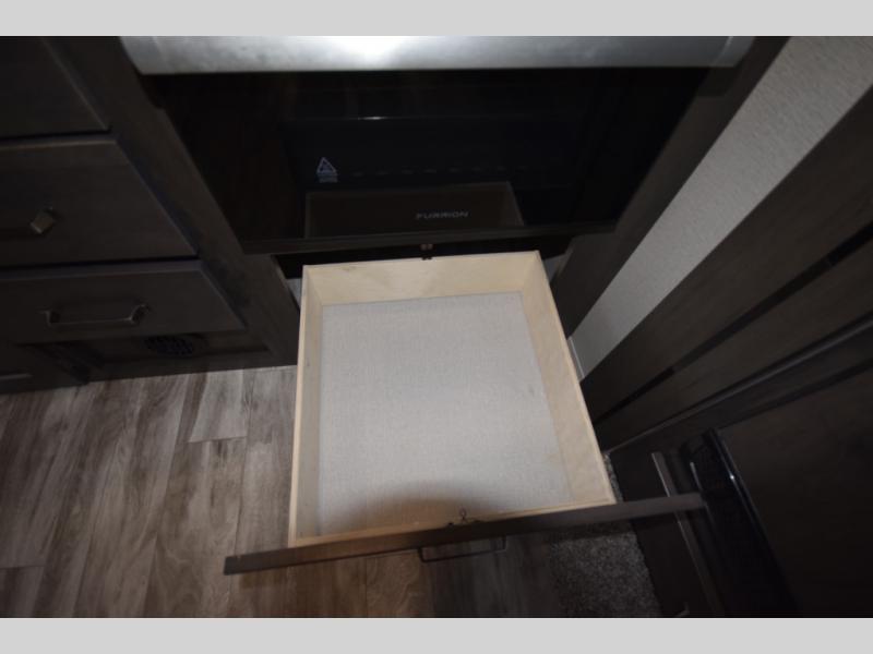 Setting up camp is a breeze with a power tongue jack, all-in-one utility center, and detachable LED power cord. Inside, you’ll love the residential-style furniture, solid bedroom door, and sleek countertops that bring a touch of home to every adventure. Stay connected and entertained with multiple outlets, USB charging ports, and an AM/FM/Bluetooth stereo with exterior speakers.