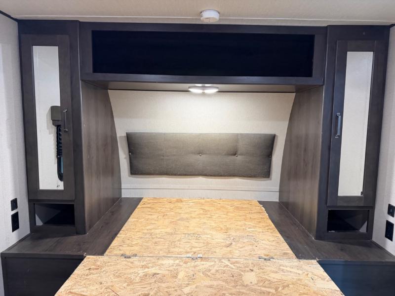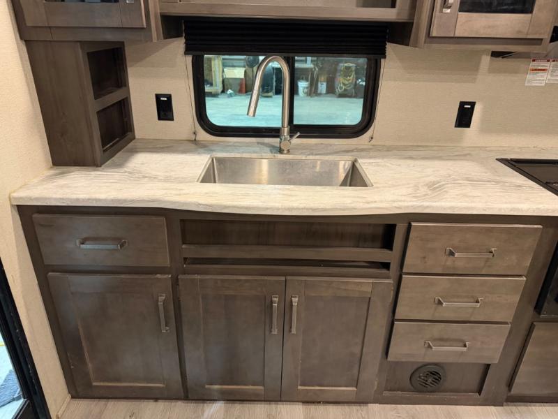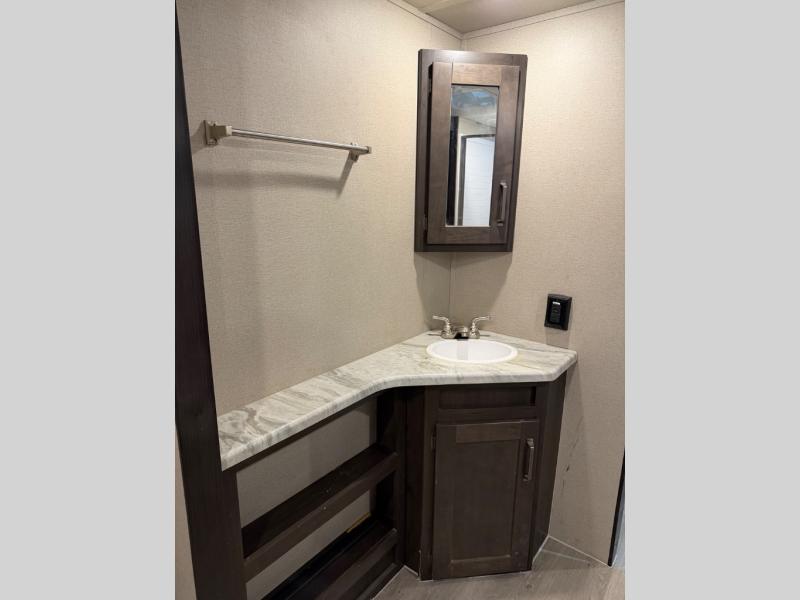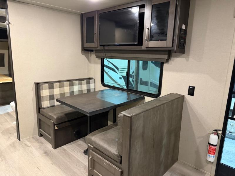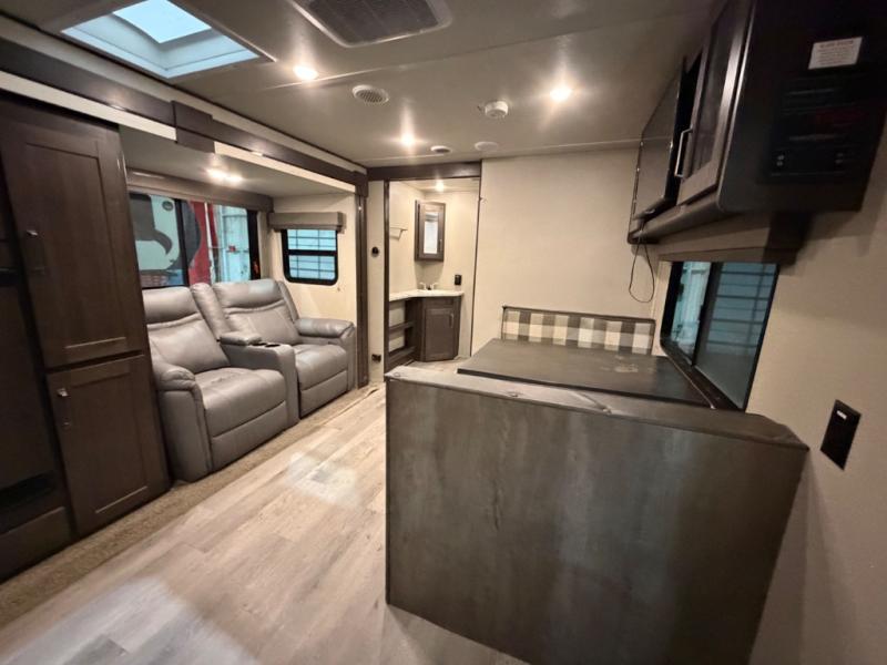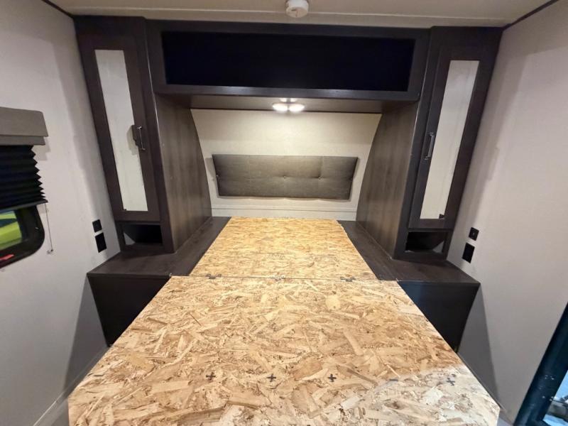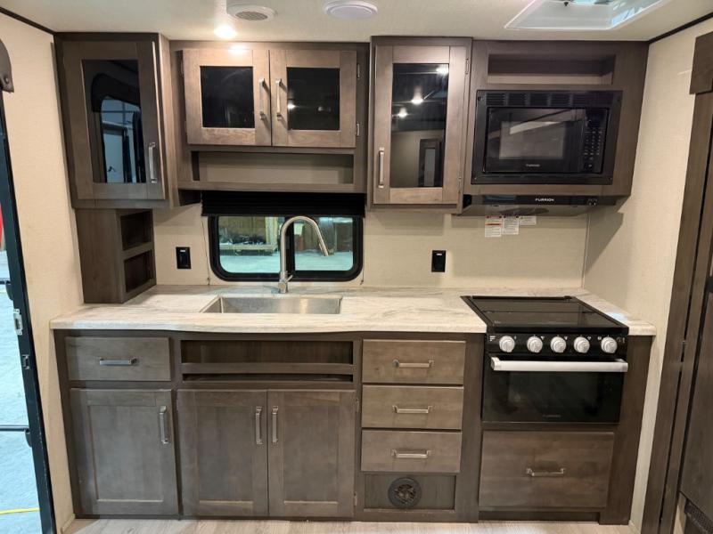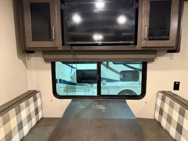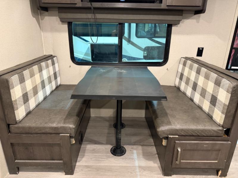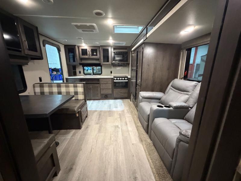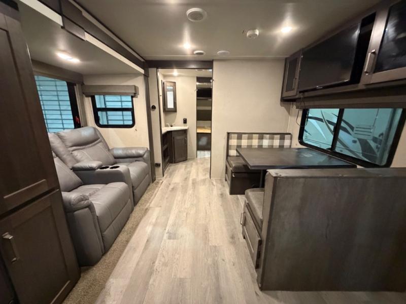 This couple's trailer is perfect for all your outdoor excursions. When you aren't relaxing with a cold drink under the 20' power awning, you may find yourself cooking in the rear kitchen or relaxing on the 62" theater seating. There is a booth dinette perfect for a guest or two little ones to sleep on, plus there is a walk-through bath that is conveniently located for everyone. You'll get a great night's rest on the queen bed in the front master bedroom, plus you have your own exterior entry door so that you can sneak out early to get some fishing done!