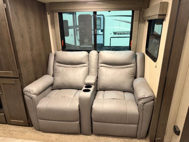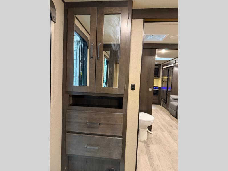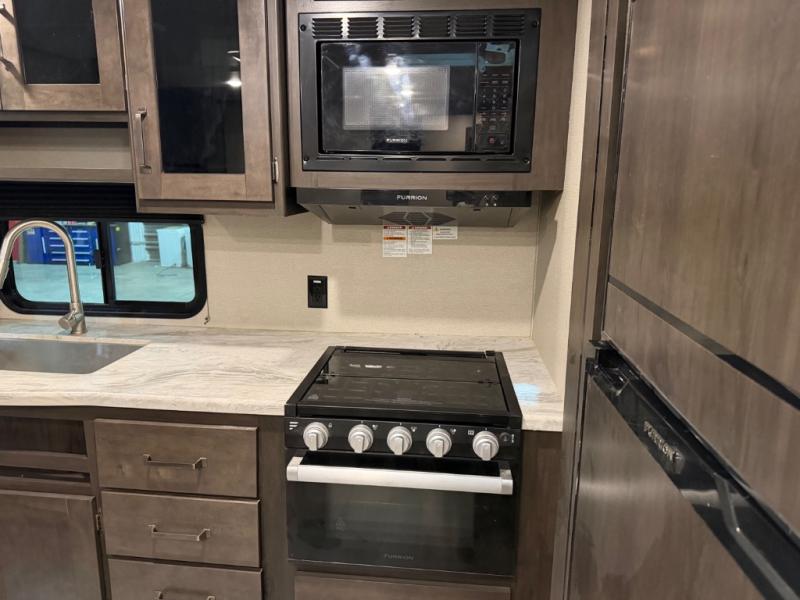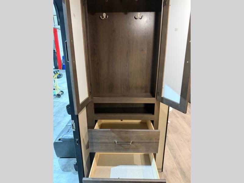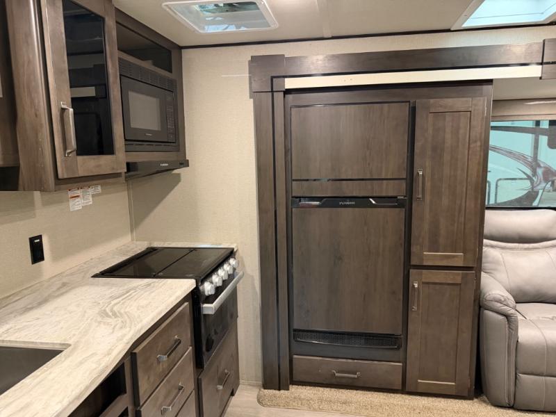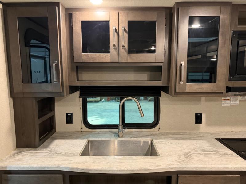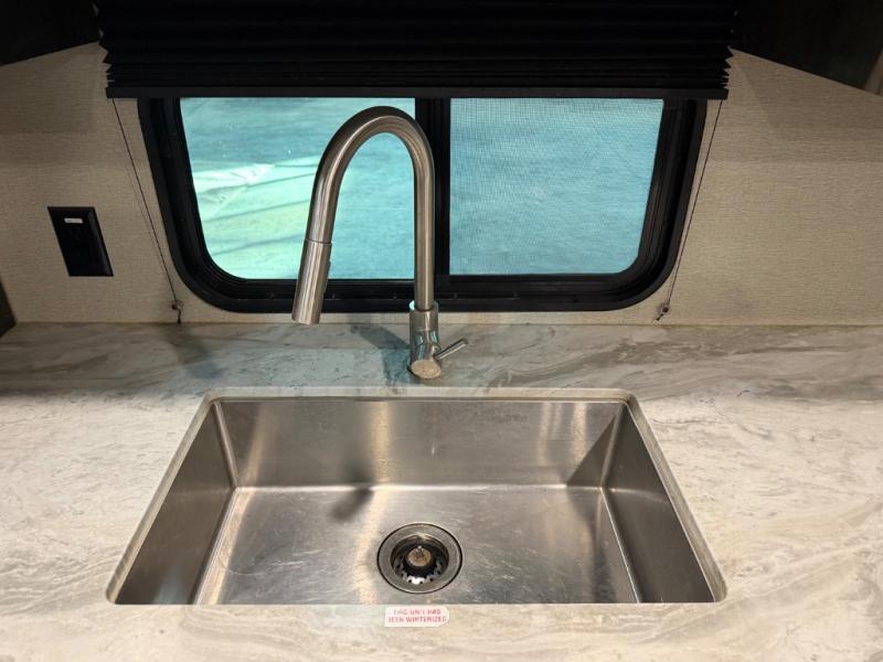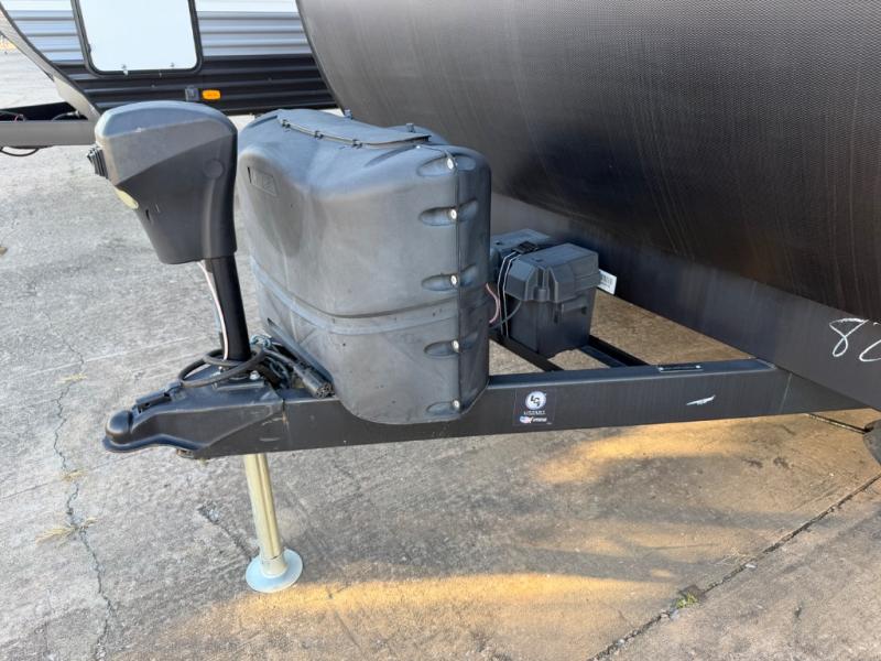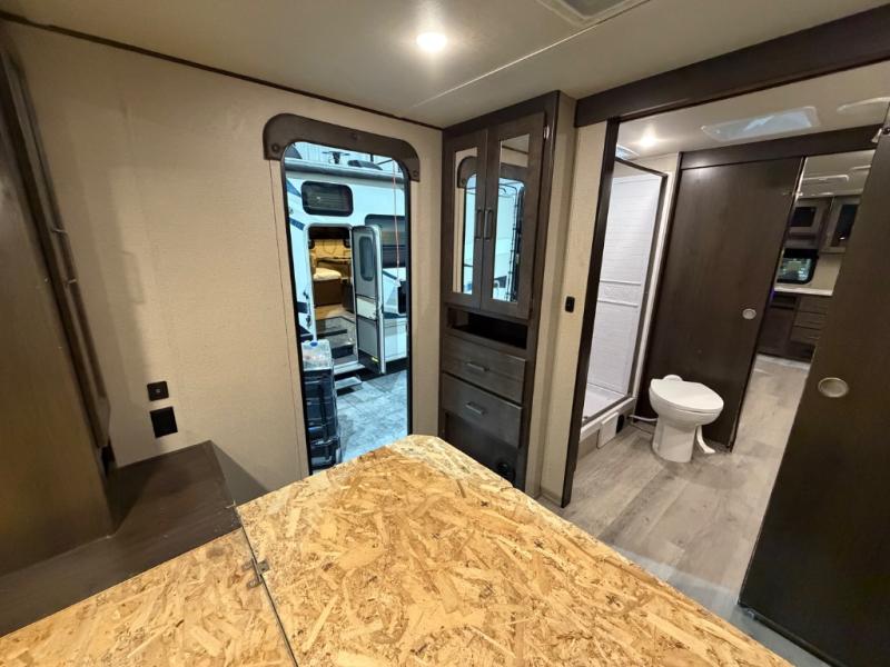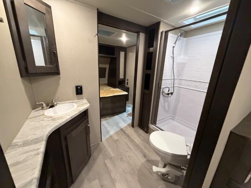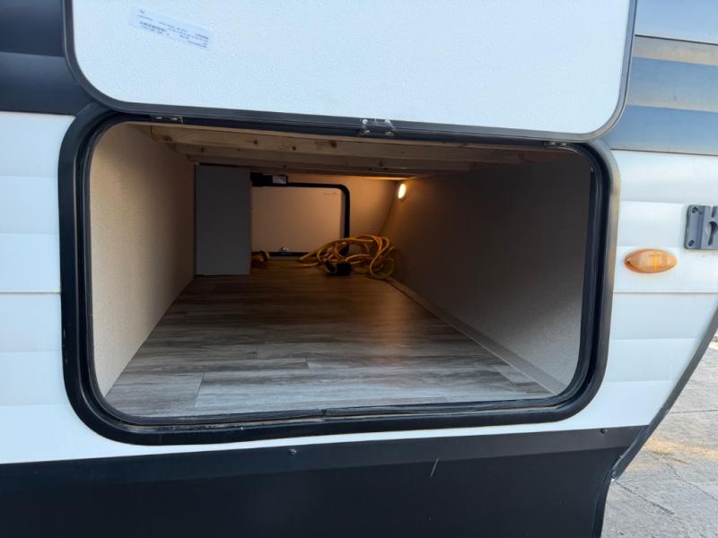 This couple's trailer is perfect for all your outdoor excursions. When you aren't relaxing with a cold drink under the 20' power awning, you may find yourself cooking in the rear kitchen or relaxing on the 62" theater seating. There is a booth dinette perfect for a guest or two little ones to sleep on, plus there is a walk-through bath that is conveniently located for everyone. You'll get a great night's rest on the queen bed in the front master bedroom, plus you have your own exterior entry door so that you can sneak out early to get some fishing done!