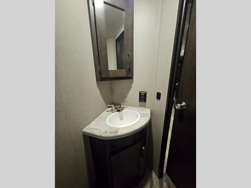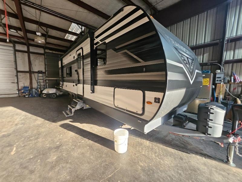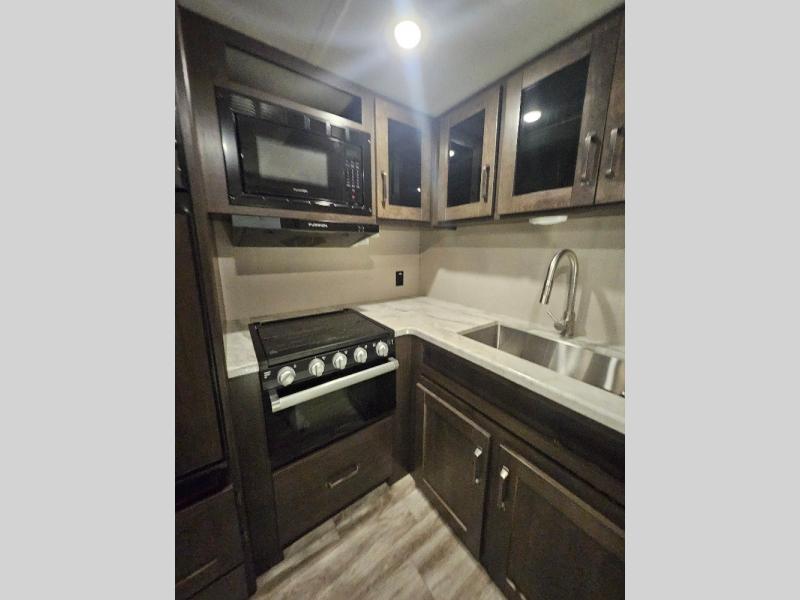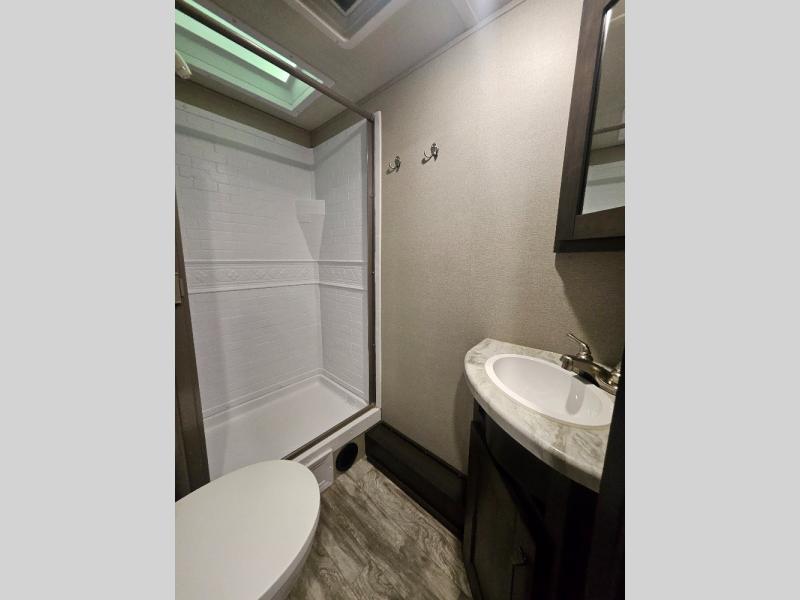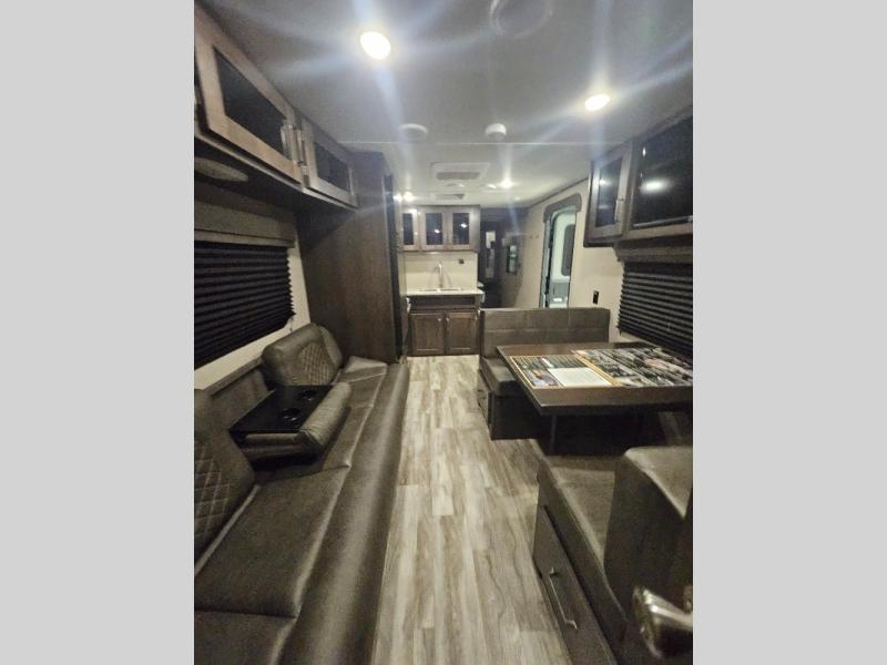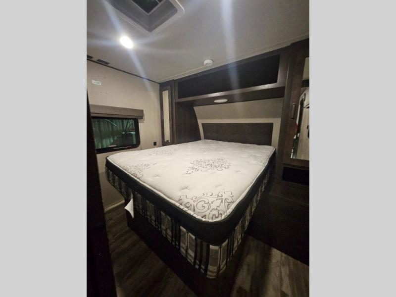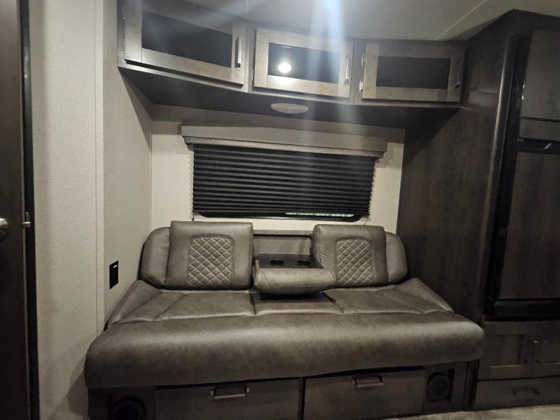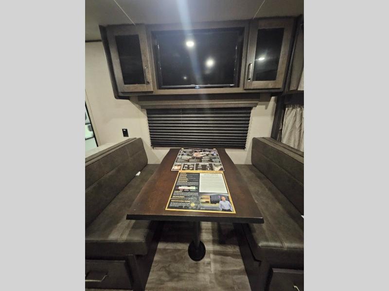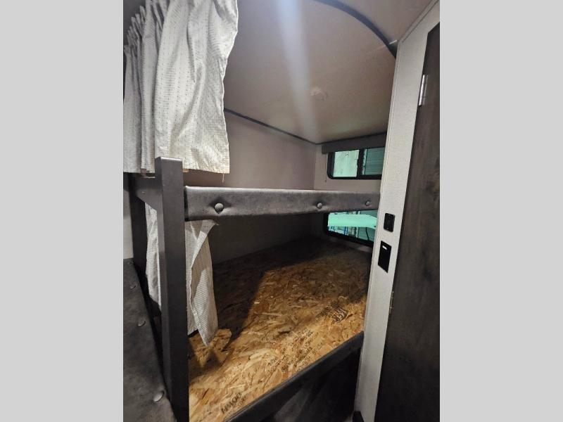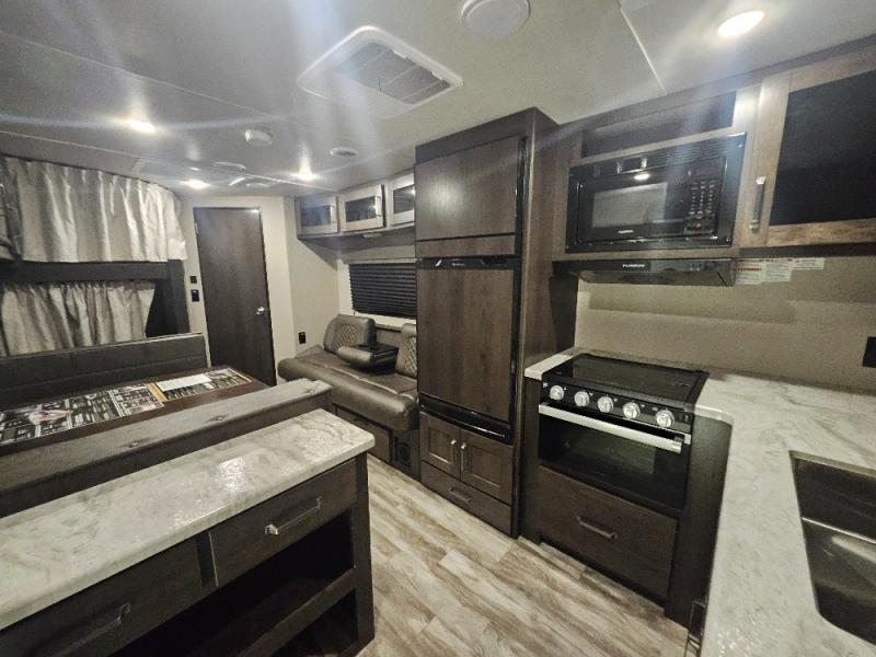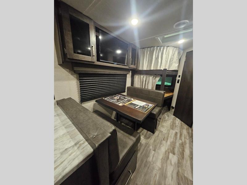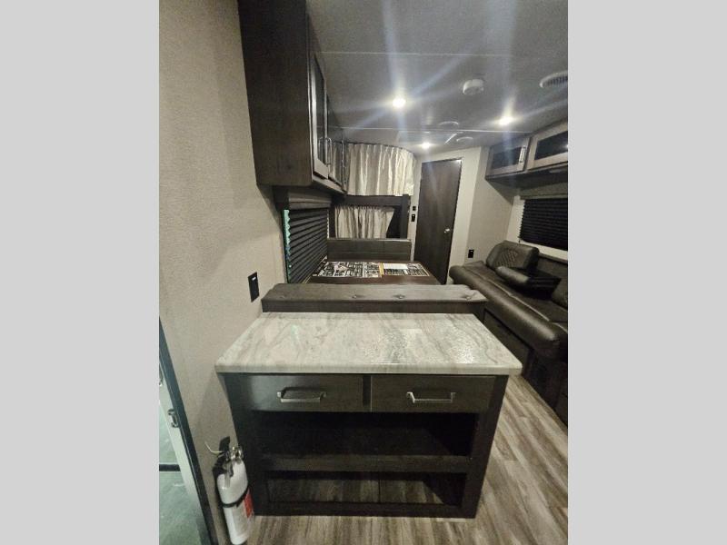 If you've been looking for a trailer with more sleeping space for your family or crew, check out this model that can sleep nine people each night! There are double-size bunks in the back next to the full bath, and the under-bed storage will be perfect for luggage and camp gear. While the chef is preparing dinner on the three-burner cooktop, everyone can visit on the booth dinette and roll-over sofa. If the weather is nice, you may just find yourselves under the 15' power awning planning out your next day's adventures. This model also includes front private bedroom with a queen bed and overhead storage for books!
