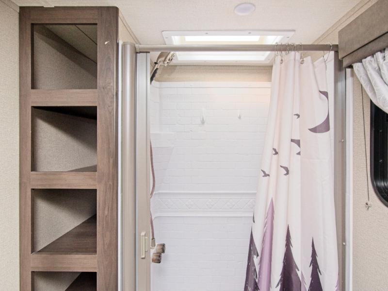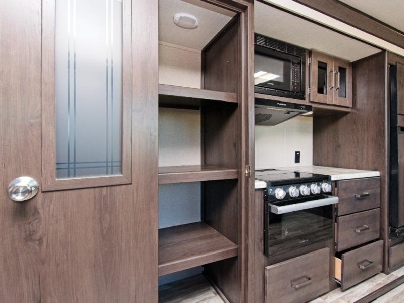 Inside the kitchen, enjoy ample counter space and smart storage solutions that make prepping and cooking meals simple and enjoyable. Whether you’re weekend camping or full-time traveling, this trailer is designed to feel like home.