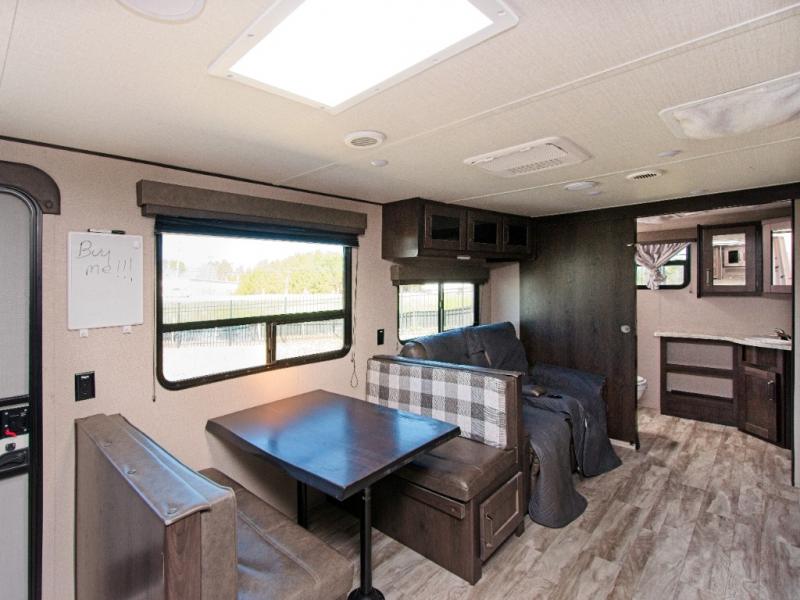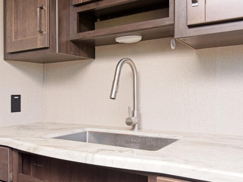 Entertainment and convenience come standard with multiple interior outlets, built-in USB ports, and an AM/FM/Bluetooth stereo system with exterior speakers. Inside, premium touches like residential furniture, a solid bedroom door, and residential-style countertops elevate your travel experience.