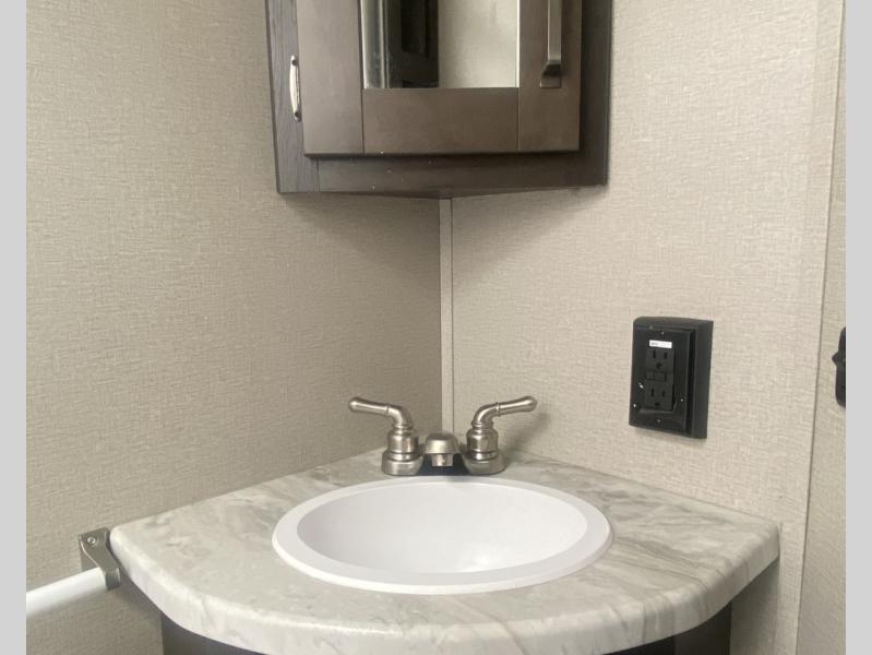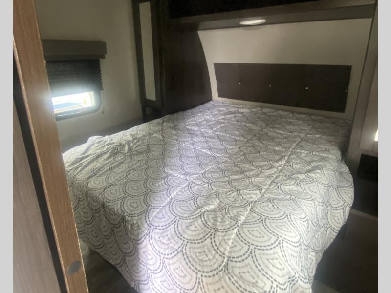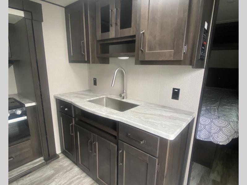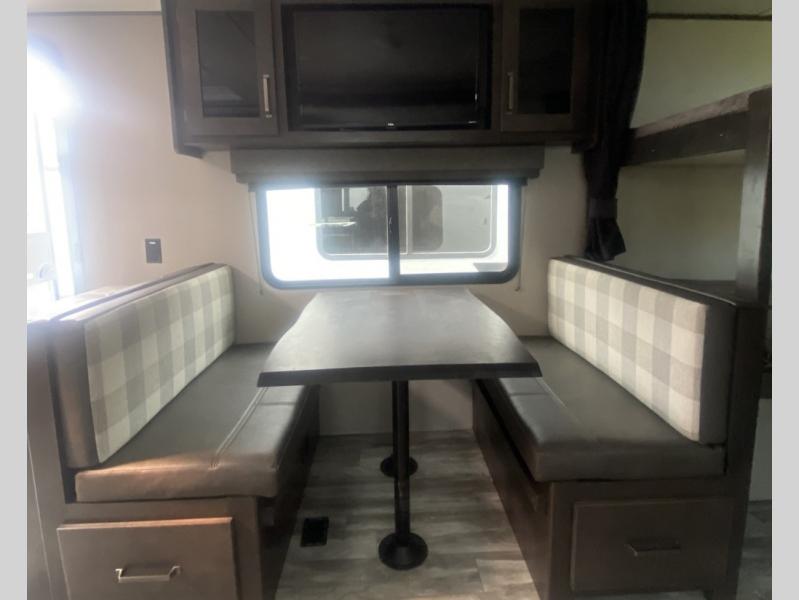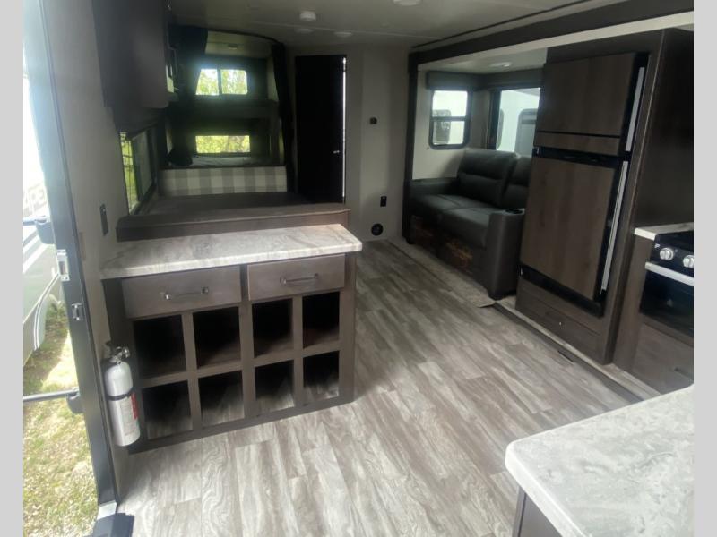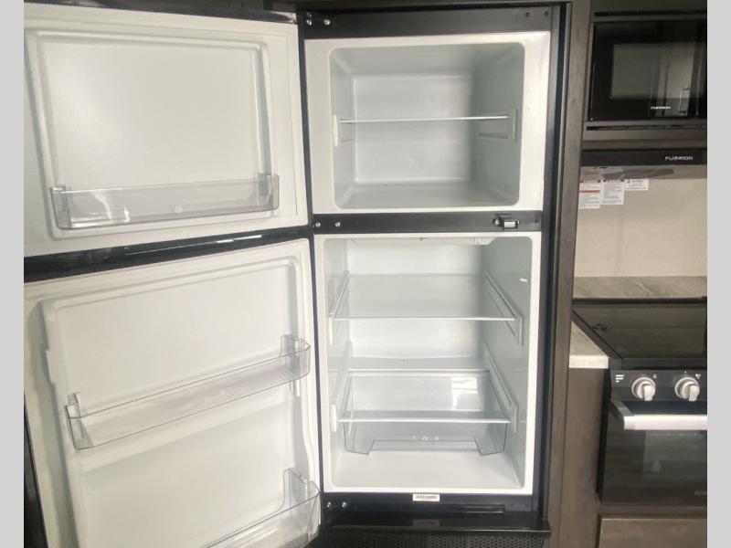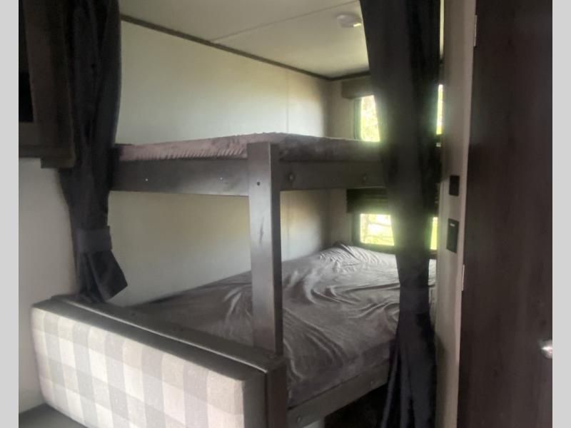 Camping with friends or family is easier than ever in this spacious travel trailer. You can easily sleep nine with the double-size bunks, the tri-fold sofa, and the queen bed in the front private bedroom. The booth dinette can even be used to sleep a guest or two little ones. Prepare your meals on the three-burner cooktop indoors or on the two-burner cooktop at the outside kitchen! You'll also find an exterior spray port, a drawer to store utensils, and a 1.6-cu. ft. outdoor refrigerator for drinks! It will be so easy to fill the dog's food bowl with the added pet drawer under the refrigerator, and the full bath in this model means you don't have to use the camp's facilities.