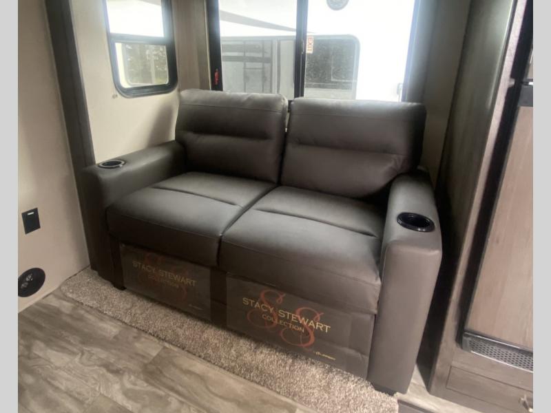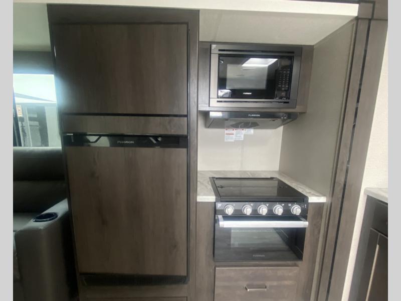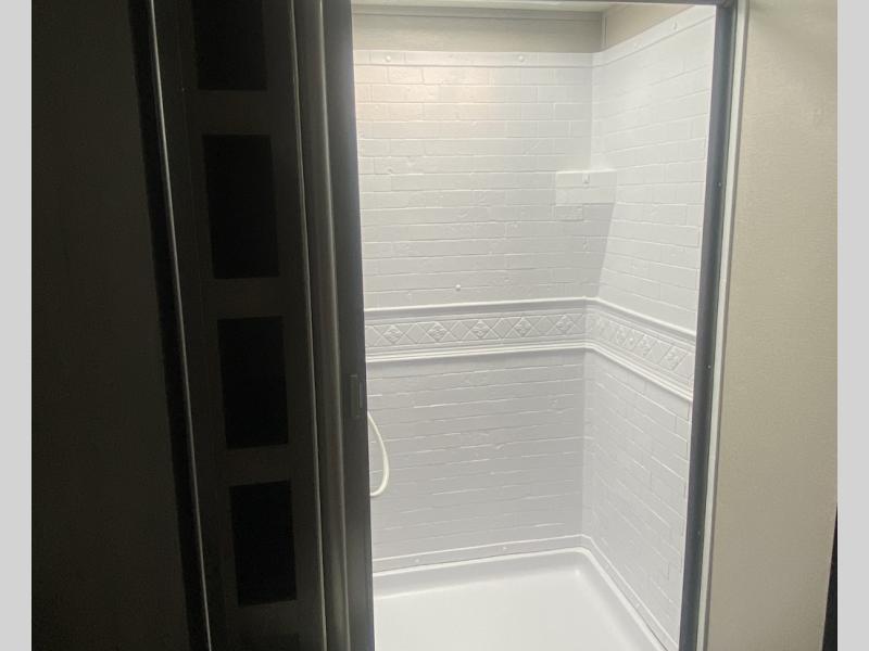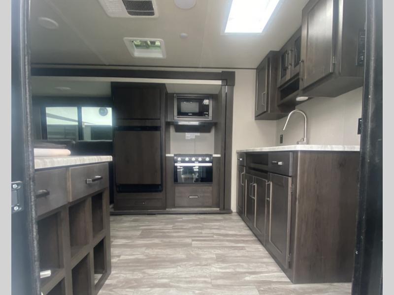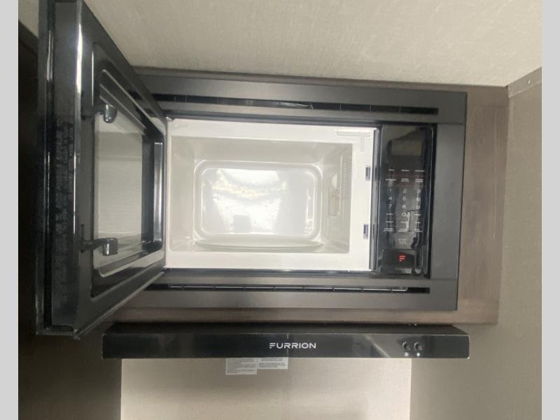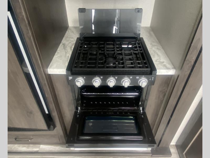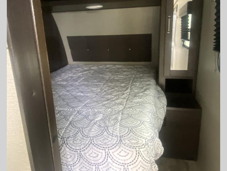 Camping with friends or family is easier than ever in this spacious travel trailer. You can easily sleep nine with the double-size bunks, the tri-fold sofa, and the queen bed in the front private bedroom. The booth dinette can even be used to sleep a guest or two little ones. Prepare your meals on the three-burner cooktop indoors or on the two-burner cooktop at the outside kitchen! You'll also find an exterior spray port, a drawer to store utensils, and a 1.6-cu. ft. outdoor refrigerator for drinks! It will be so easy to fill the dog's food bowl with the added pet drawer under the refrigerator, and the full bath in this model means you don't have to use the camp's facilities.