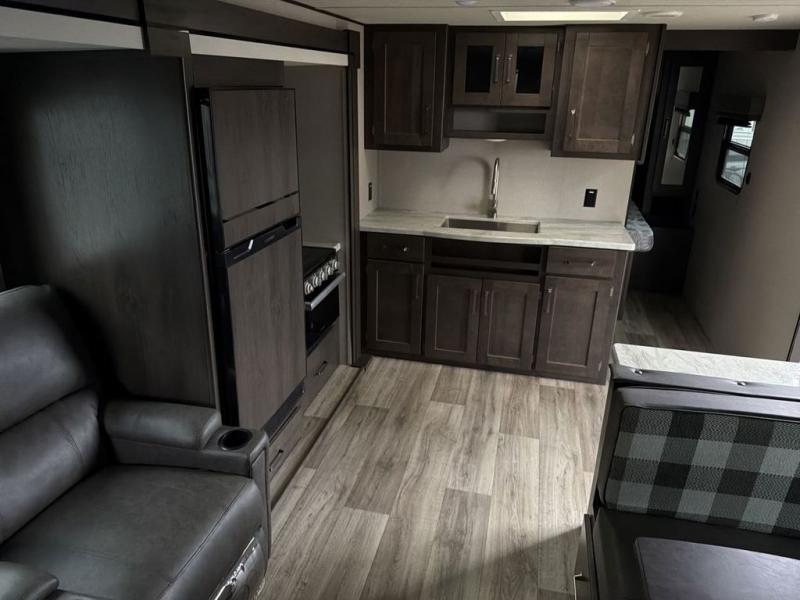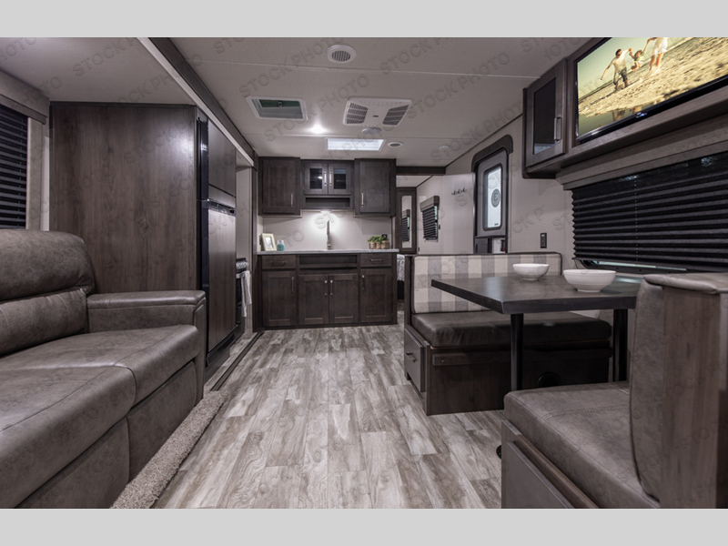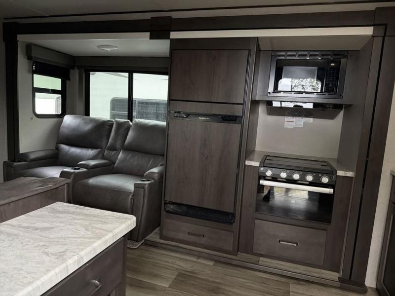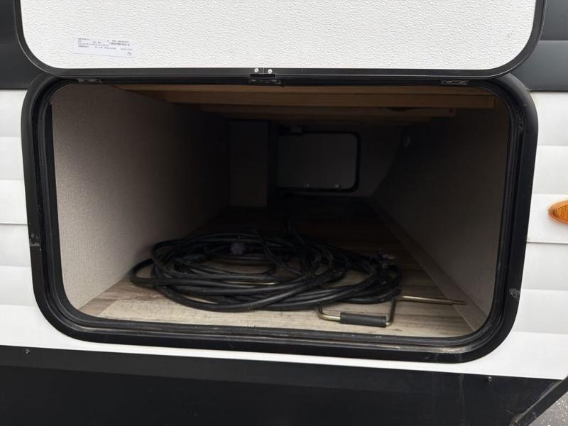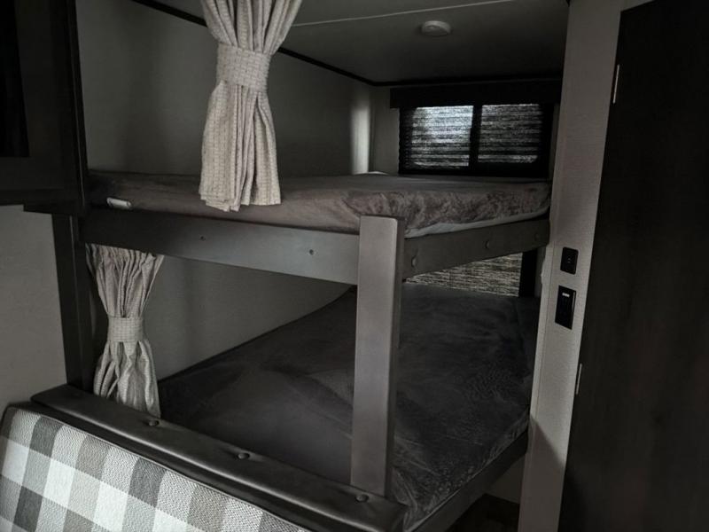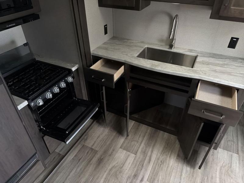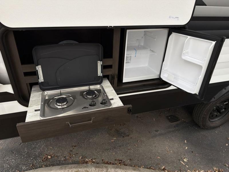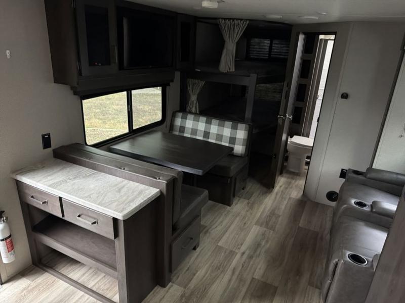 Camping with friends or family is easier than ever in this spacious travel trailer. You can easily sleep nine with the double-size bunks, the tri-fold sofa, and the queen bed in the front private bedroom. The booth dinette can even be used to sleep a guest or two little ones. Prepare your meals on the three-burner cooktop indoors or on the two-burner cooktop at the outside kitchen! You'll also find an exterior spray port, a drawer to store utensils, and a 1.6-cu. ft. outdoor refrigerator for drinks! It will be so easy to fill the dog's food bowl with the added pet drawer under the refrigerator, and the full bath in this model means you don't have to use the camp's facilities.