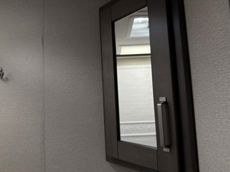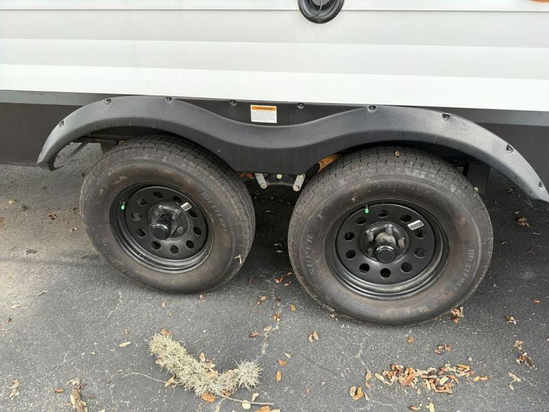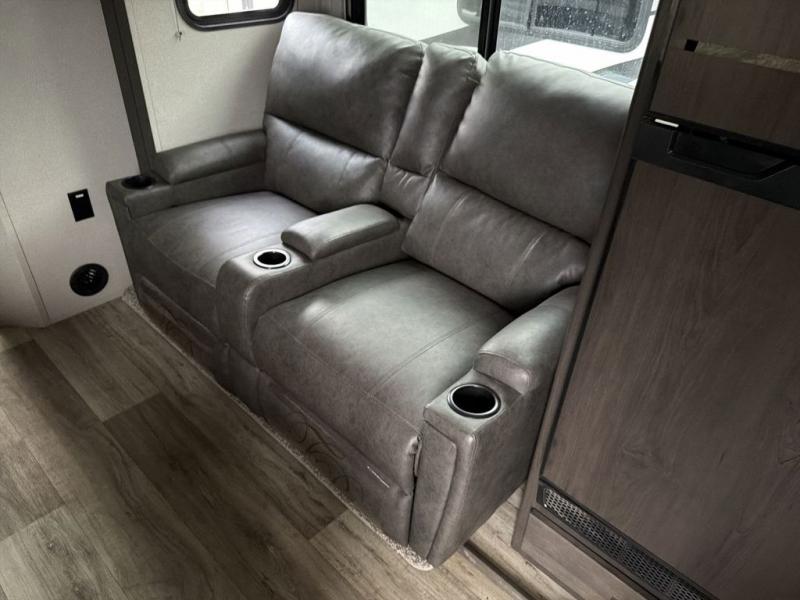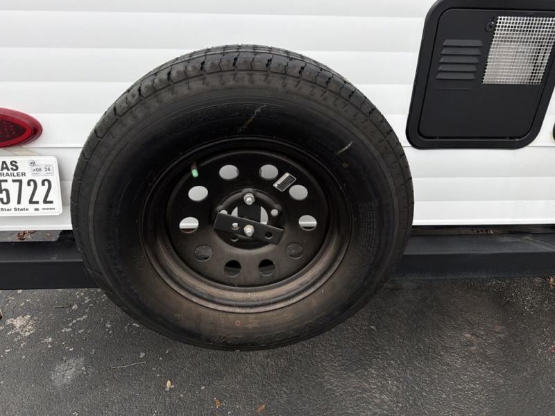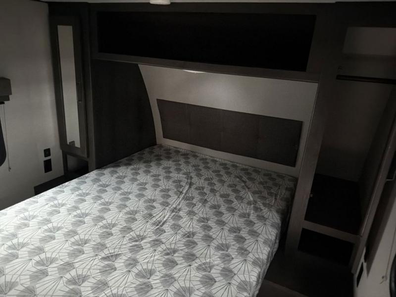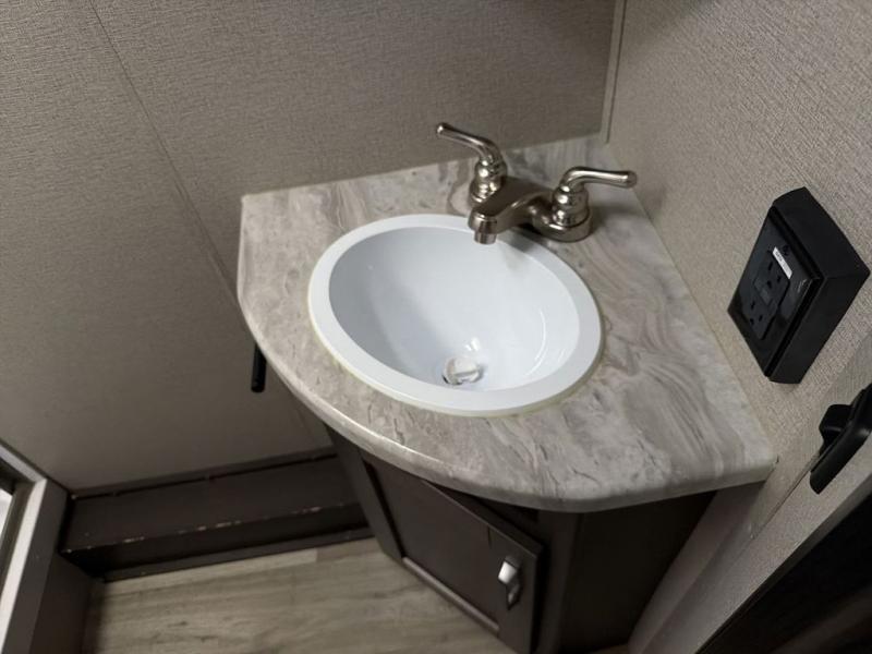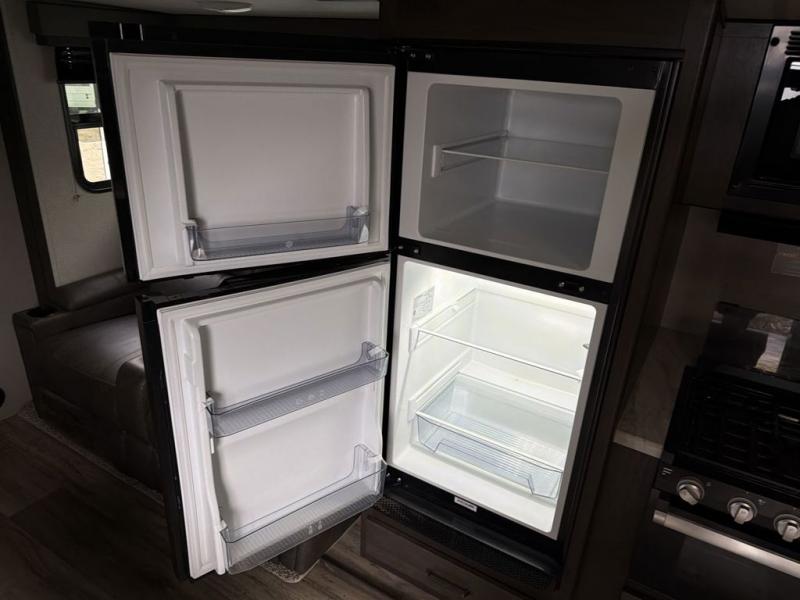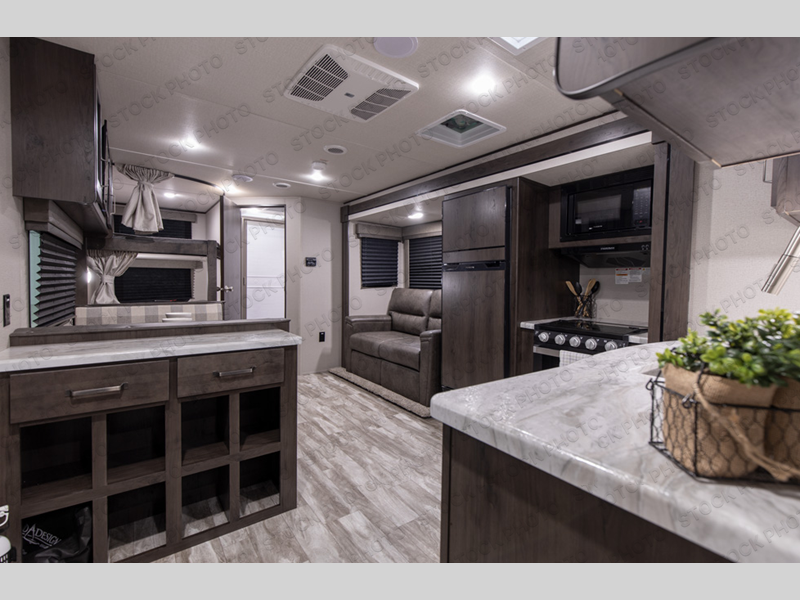 Camping with friends or family is easier than ever in this spacious travel trailer. You can easily sleep nine with the double-size bunks, the tri-fold sofa, and the queen bed in the front private bedroom. The booth dinette can even be used to sleep a guest or two little ones. Prepare your meals on the three-burner cooktop indoors or on the two-burner cooktop at the outside kitchen! You'll also find an exterior spray port, a drawer to store utensils, and a 1.6-cu. ft. outdoor refrigerator for drinks! It will be so easy to fill the dog's food bowl with the added pet drawer under the refrigerator, and the full bath in this model means you don't have to use the camp's facilities.