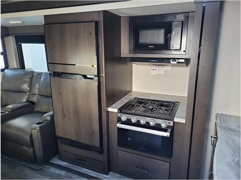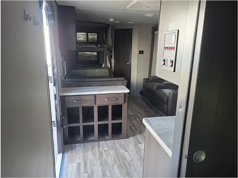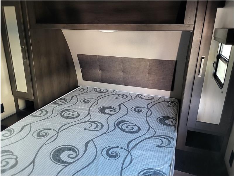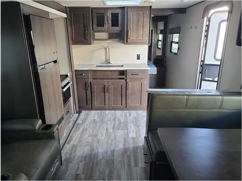 Camping with friends or family is easier than ever in this spacious travel trailer. You can easily sleep nine with the double-size bunks, the tri-fold sofa, and the queen bed in the front private bedroom. The booth dinette can even be used to sleep a guest or two little ones. Prepare your meals on the three-burner cooktop indoors or on the two-burner cooktop at the outside kitchen! You'll also find an exterior spray port, a drawer to store utensils, and a 1.6-cu. ft. outdoor refrigerator for drinks! It will be so easy to fill the dog's food bowl with the added pet drawer under the refrigerator, and the full bath in this model means you don't have to use the camp's facilities.
