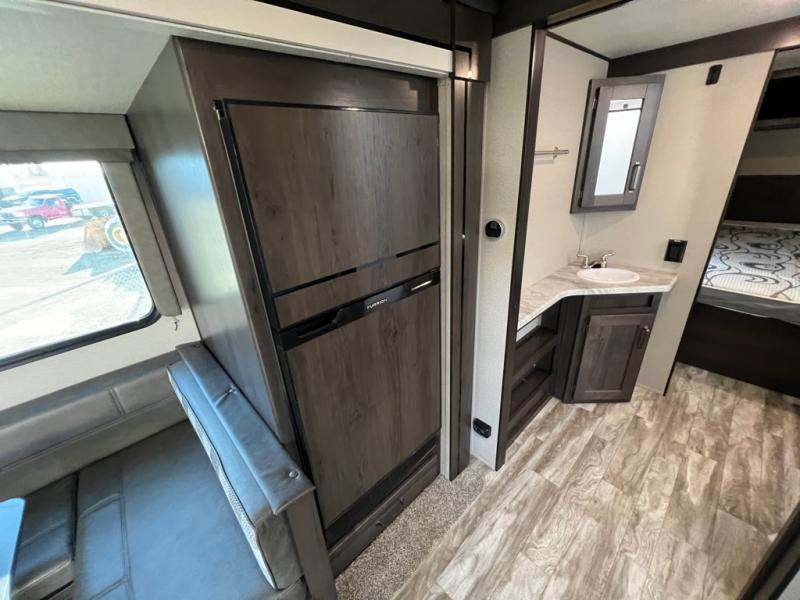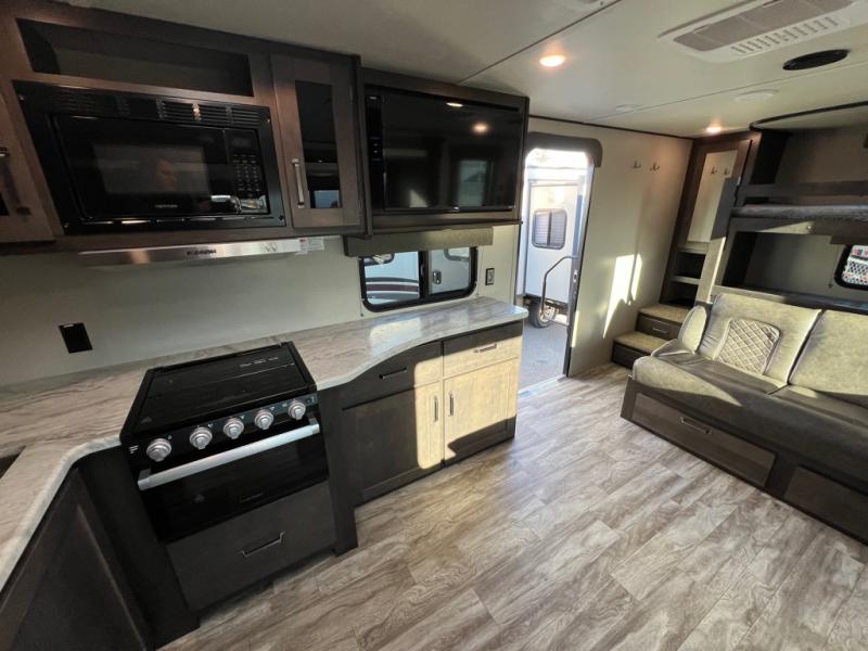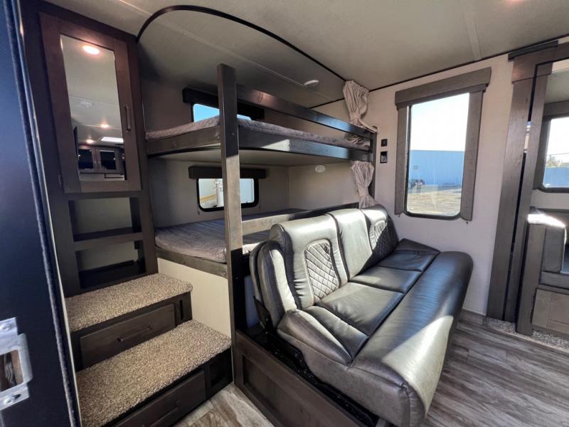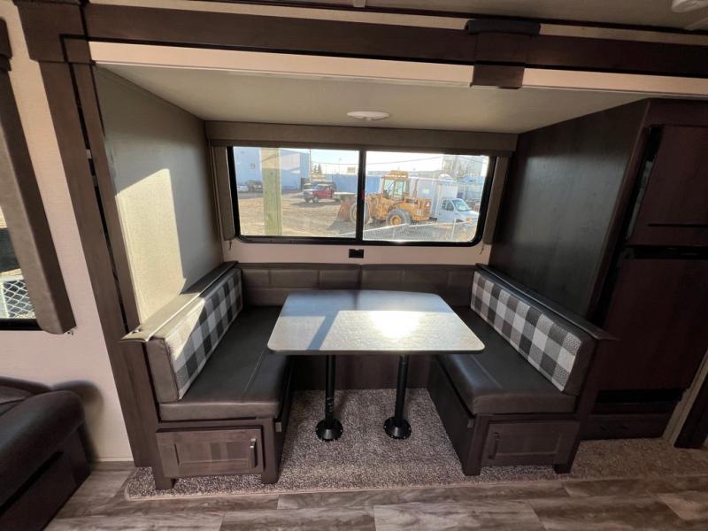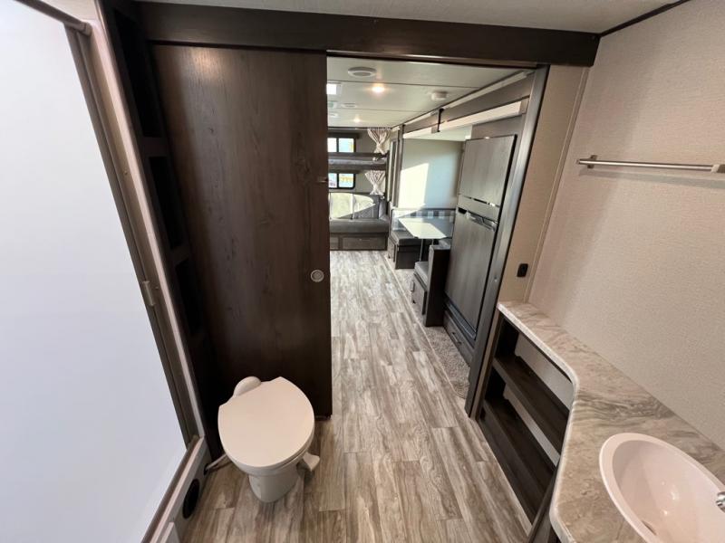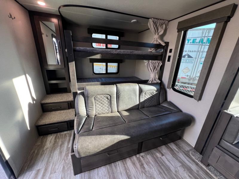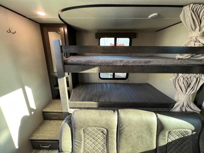 Are you ready to camp in comfort with your family or friends? This travel trailer allows you to do just that! There are double-size bunks in the back with two steps that have storage for books or board games. There is also a closet here to keep clothes wrinkle-free. The U-shaped dinette within the slide out can be switched out for the optional theatre seats, and the jackknife sofa will be the perfect spot to visit with your crew. This model features a walk-through bath that leads to the front master bedroom. You'll love the queen bed here, overhead storage, and your own exterior entry door for convenience.