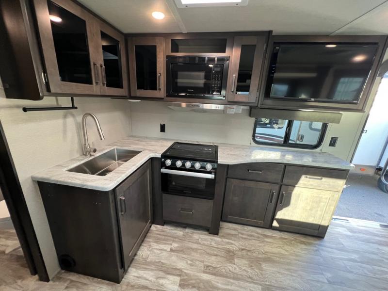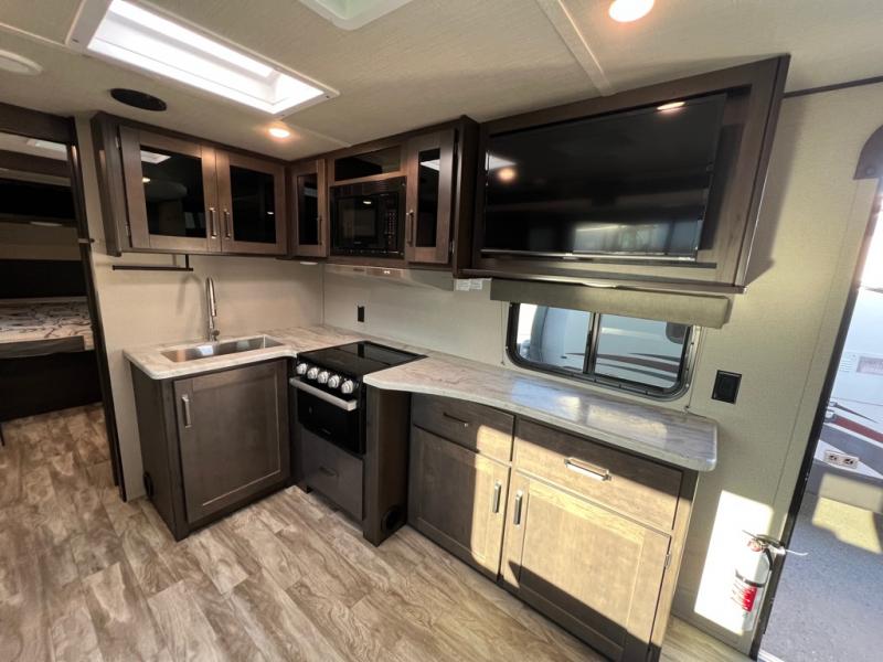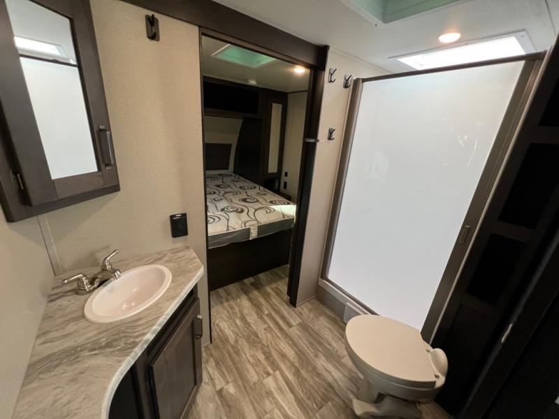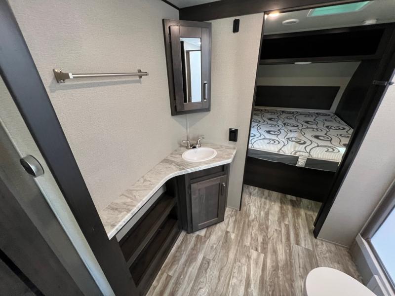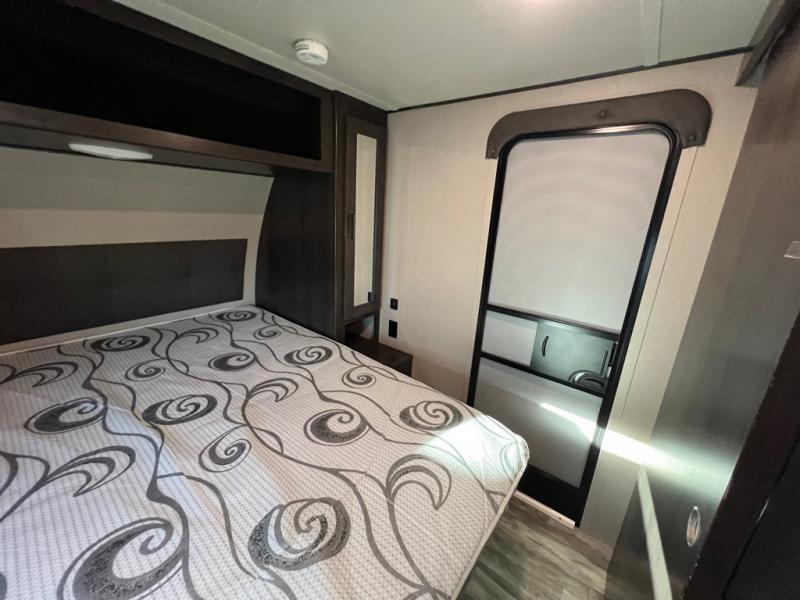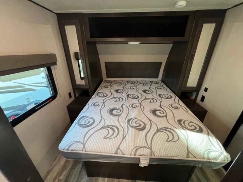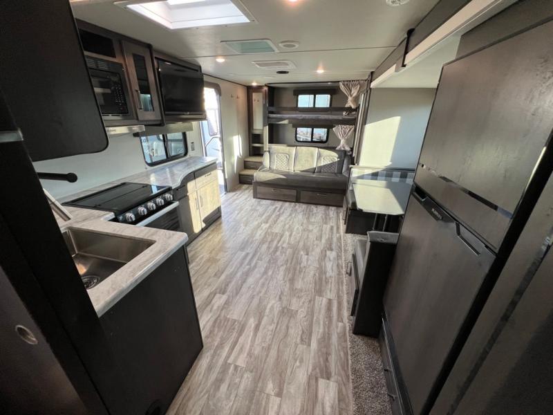 Are you ready to camp in comfort with your family or friends? This travel trailer allows you to do just that! There are double-size bunks in the back with two steps that have storage for books or board games. There is also a closet here to keep clothes wrinkle-free. The U-shaped dinette within the slide out can be switched out for the optional theatre seats, and the jackknife sofa will be the perfect spot to visit with your crew. This model features a walk-through bath that leads to the front master bedroom. You'll love the queen bed here, overhead storage, and your own exterior entry door for convenience.