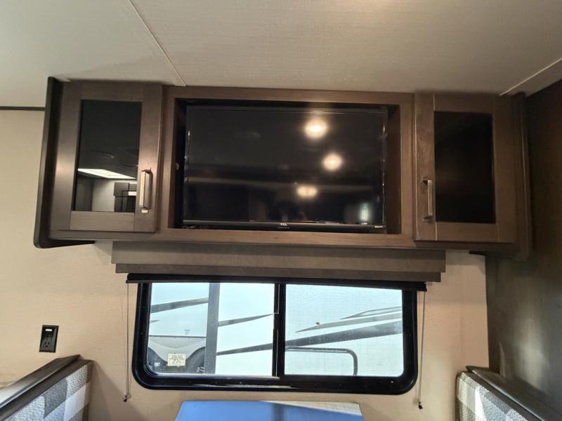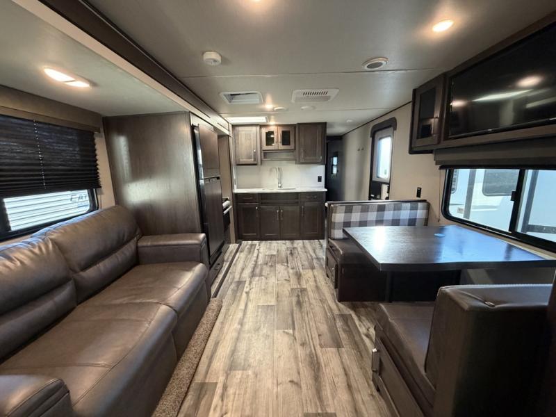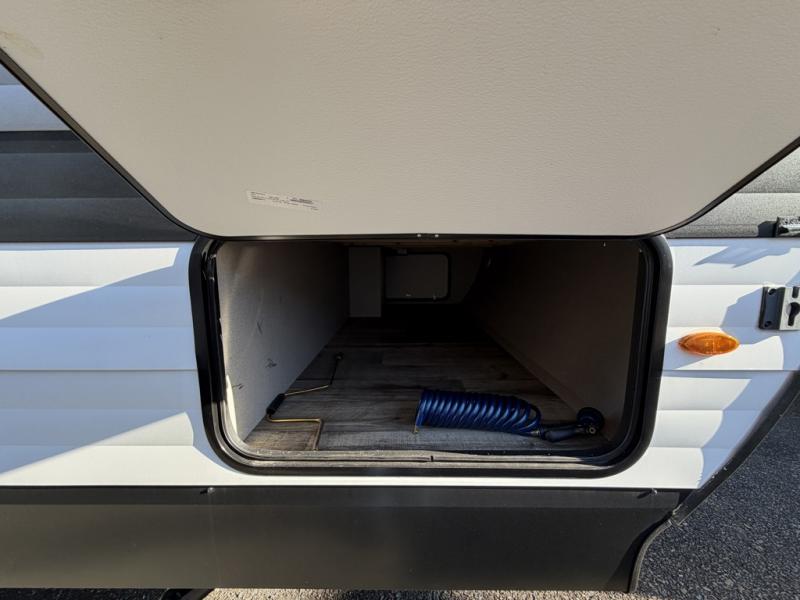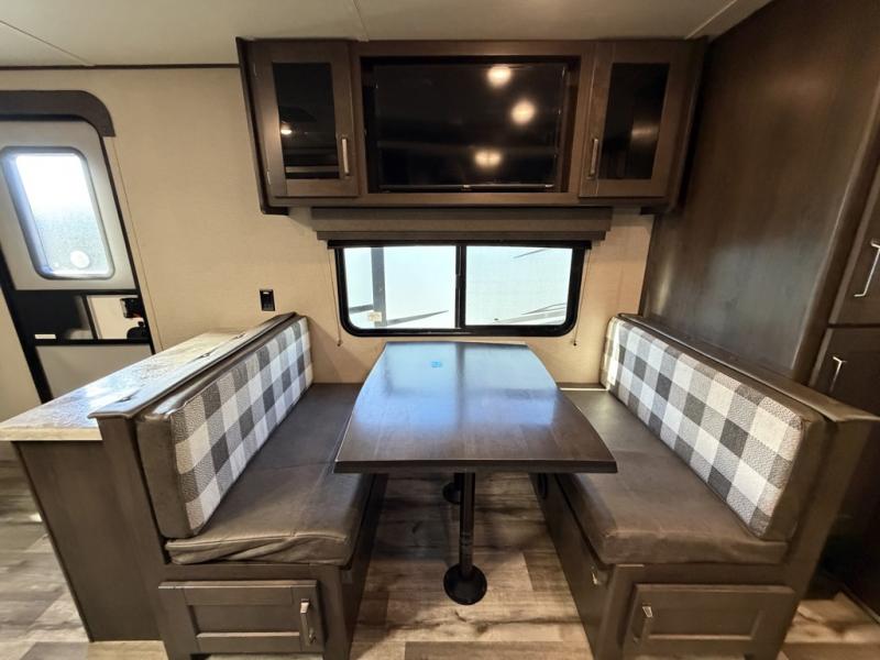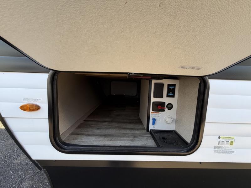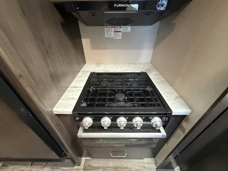 A rear private bunkhouse plus a front private bedroom make this the perfect family-friendly trailer. There are two bunks, a residential full bed, plus three dressers to store clothes in the bunkhouse. The 42" x 22" rear storage will be great for hiking gear or extra lawn chairs, and you'll find tons of interior storage throughout for all your belongings. Head to the main living area to relax on the tri-fold sofa or booth dinette, or you may just want to visit with the cook outside as they use the outdoor kitchen! There is an LP quick connect, an exterior spray port, a two-burner cooktop, plus a 1.6-cu. ft. exterior refrigerator. Now that's a convenient outdoor kitchen!