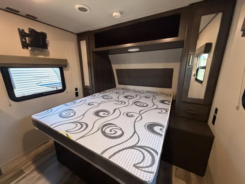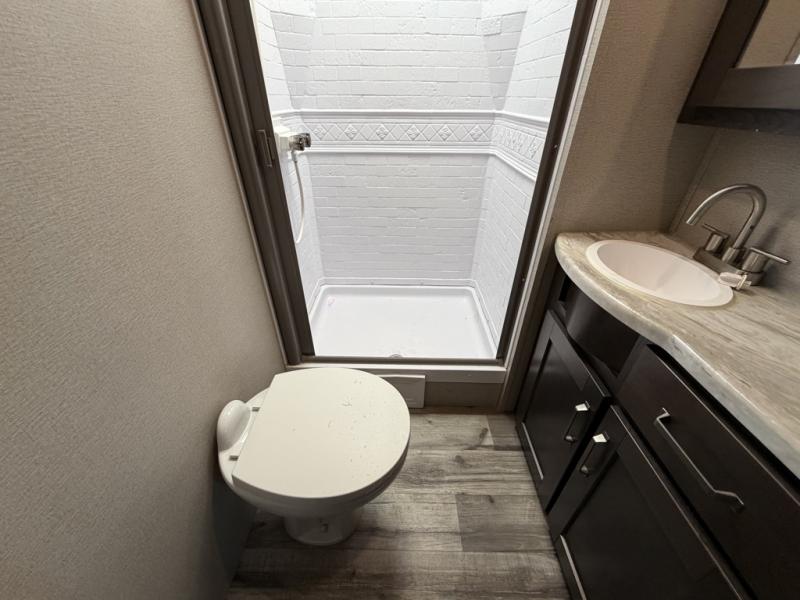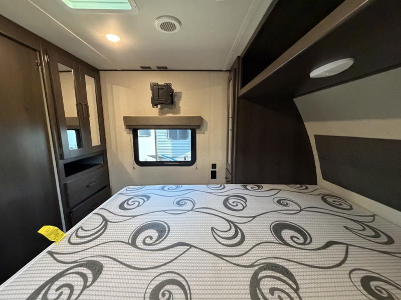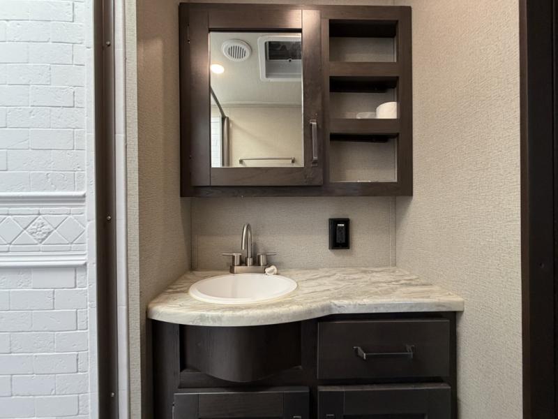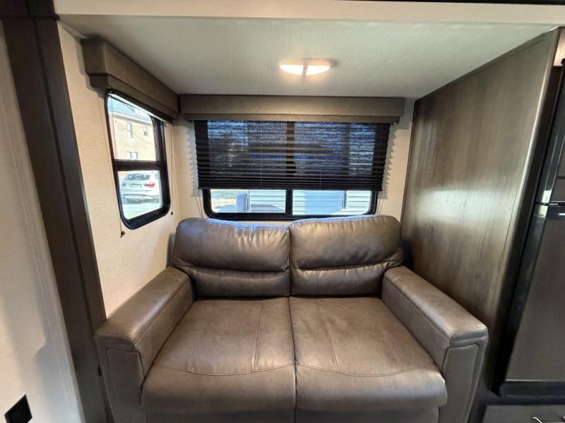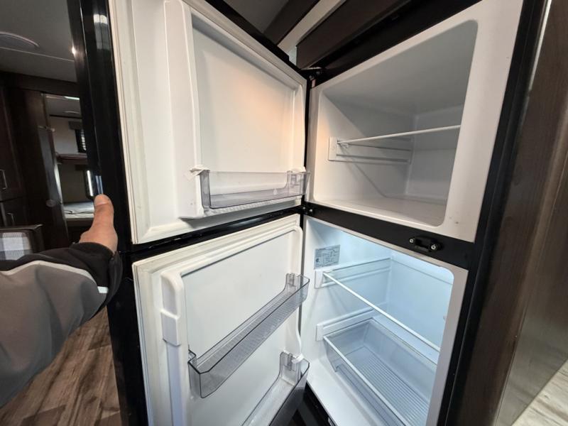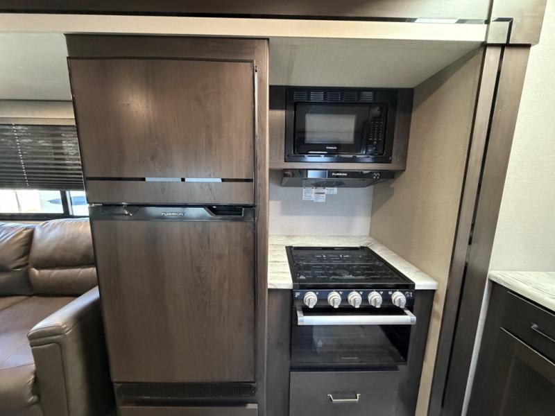 A rear private bunkhouse plus a front private bedroom make this the perfect family-friendly trailer. There are two bunks, a residential full bed, plus three dressers to store clothes in the bunkhouse. The 42" x 22" rear storage will be great for hiking gear or extra lawn chairs, and you'll find tons of interior storage throughout for all your belongings. Head to the main living area to relax on the tri-fold sofa or booth dinette, or you may just want to visit with the cook outside as they use the outdoor kitchen! There is an LP quick connect, an exterior spray port, a two-burner cooktop, plus a 1.6-cu. ft. exterior refrigerator. Now that's a convenient outdoor kitchen!