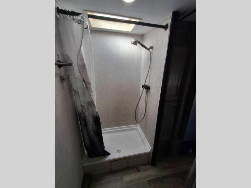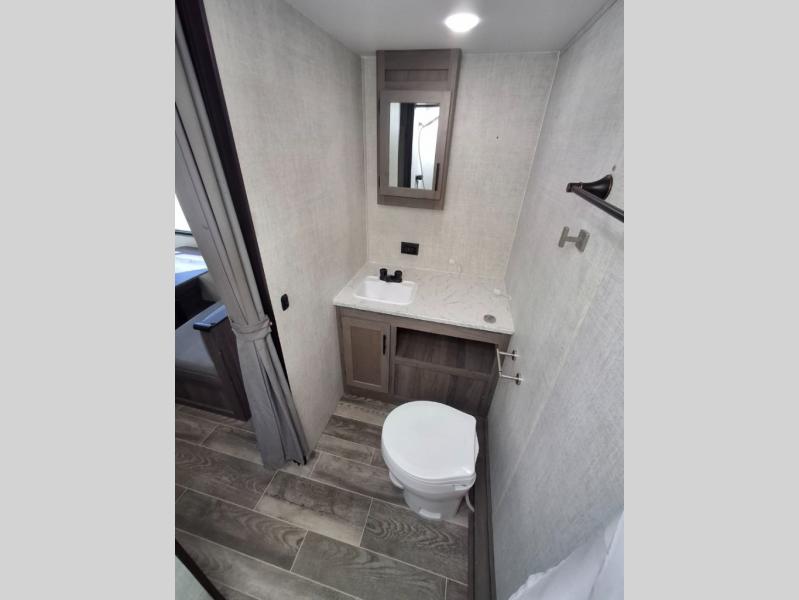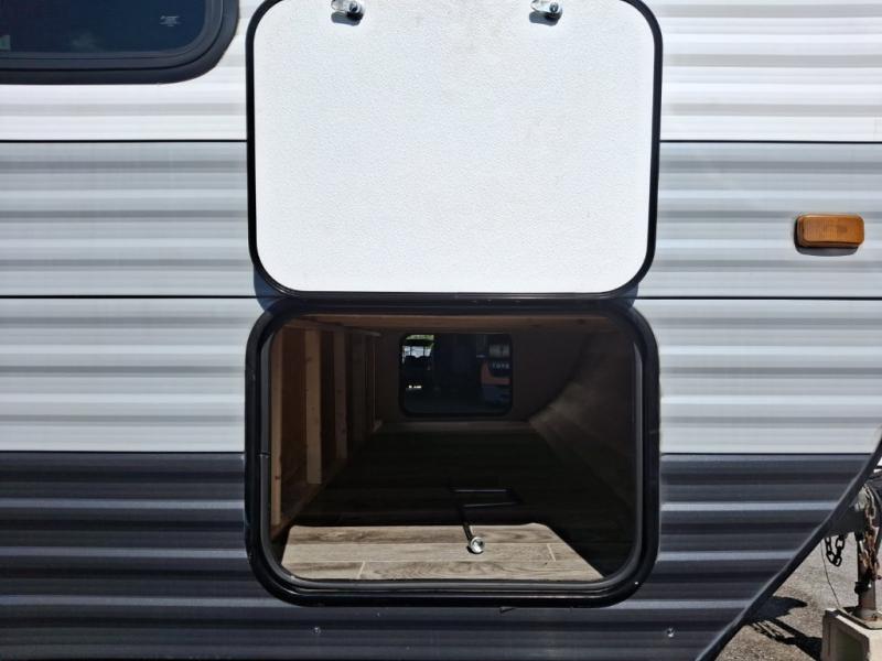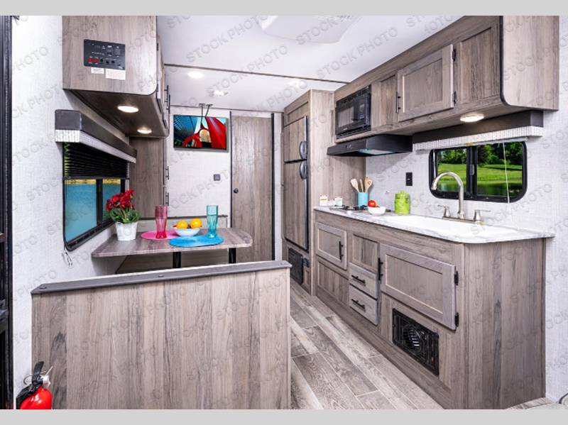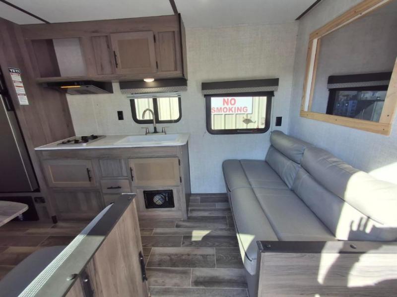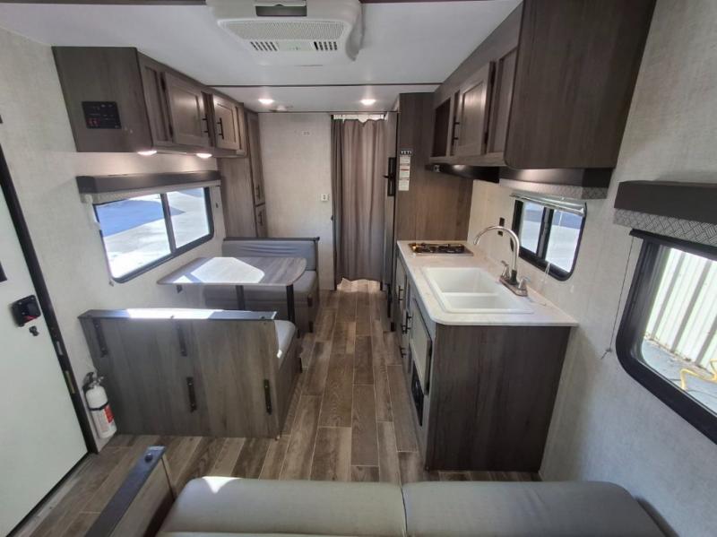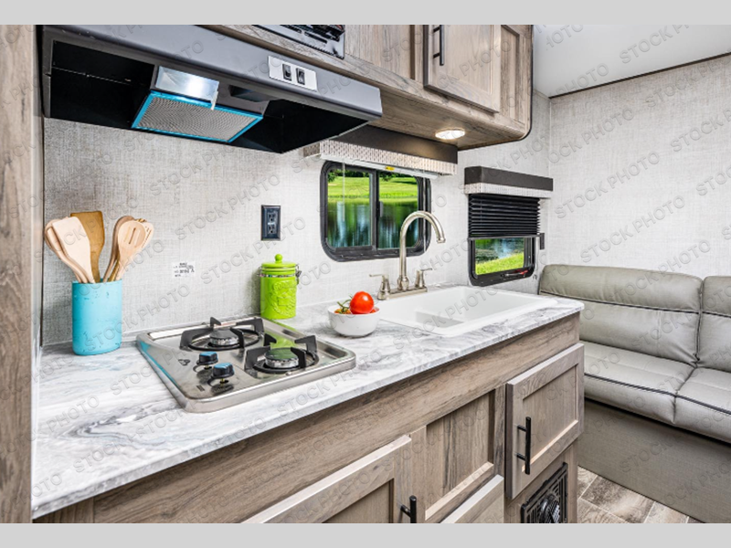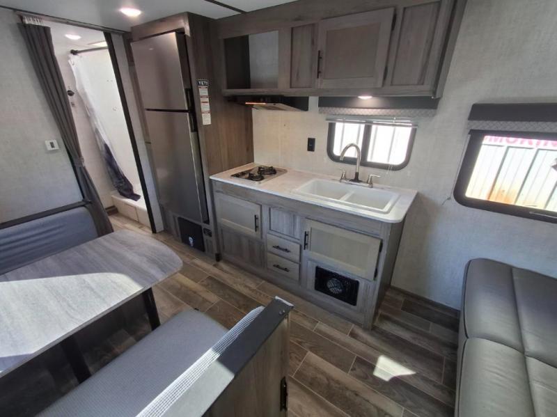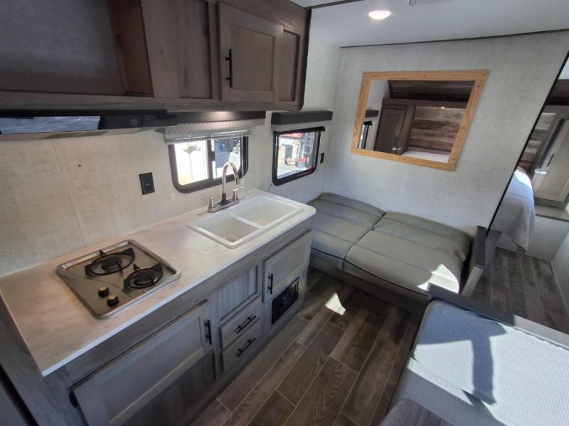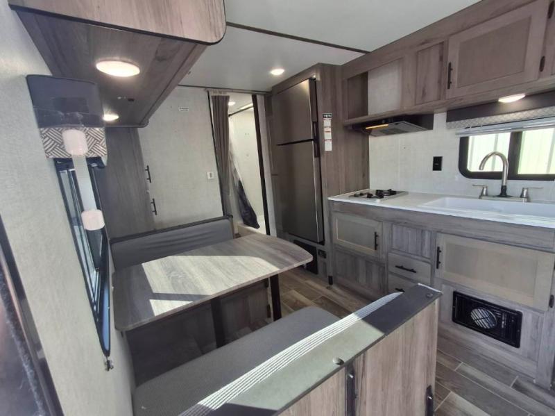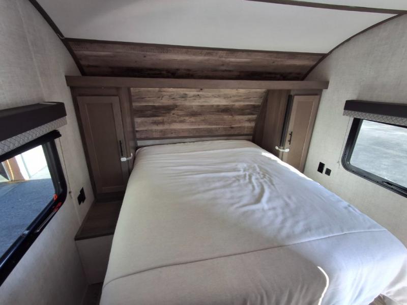 Easy-to-tow and easy to love, this travel trailer is perfect for you! You can prepare meals each day on the three burner cooktop, dine at the booth dinette, and clean up in the full rear bath that includes plenty of counter space. There is a front bedroom with a queen bed, plus two wardrobes on either side of the bed for convenience. Start camping today!