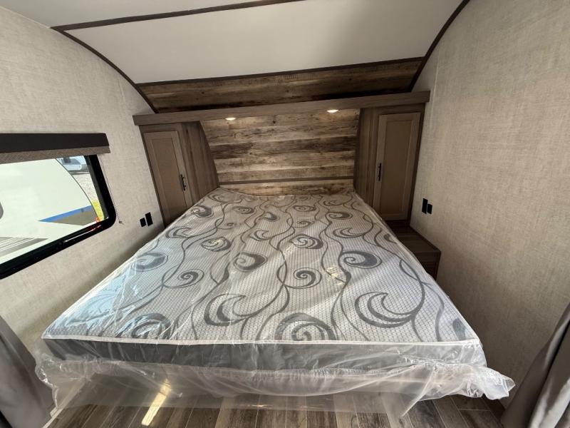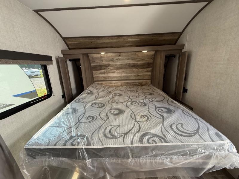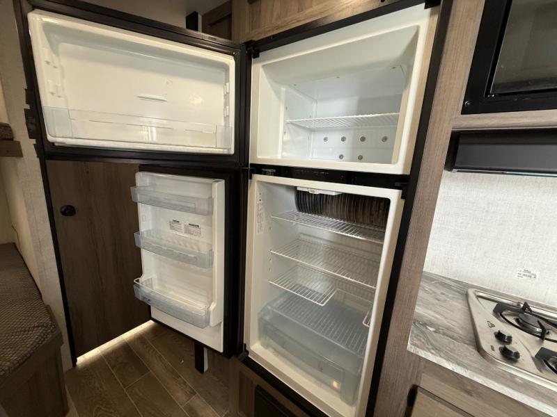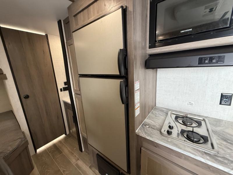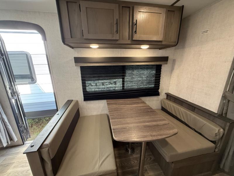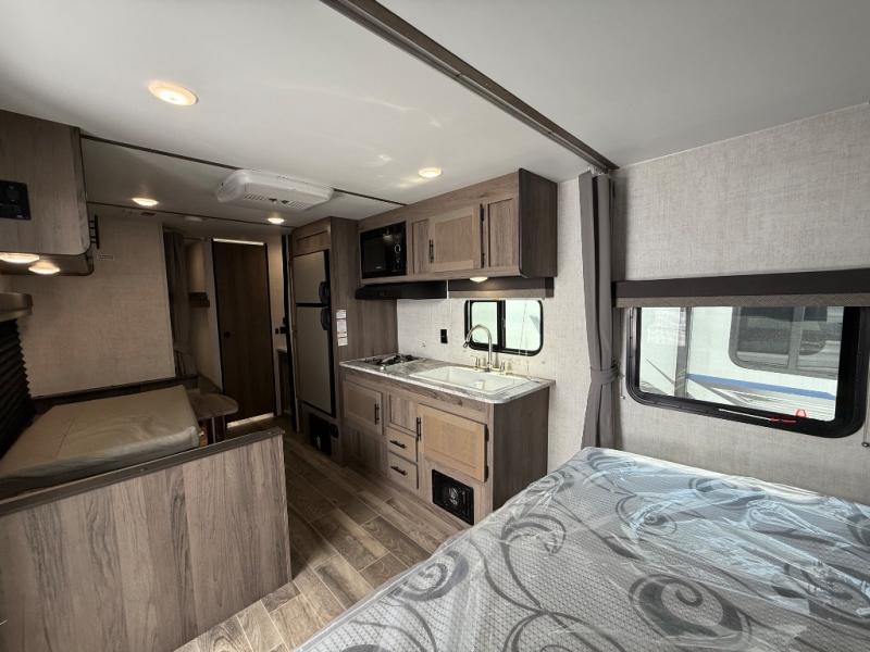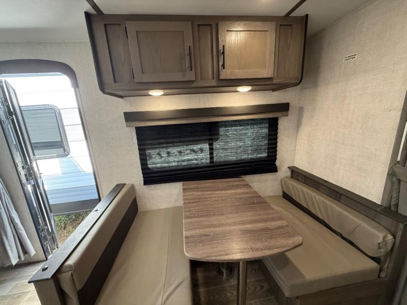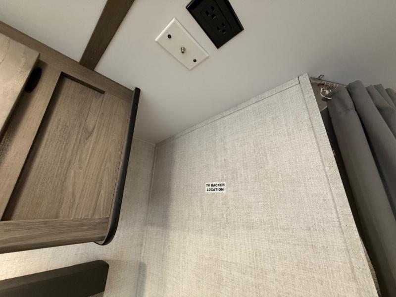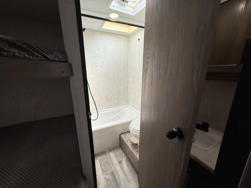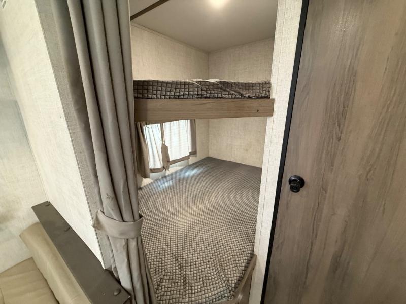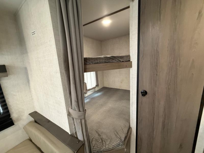 Invite more along with double-size bunks in this travel trailer! The private shower and toilet is close to the bunks if you're camping with little ones, and there is a sink just outside the door so two people can freshen up at once. You and your spouse will get comfortable on the front queen bed, or you can choose the optional Murphy bed to enjoy more seating space during the day. This model includes a booth dinette to dine at each day, or you can sit outside under the electric awning!