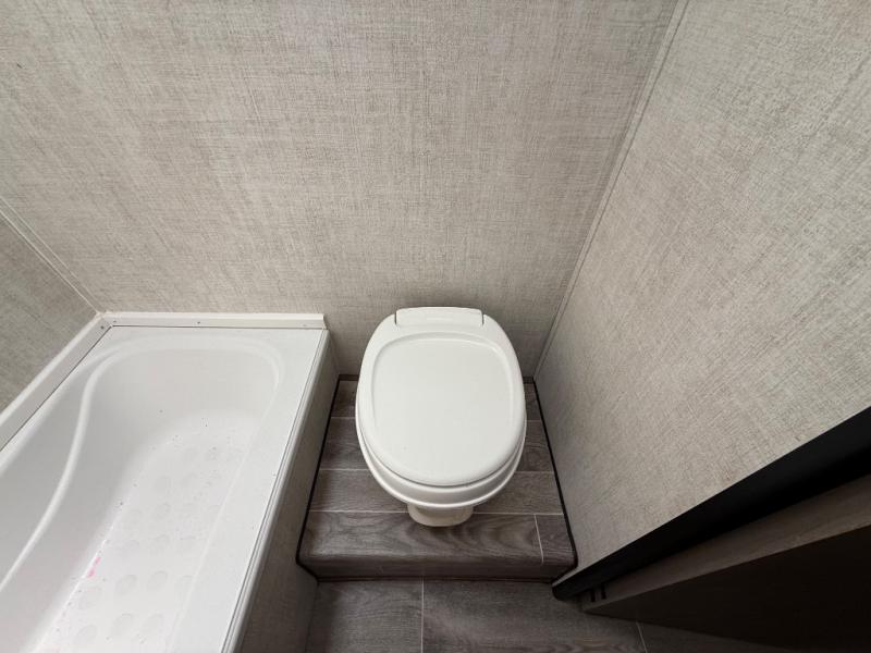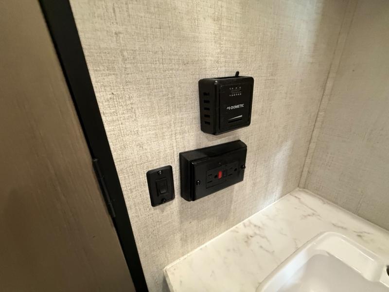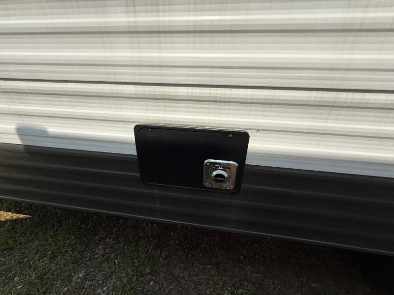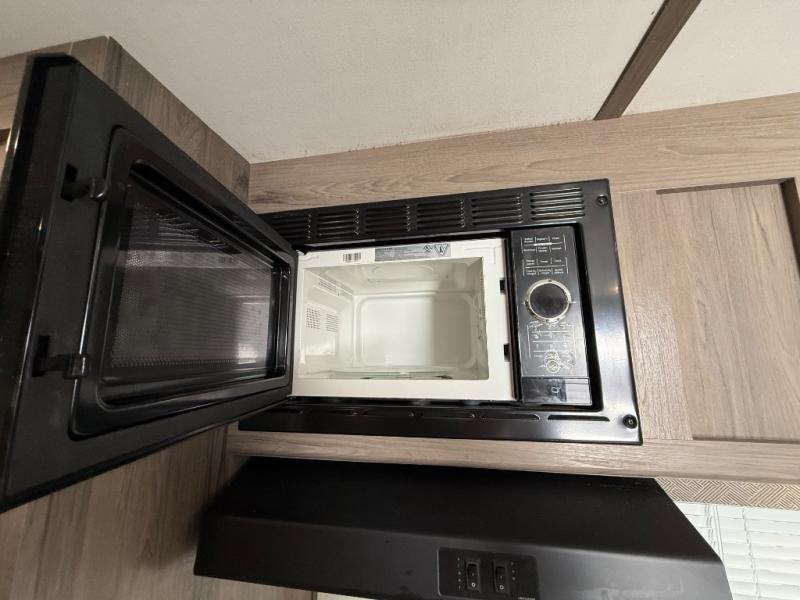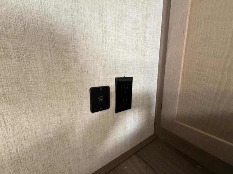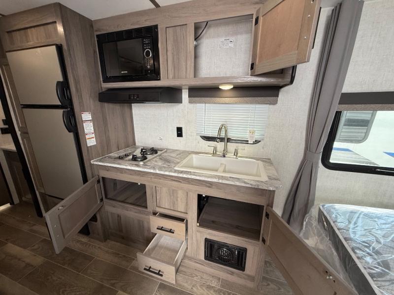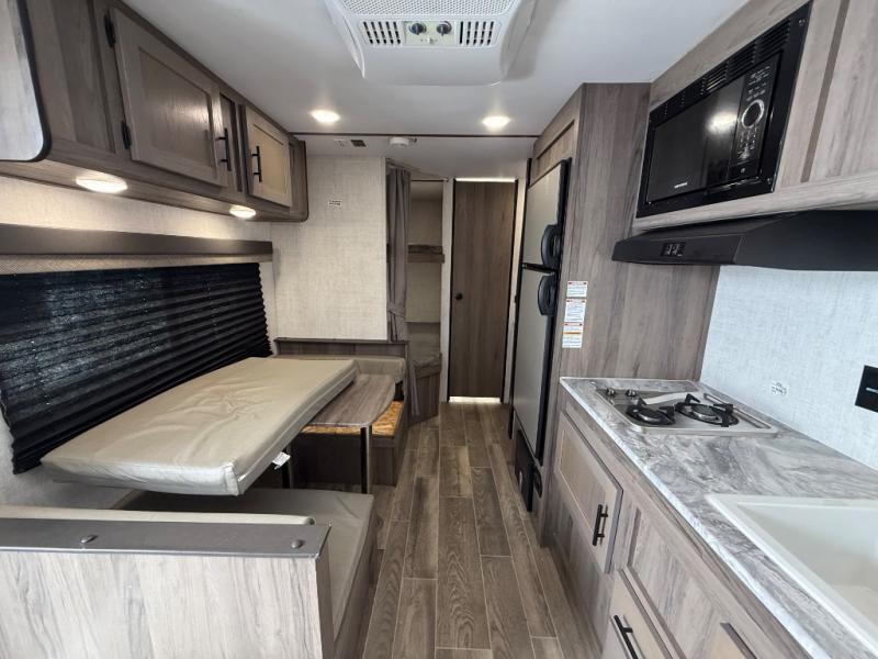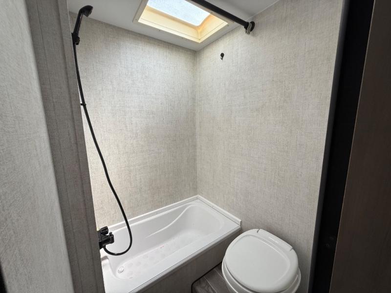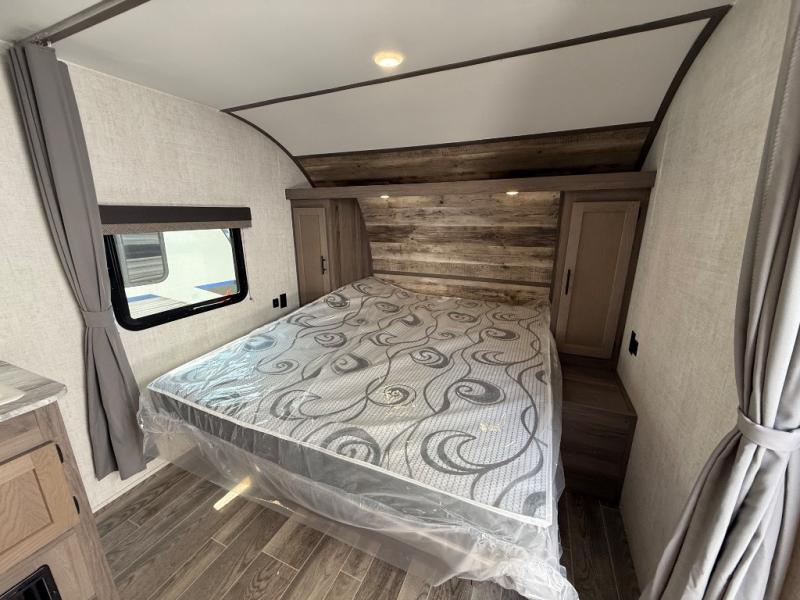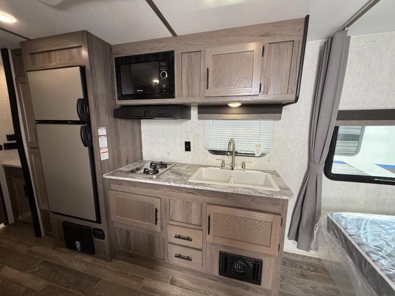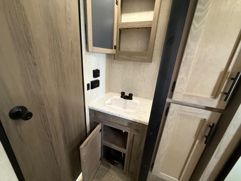 Invite more along with double-size bunks in this travel trailer! The private shower and toilet is close to the bunks if you're camping with little ones, and there is a sink just outside the door so two people can freshen up at once. You and your spouse will get comfortable on the front queen bed, or you can choose the optional Murphy bed to enjoy more seating space during the day. This model includes a booth dinette to dine at each day, or you can sit outside under the electric awning!