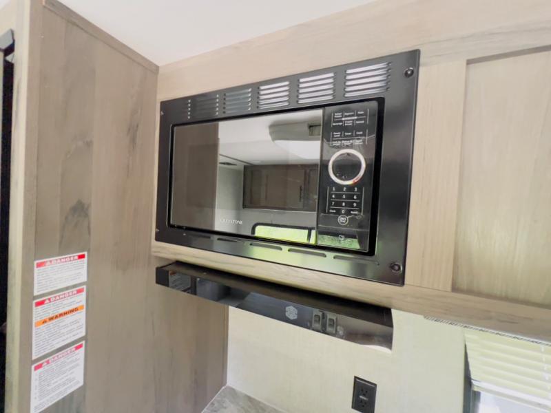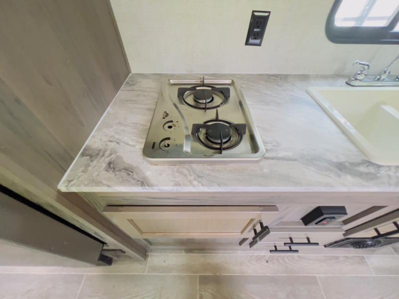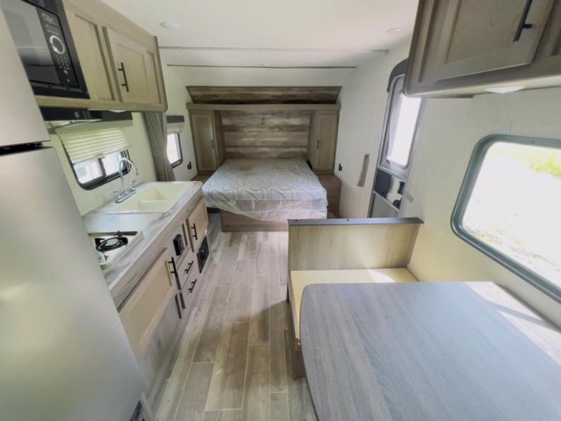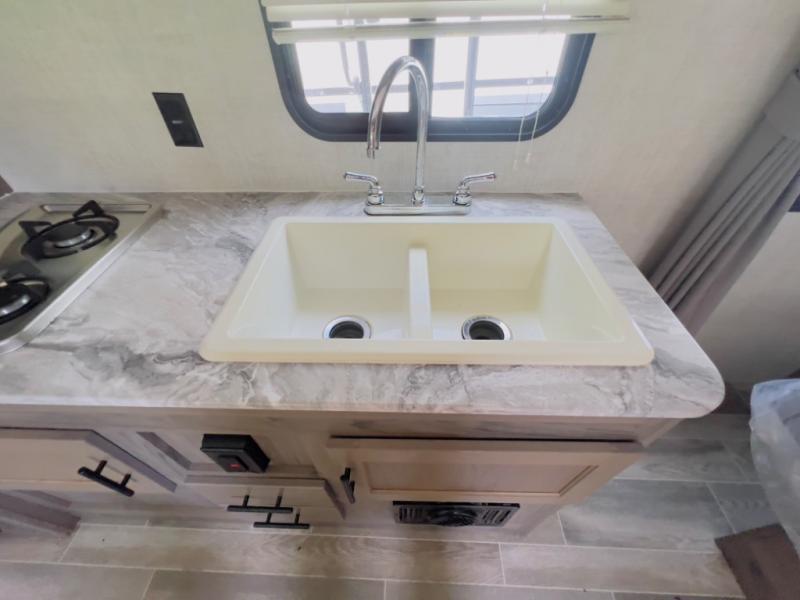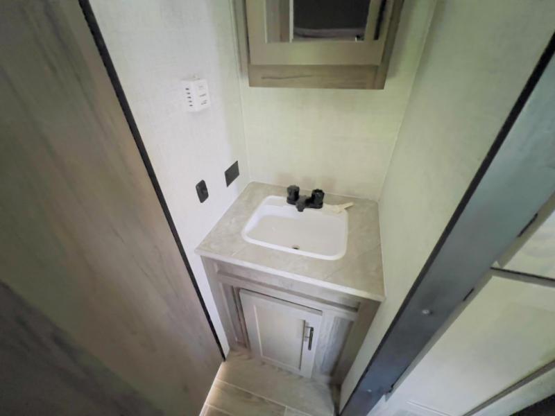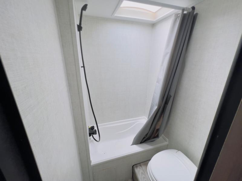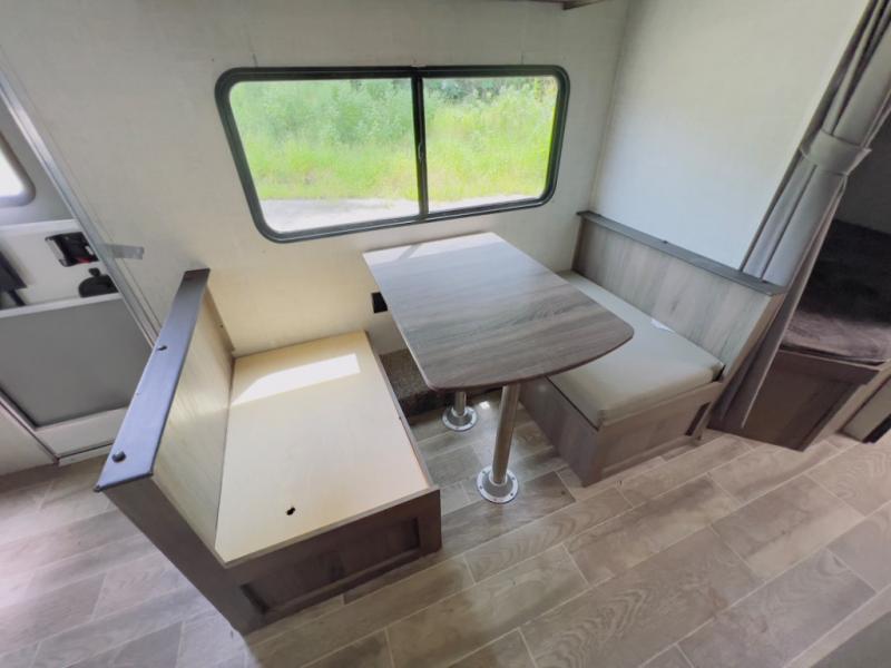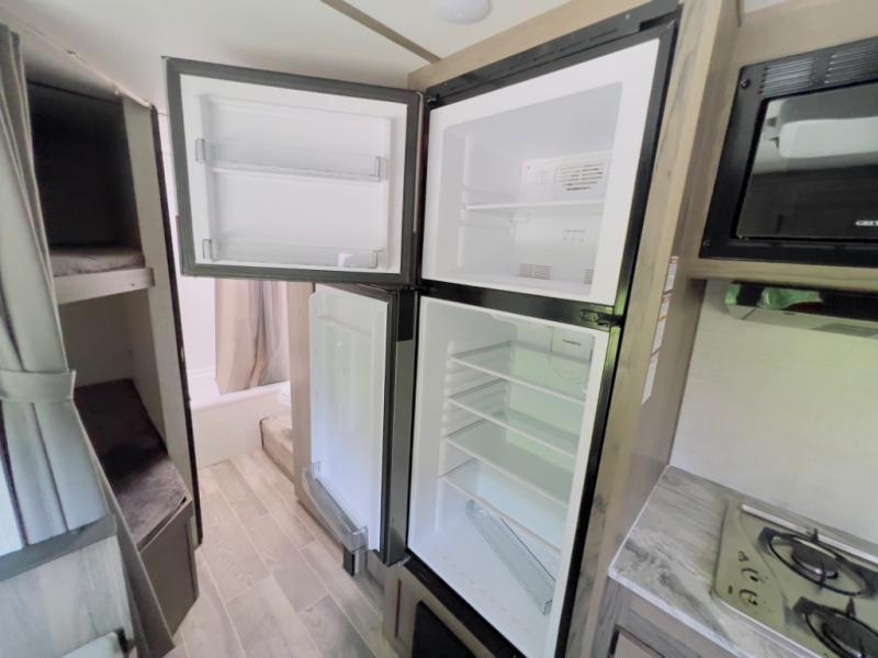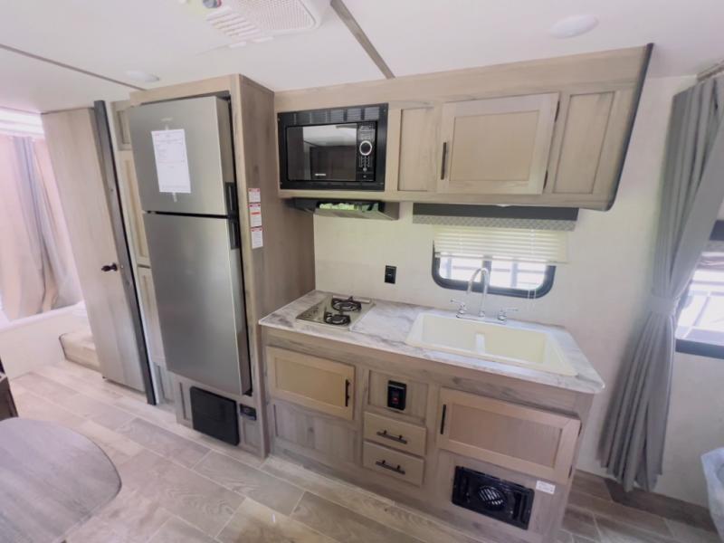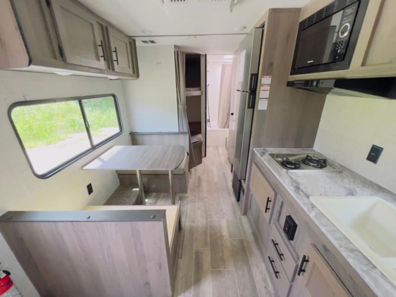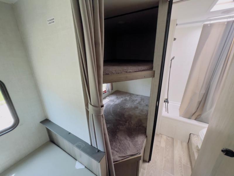 Invite more along with double-size bunks in this travel trailer! The private shower and toilet is close to the bunks if you're camping with little ones, and there is a sink just outside the door so two people can freshen up at once. You and your spouse will get comfortable on the front queen bed, or you can choose the optional Murphy bed to enjoy more seating space during the day. This model includes a booth dinette to dine at each day, or you can sit outside under the electric awning!