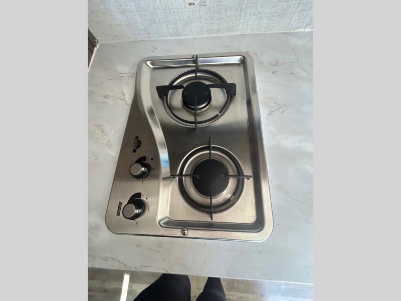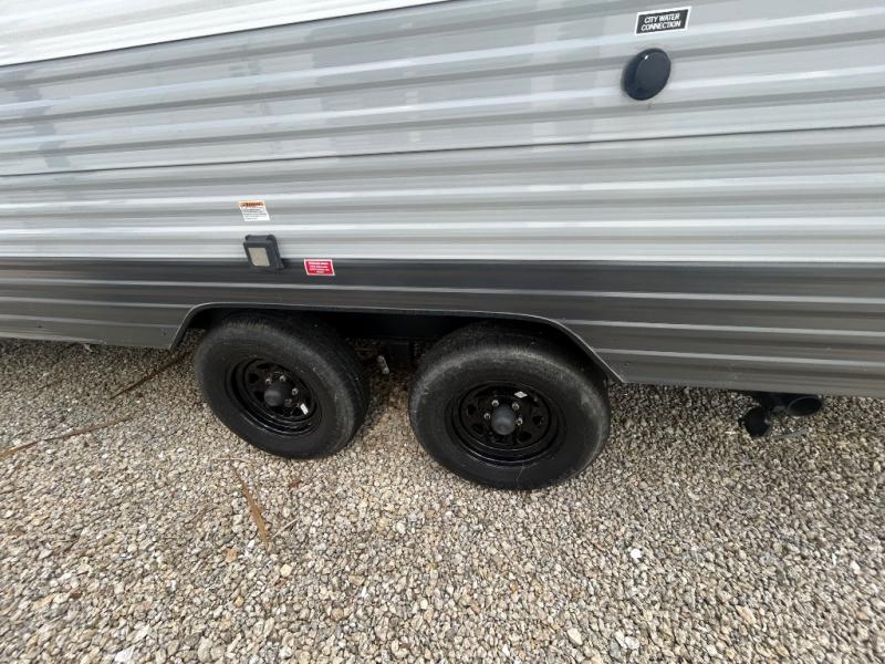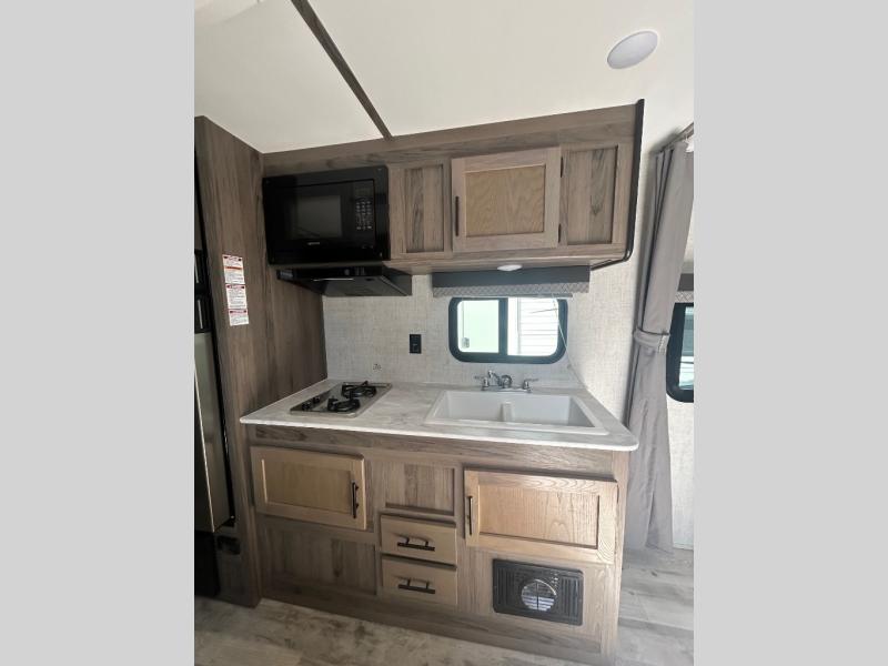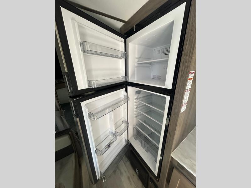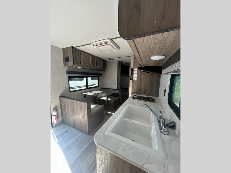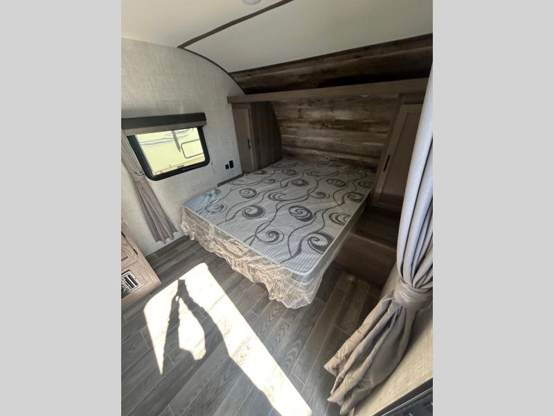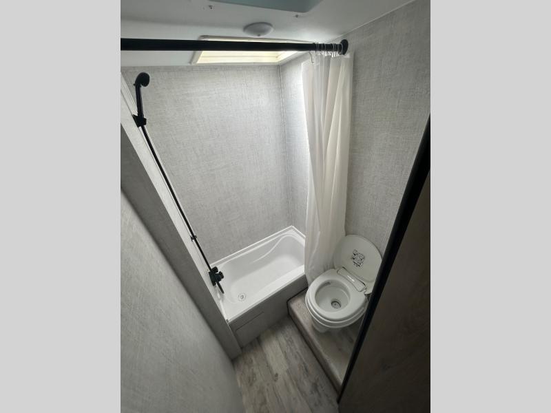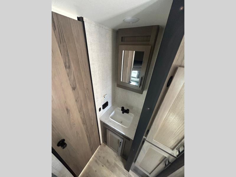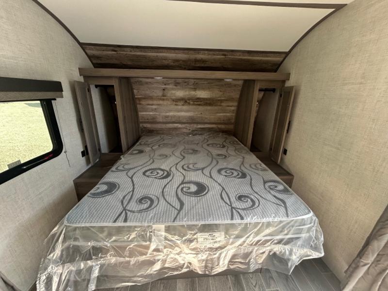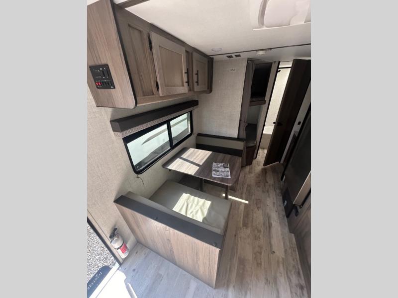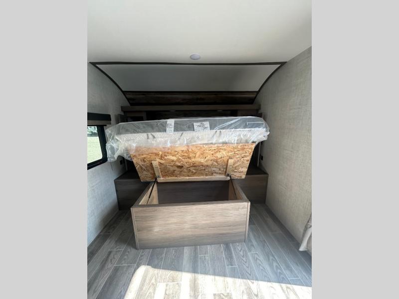 Invite more along with double-size bunks in this travel trailer! The private shower and toilet is close to the bunks if you're camping with little ones, and there is a sink just outside the door so two people can freshen up at once. You and your spouse will get comfortable on the front queen bed, or you can choose the optional Murphy bed to enjoy more seating space during the day. This model includes a booth dinette to dine at each day, or you can sit outside under the electric awning!