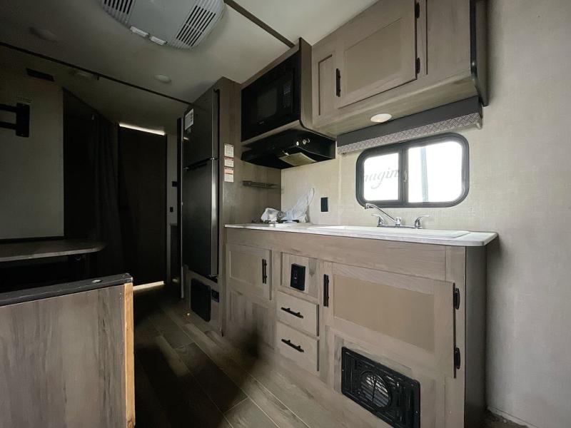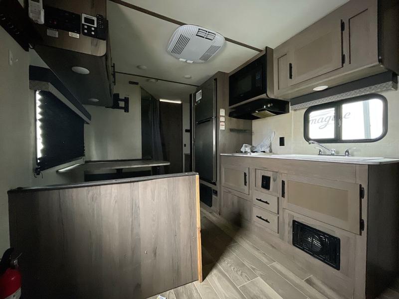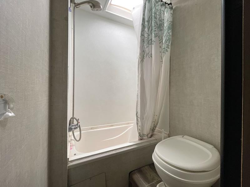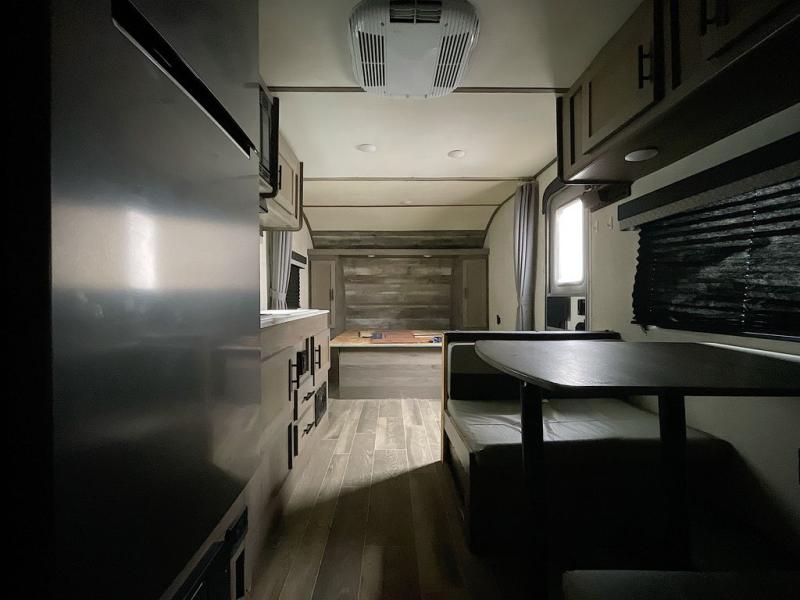 Invite more along with double-size bunks in this travel trailer! The private shower and toilet is close to the bunks if you're camping with little ones, and there is a sink just outside the door so two people can freshen up at once. You and your spouse will get comfortable on the front queen bed, or you can choose the optional Murphy bed to enjoy more seating space during the day. This model includes a booth dinette to dine at each day, or you can sit outside under the electric awning!
