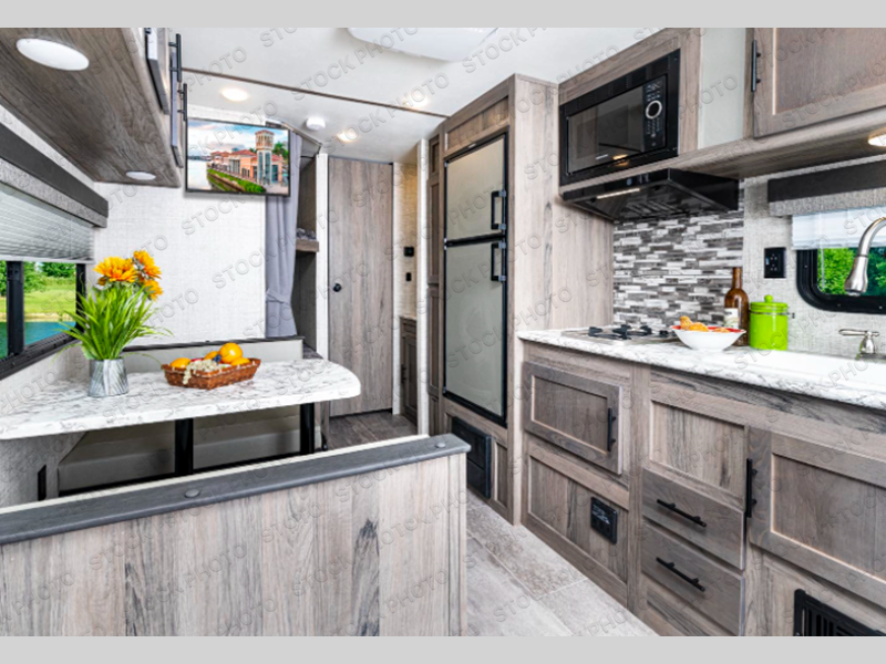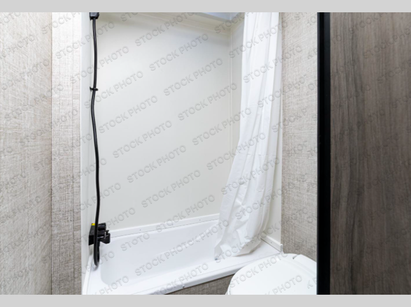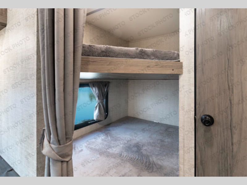 Invite more along with double-size bunks in this travel trailer! The private shower and toilet is close to the bunks if you're camping with little ones, and there is a sink just outside the door so two people can freshen up at once. You and your spouse will get comfortable on the front queen bed, or you can choose the optional Murphy bed to enjoy more seating space during the day. This model includes a booth dinette to dine at each day, or you can sit outside under the electric awning!