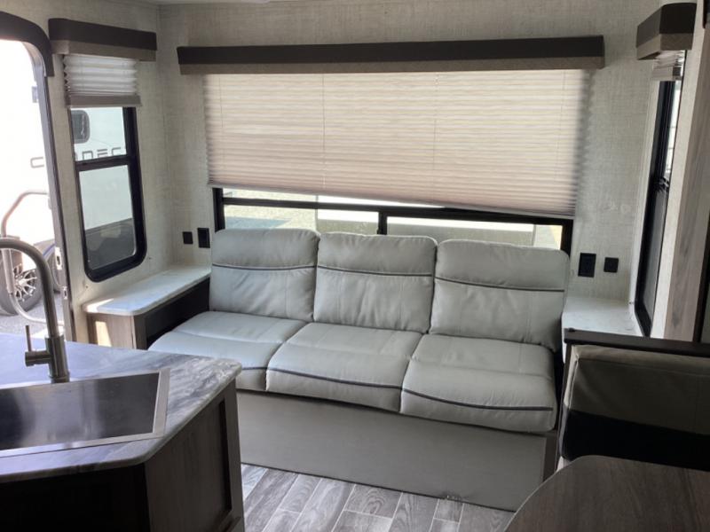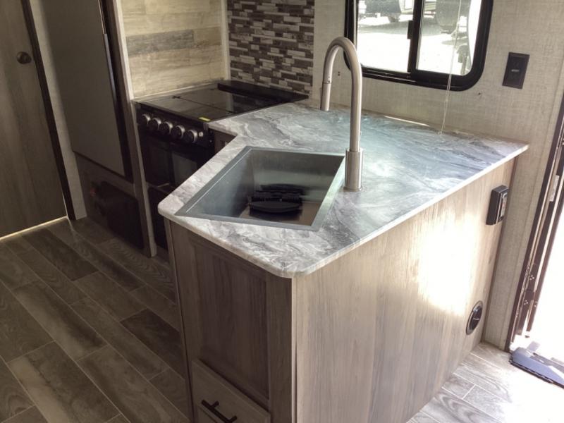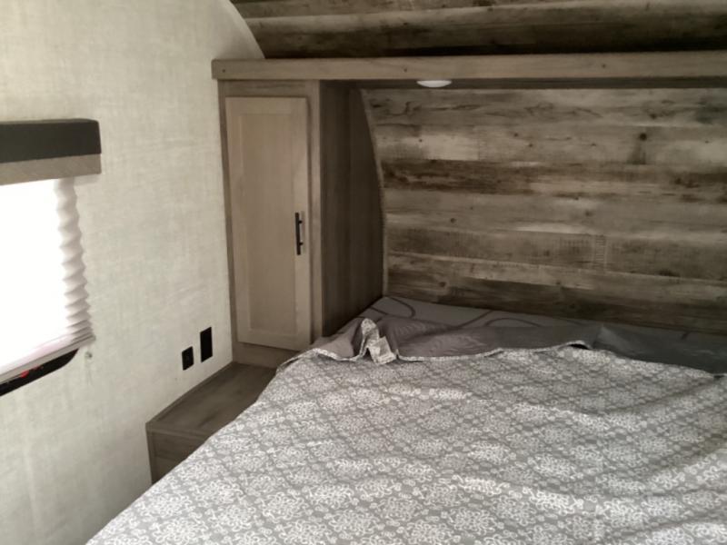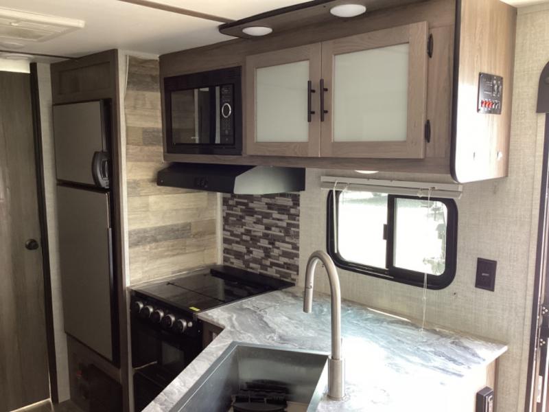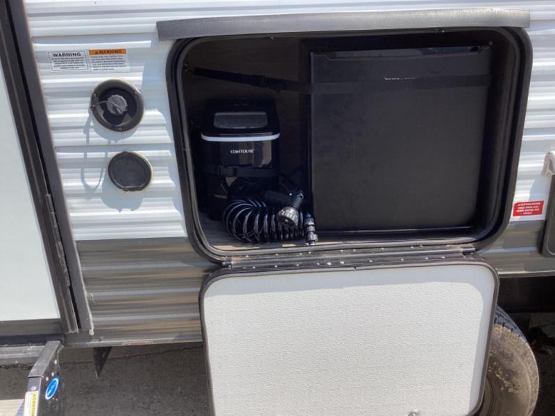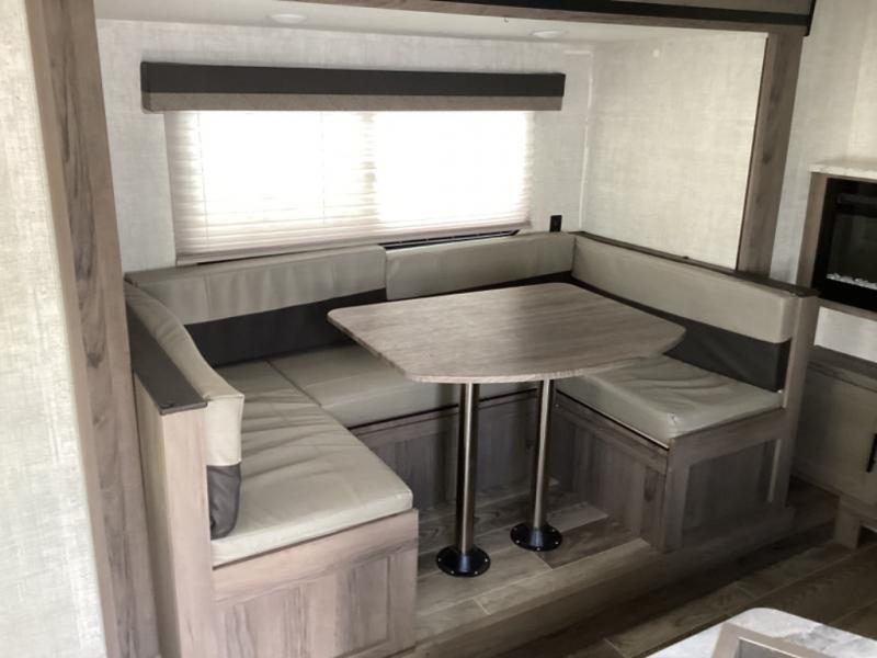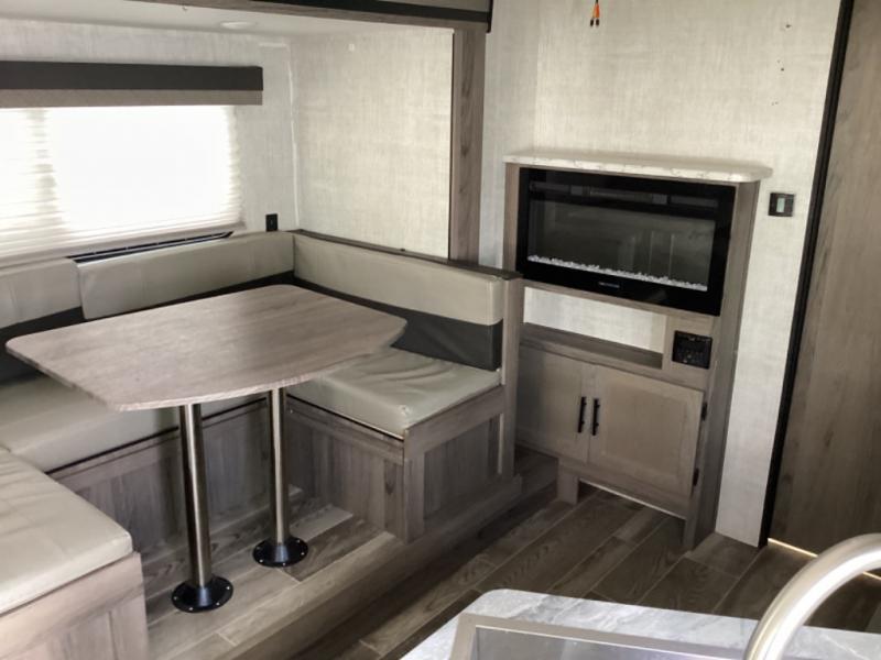 Make this comfortable travel trailer your home-away-from-home on the weekends. You will love having your own master bedroom up front with a queen bed and dual wardrobes for your clothes. The walk-through bath is spacious, allowing you to easily clean up each day. Your guests can sleep on the jackknife sofa or U-shaped dinette, and the fireplace here will make it feel more like home. This model includes all the appliances needed each day to prepare home-cooked meals, including a three burner cooktop, a microwave oven, and a 10.7 cu. ft. Everchill refrigerator/freezer. There is even an outdoor beverage center with a refrigerator and an icemaker to entertain guests!