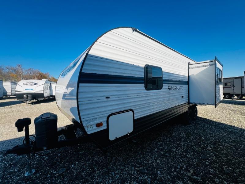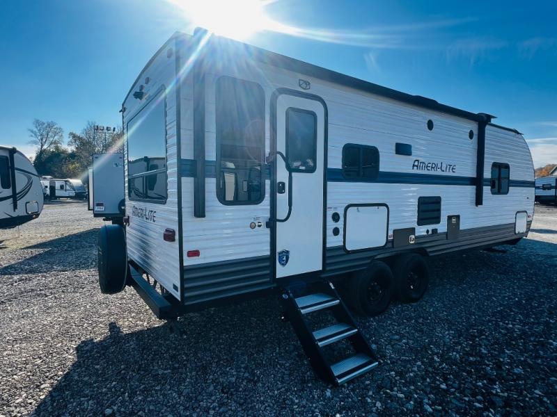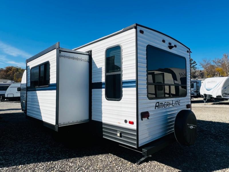 The Ameri-Lite Ultra Lite travel trailers by Gulf Stream are the perfect RV for families wanting to start their camping lifestyle, but not break the bank. These lightweight units include quality construction, such as a tubular steel cambered frame, strong wood roof decking, and full-width steel outriggers for maximum support. The front power hitch jack and four stabilizer jacks will make set-up hassle-free once you arrive at the campground, and you can put out the electric awning to rest in the shade when you're done. Each model includes convenient amenities, like the 13,500 BTU A/C, the 6 gallon DSI water heater, a central control panel, and multiple USB ports for your tablet, phone, and camera! The inside is designed to make you feel at home with radiant LED lighting, designer kitchen backsplash, pleated privacy shades, craft-made cabinetry, plus many more features. Start your RV lifestyle with an affordable, lightweight Ameri-Lite Ultra Lite travel trailer today!