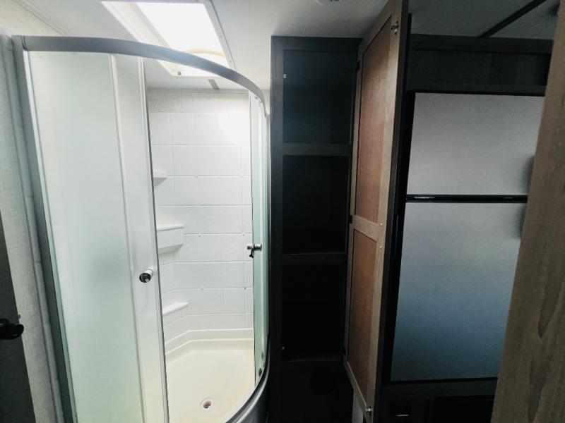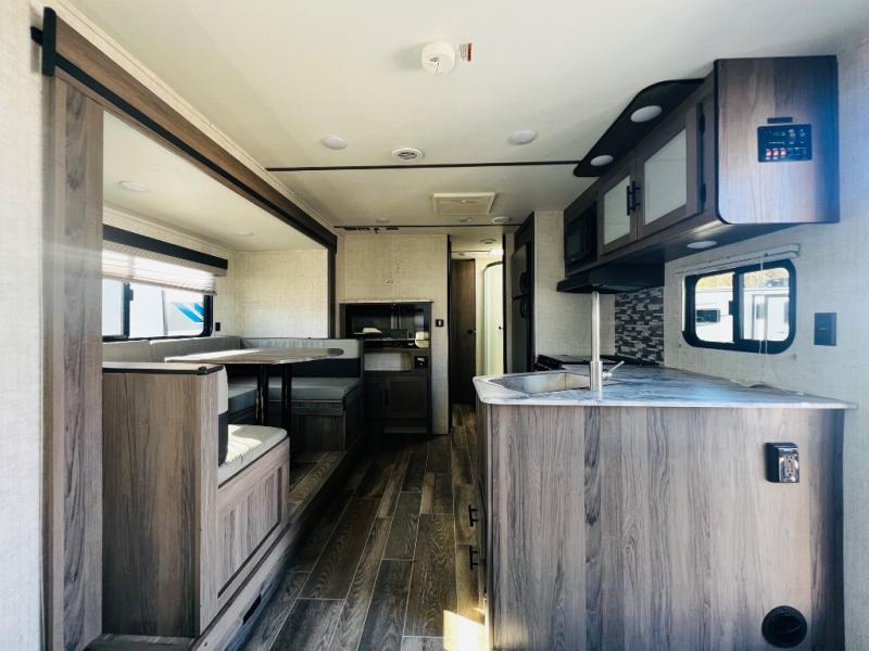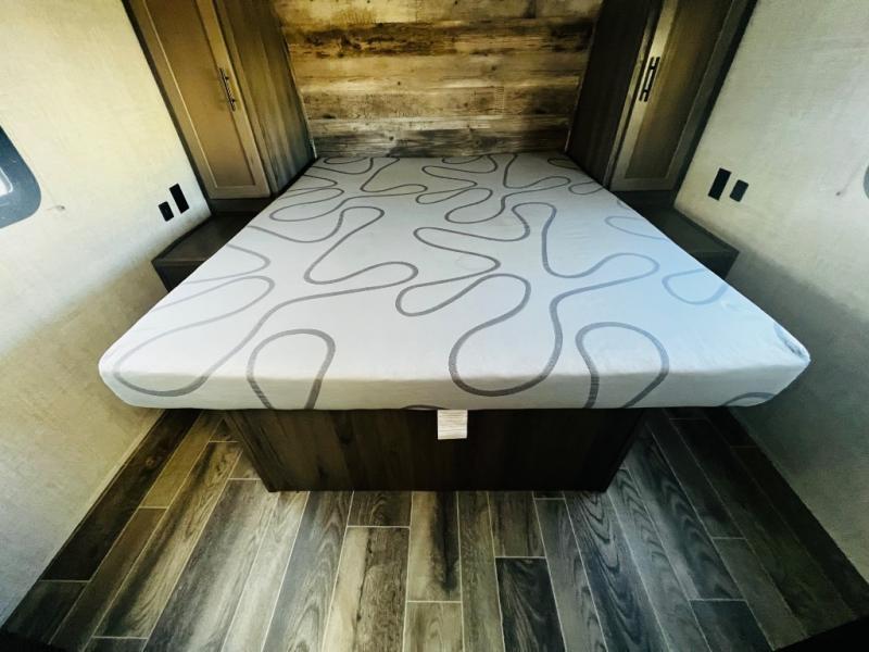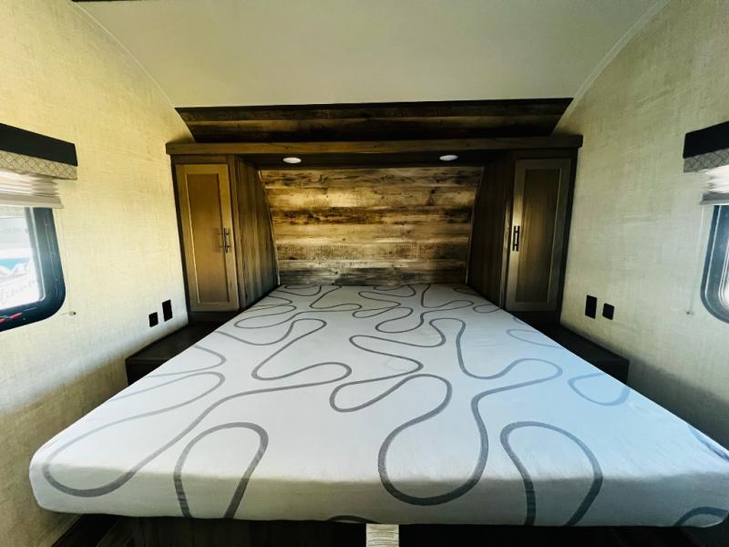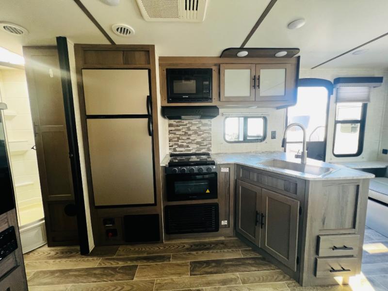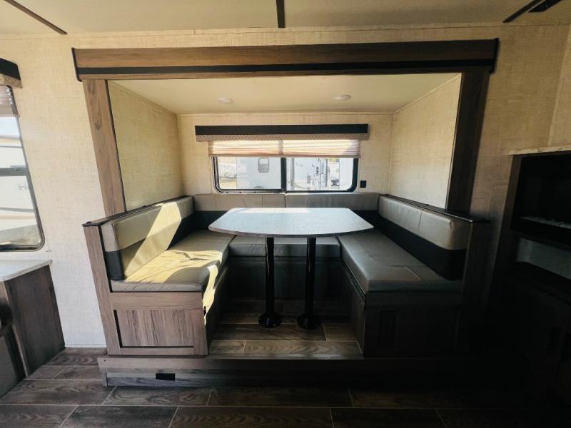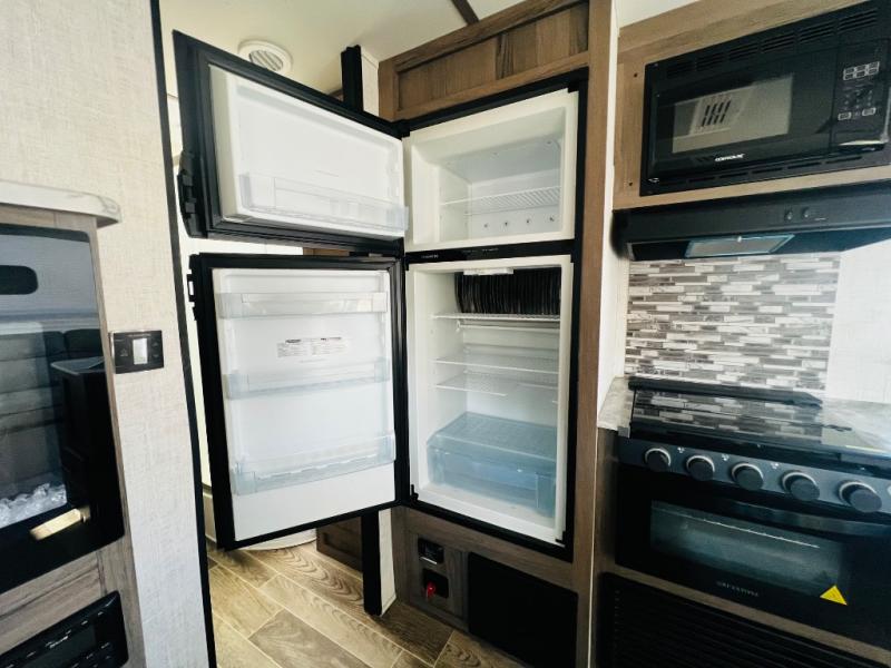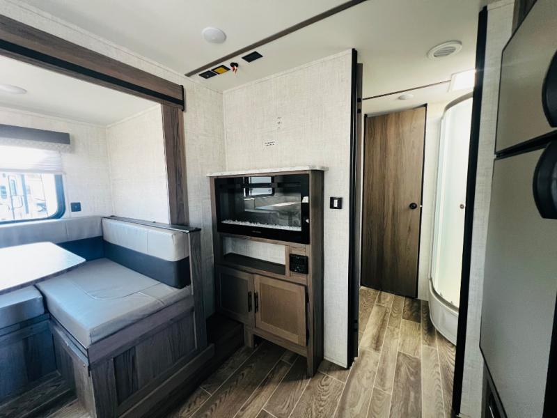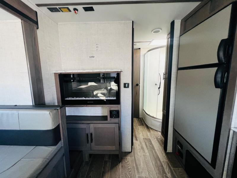 Make this comfortable travel trailer your home-away-from-home on the weekends. You will love having your own master bedroom up front with a queen bed and dual wardrobes for your clothes. The walk-through bath is spacious, allowing you to easily clean up each day. Your guests can sleep on the jackknife sofa or U-shaped dinette, and the fireplace here will make it feel more like home. This model includes all the appliances needed each day to prepare home-cooked meals, including a three burner cooktop, a microwave oven, and a 10.7 cu. ft. Everchill refrigerator/freezer. There is even an outdoor beverage center with a refrigerator and an icemaker to entertain guests!
