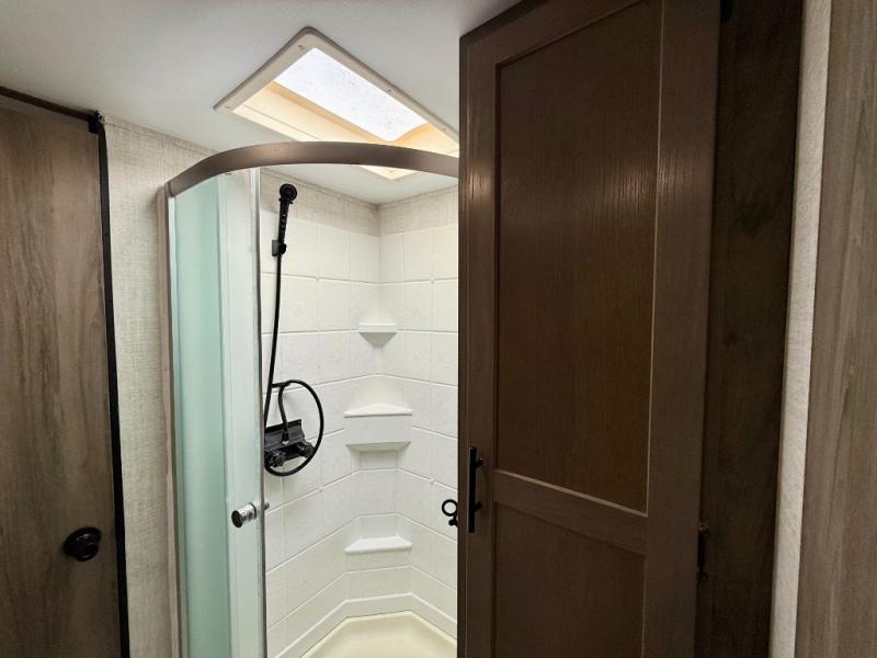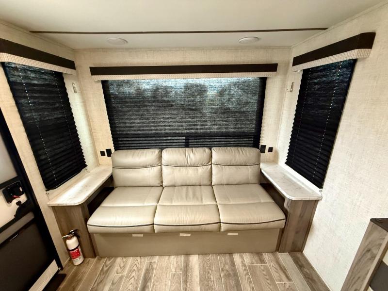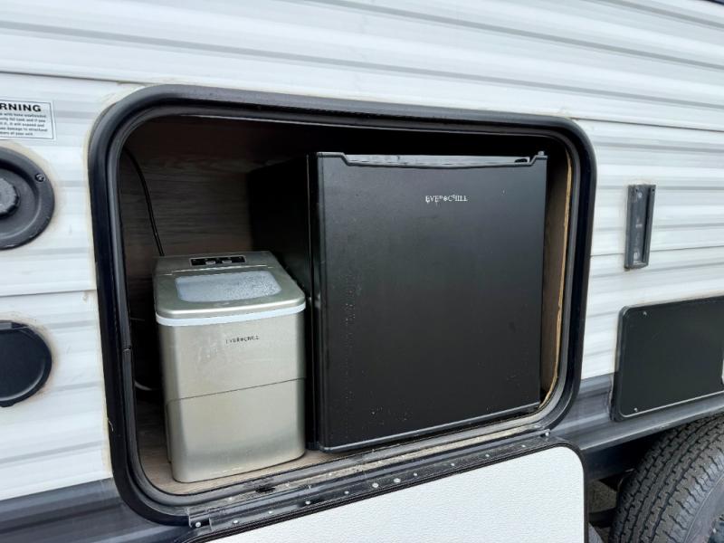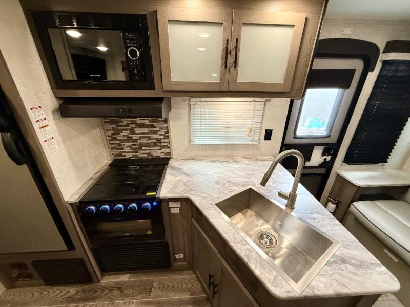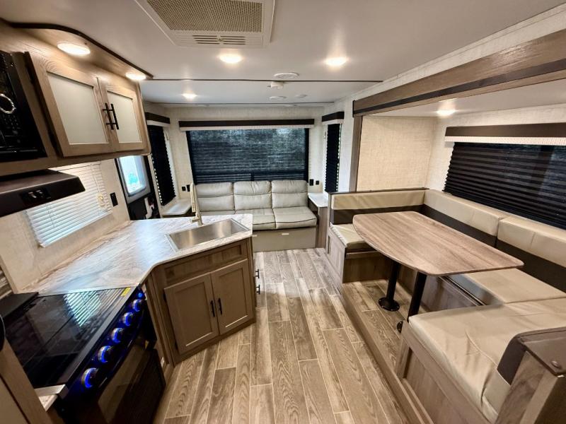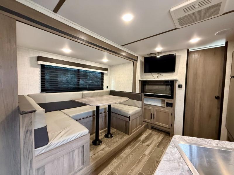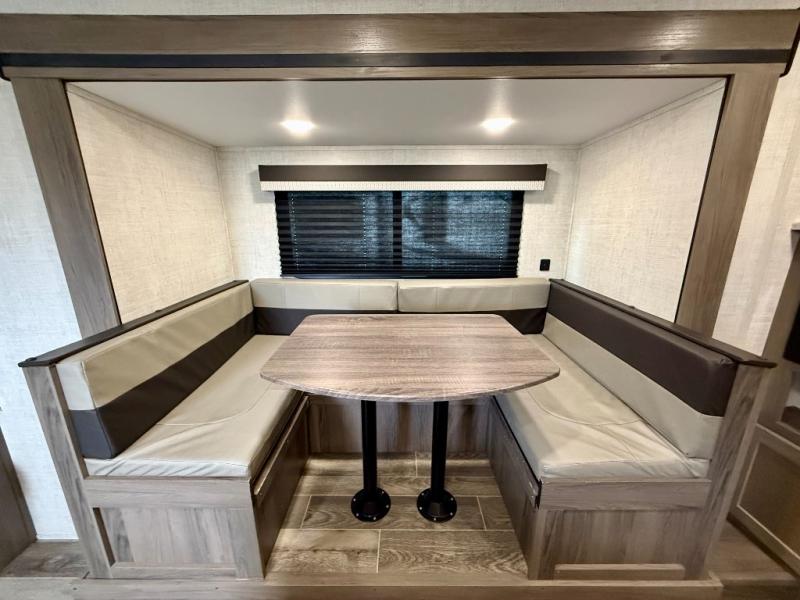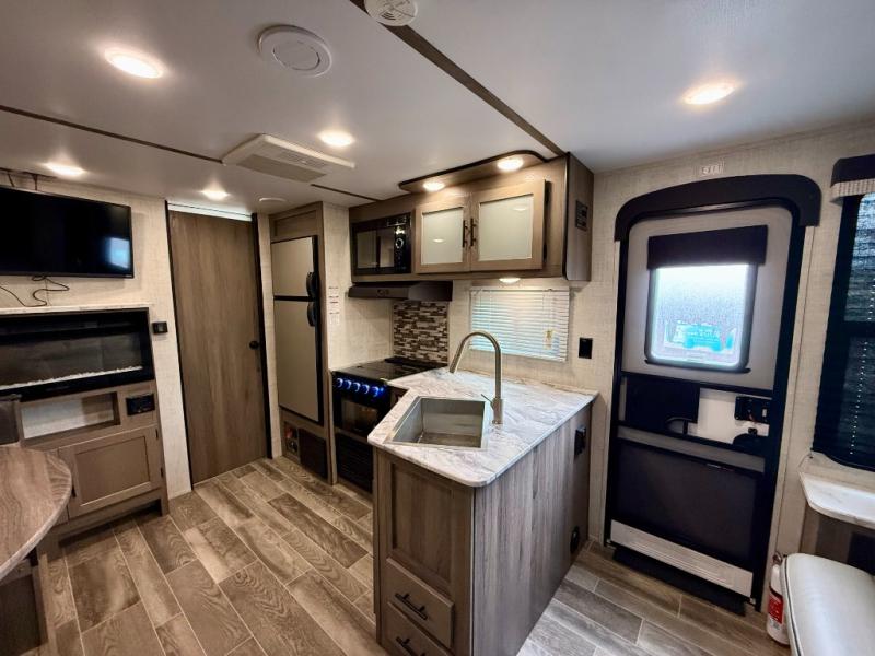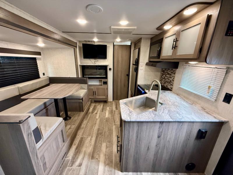 Make this comfortable travel trailer your home-away-from-home on the weekends. You will love having your own master bedroom up front with a queen bed and dual wardrobes for your clothes. The walk-through bath is spacious, allowing you to easily clean up each day. Your guests can sleep on the jackknife sofa or U-shaped dinette, and the fireplace here will make it feel more like home. This model includes all the appliances needed each day to prepare home-cooked meals, including a three burner cooktop, a microwave oven, and a 10.7 cu. ft. Everchill refrigerator/freezer. There is even an outdoor beverage center with a refrigerator and an icemaker to entertain guests!