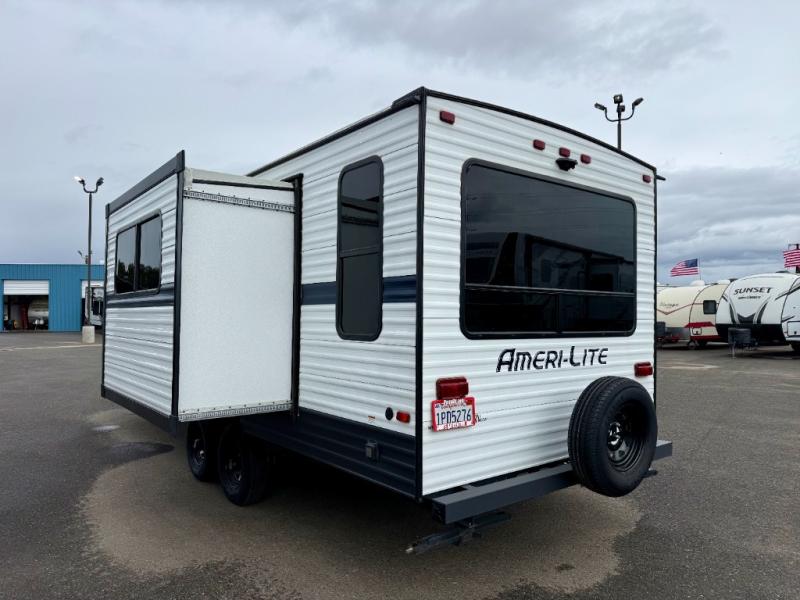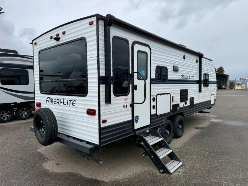 The Ameri-Lite Ultra Lite travel trailers by Gulf Stream are the perfect RV for families wanting to start their camping lifestyle, but not break the bank. These lightweight units include quality construction, such as a tubular steel cambered frame, strong wood roof decking, and full-width steel outriggers for maximum support. The front power hitch jack and four stabilizer jacks will make set-up hassle-free once you arrive at the campground, and you can put out the electric awning to rest in the shade when you're done. Each model includes convenient amenities, like the 13,500 BTU A/C, the 6 gallon DSI water heater, a central control panel, and multiple USB ports for your tablet, phone, and camera! The inside is designed to make you feel at home with radiant LED lighting, designer kitchen backsplash, pleated privacy shades, craft-made cabinetry, plus many more features. Start your RV lifestyle with an affordable, lightweight Ameri-Lite Ultra Lite travel trailer today!