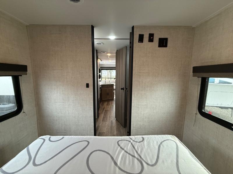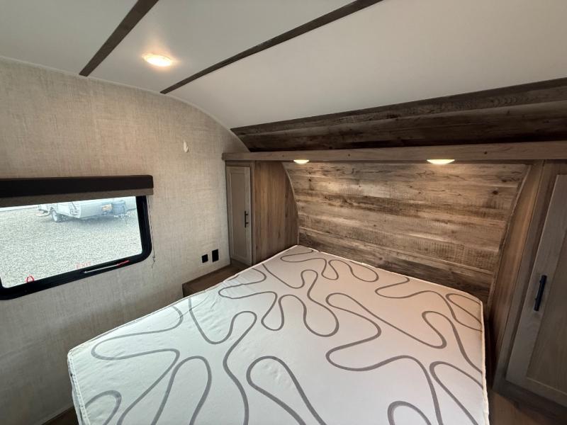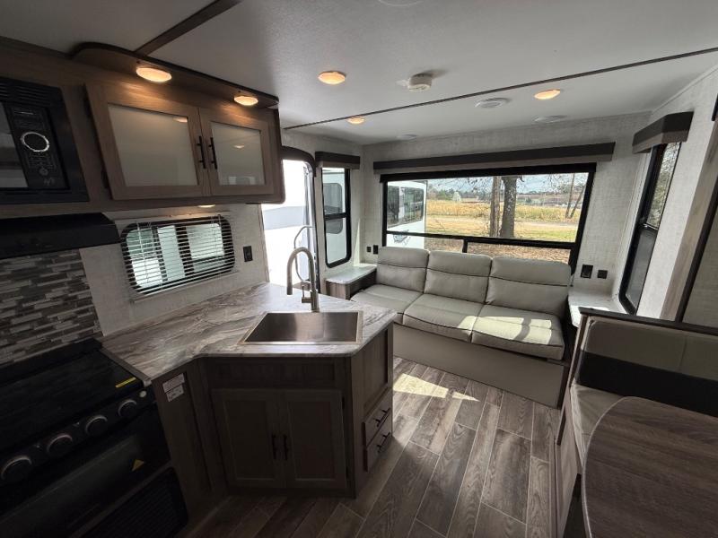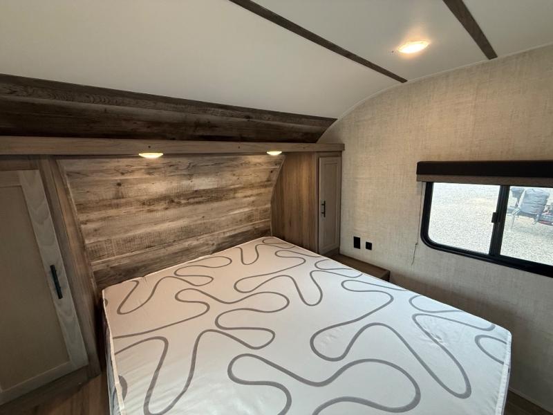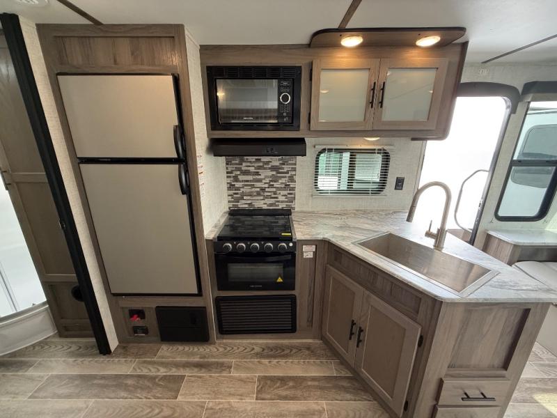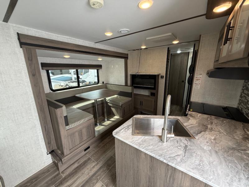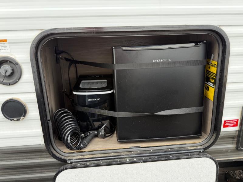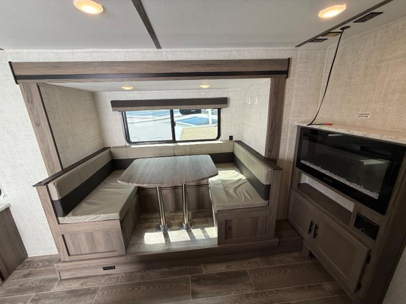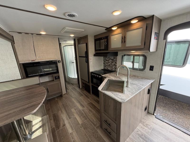Make this comfortable travel trailer your home-away-from-home on the weekends. You will love having your own master bedroom up front with a queen bed and dual wardrobes for your clothes. The walk-through bath is spacious, allowing you to easily clean up each day. Your guests can sleep on the jackknife sofa or U-shaped dinette, and the fireplace here will make it feel more like home. This model includes all the appliances needed each day to prepare home-cooked meals, including a three burner cooktop, a microwave oven, and a 10.7 cu. ft. Everchill refrigerator/freezer. There is even an outdoor beverage center with a refrigerator and an icemaker to entertain guests!