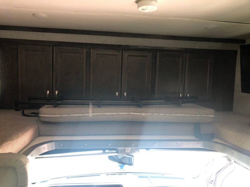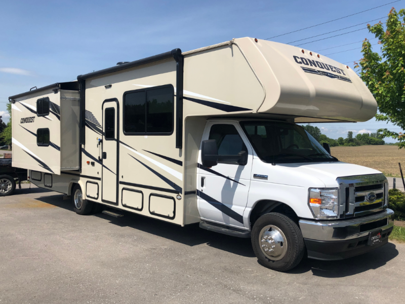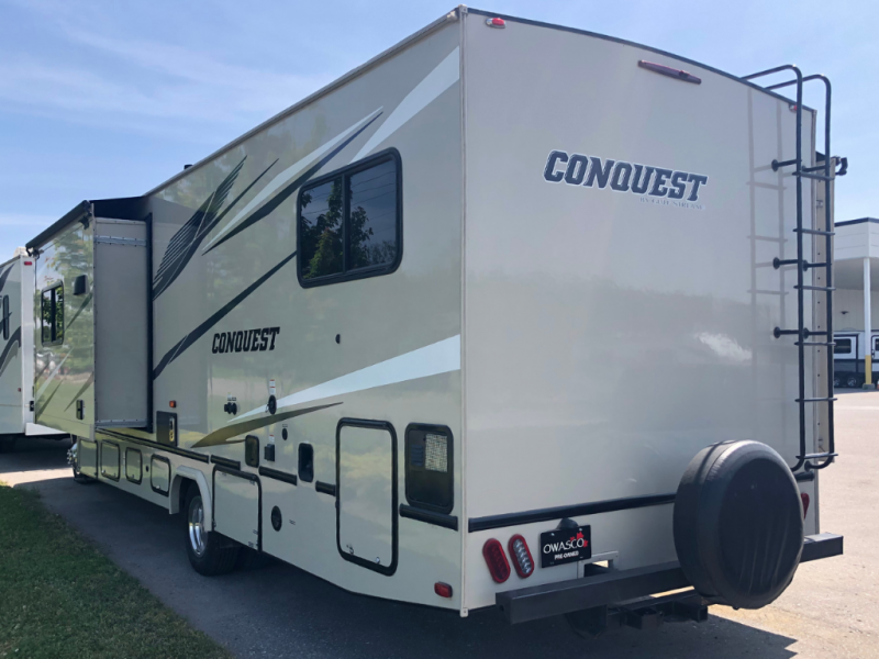 Looking for space for everyone and everything on your next road trip? With this Conquest Class C gas motorhome, you will find exterior and interior storage throughout including a bedroom wardrobe, overhead cabinets, and exterior basement storage. You will find sleeping space on the RV queen bed in the private bedroom, the set of bunk beds across from the bathroom, and the bunk over the cab. Additional sleeping space can be created when you maneuver the jackknife sofa and booth dinette into place. If you enjoy cooking, the kitchen has what you need with its flip-up countertop for more prep space and its three-burner range for sautéing your stir fry.