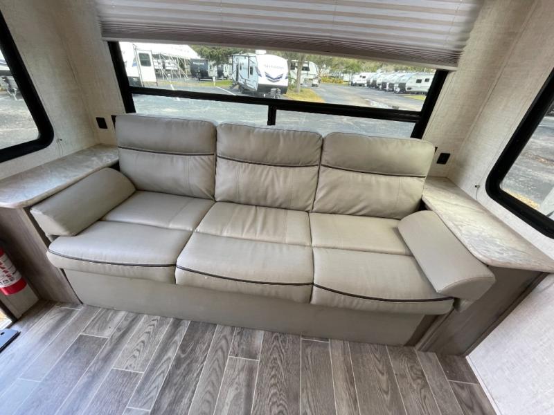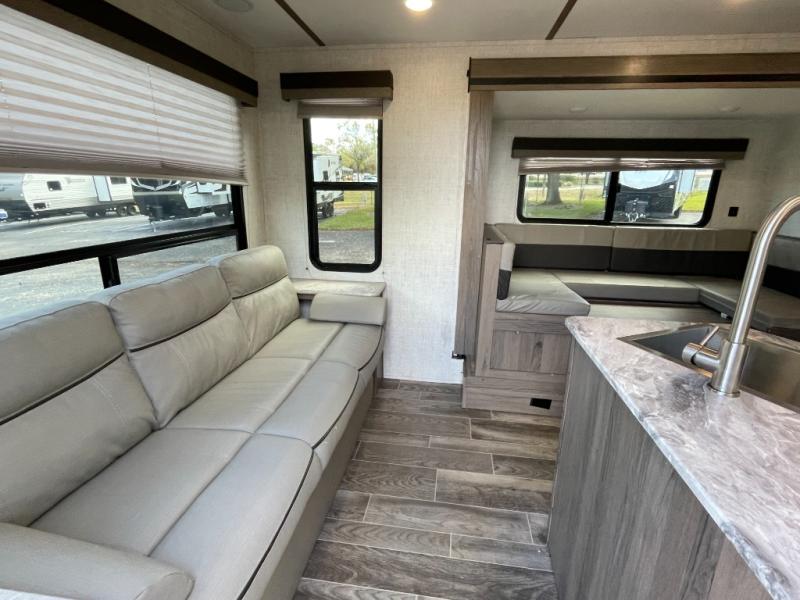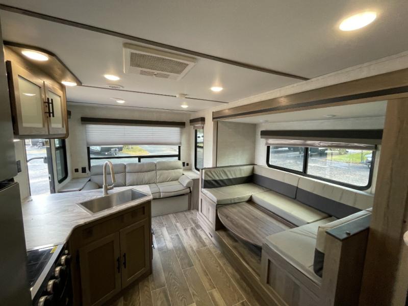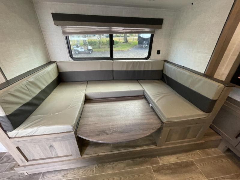 Step inside to a welcoming living space with a spacious slide-out that expands the seating area. The comfortable lounge and dinette are perfect for meals, games, and relaxation. Large windows throughout create a bright, airy atmosphere and let in plenty of natural light, making the interior feel open and inviting.