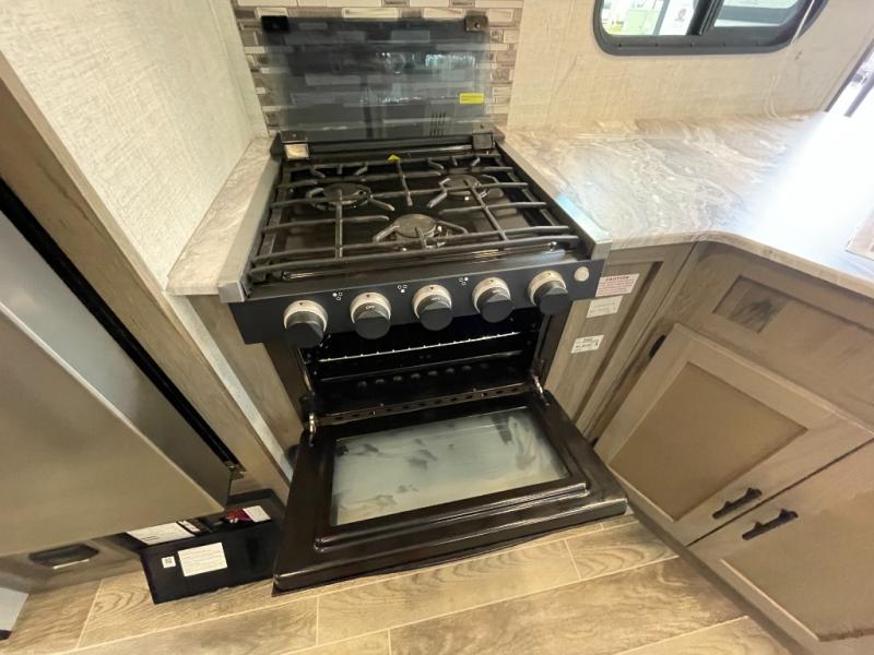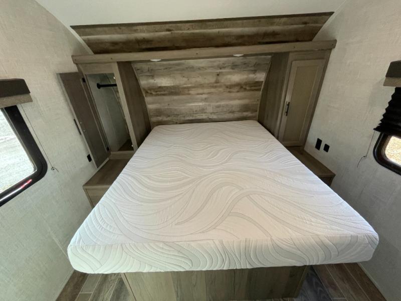 The private bedroom includes a cozy queen bed with storage underneath, bedside shelves, and wardrobe closets to keep your clothes and gear neatly stowed. The living area also converts to additional sleeping space thanks to the dinette and sofa, making the 23RLS ideal for family trips or overnight guests.