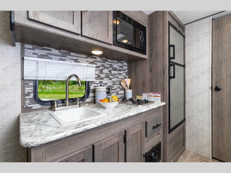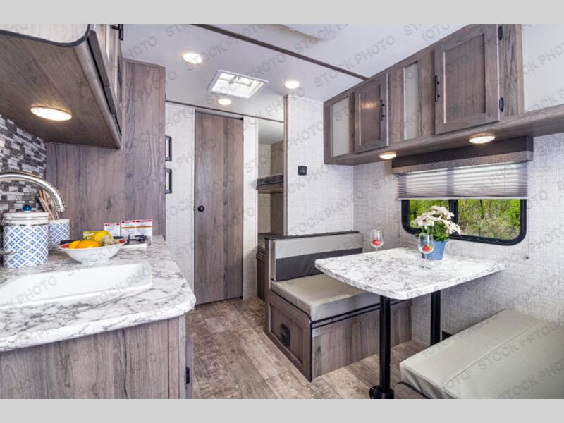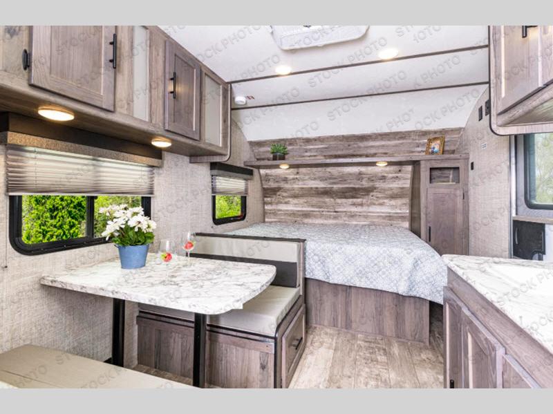 The interior of the Innsbruck 199DD is built for convenience and relaxation. A fully equipped kitchen includes a cooktop, microwave, refrigerator, and ample storage, allowing you to prepare meals wherever your travels take you. The dinette offers a comfortable place to eat, work, or unwind, and can easily convert into additional sleeping space when needed.