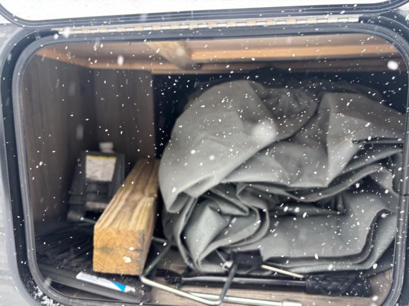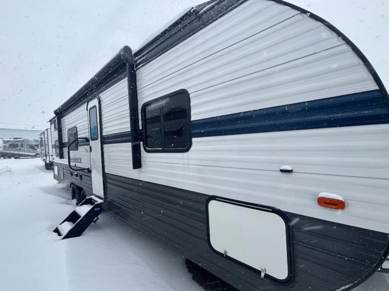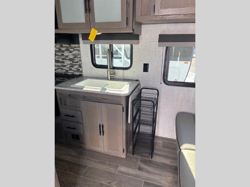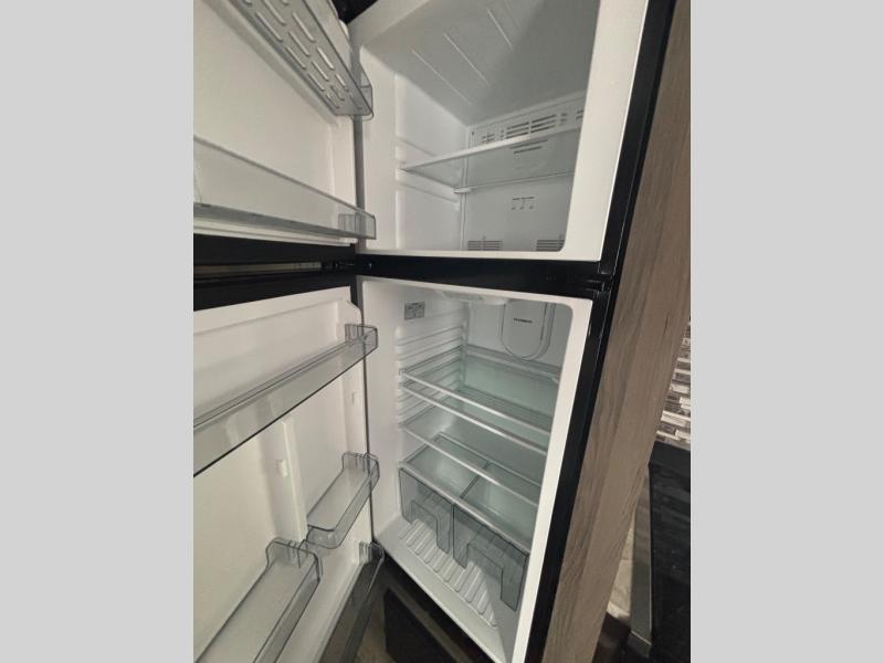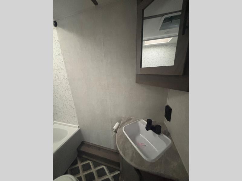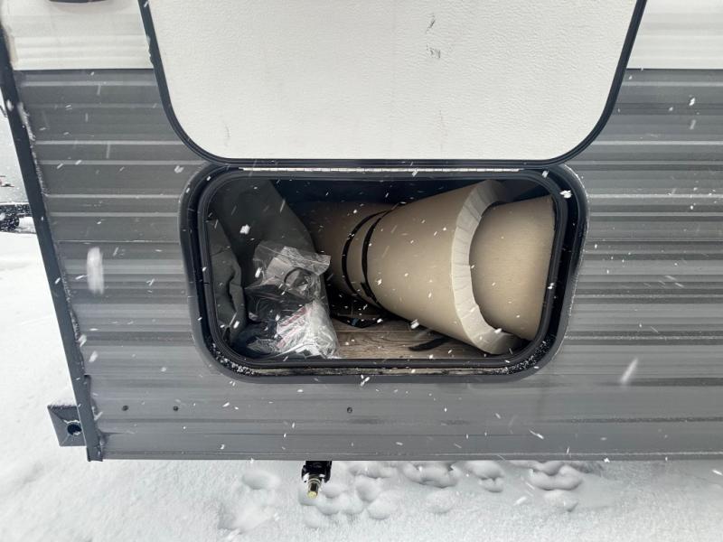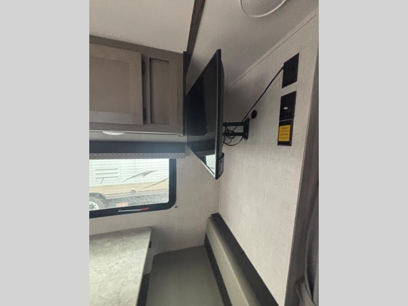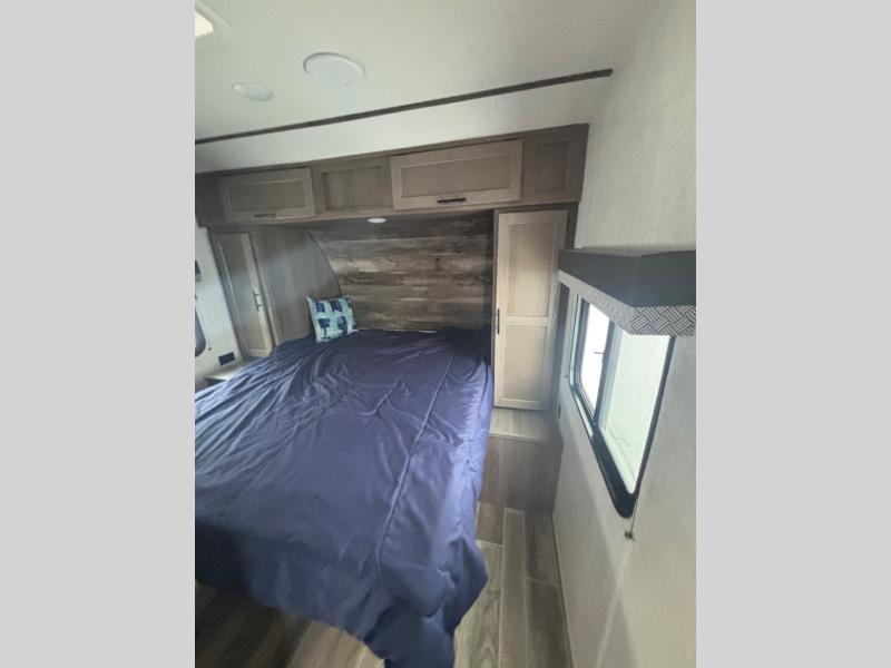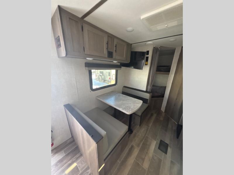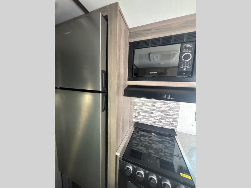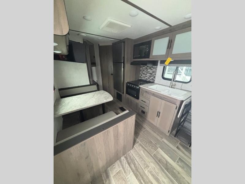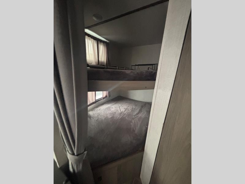 The whole family will enjoy camping in this travel trailer! The kiddos can sleep on the corner set of double bunk beds and you can sleep on the queen bed in the front private bedroom which also has closets on either side of it and a TV shelf across from it. You could even transform the convertible sofa and booth dinette into extra sleeping spaces. Everyone can stay squeaky clean with the shower in the rear corner bathroom and keep their bellies full with the three burner cooktop. The flip-up countertop will provide more space to prepare delicious meals too. As you head out of the unit, grab your jacket from the coat hooks!