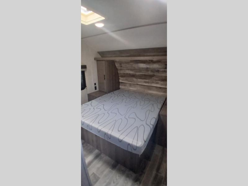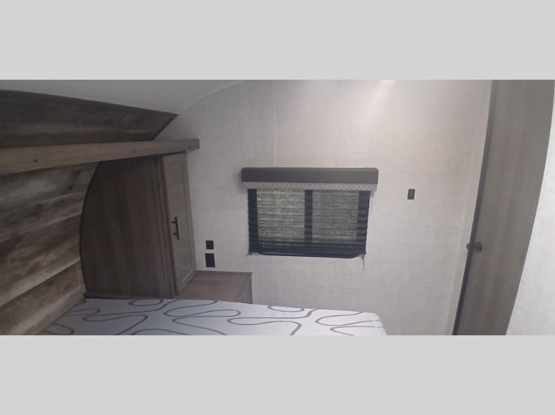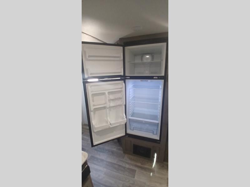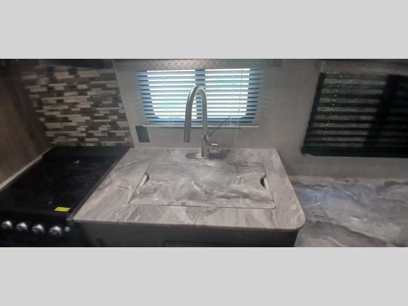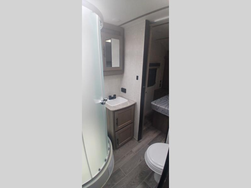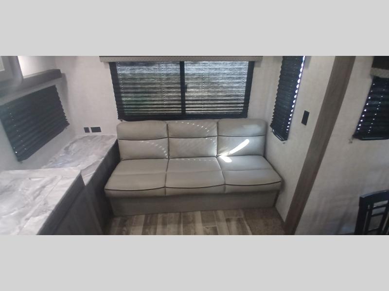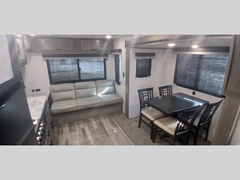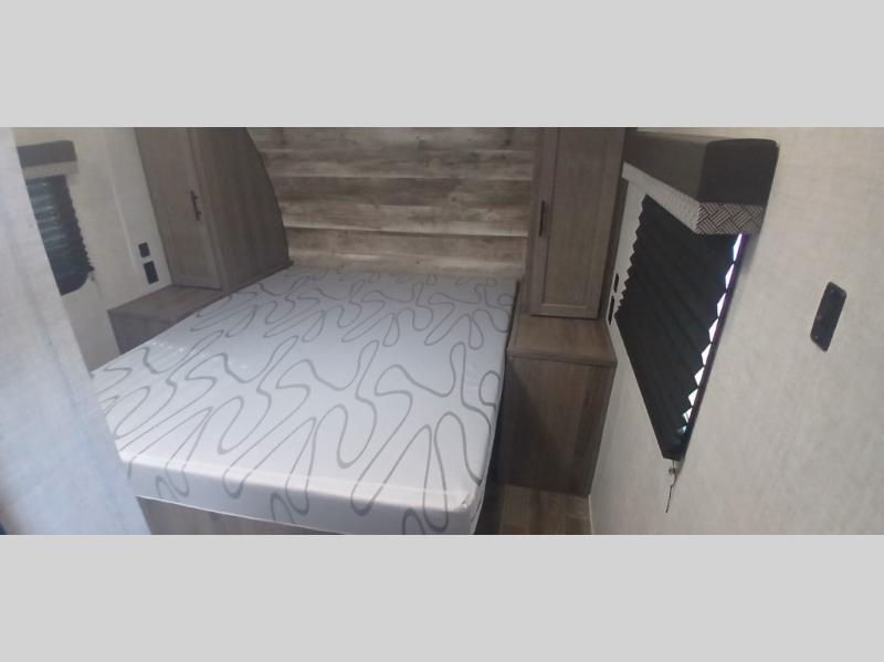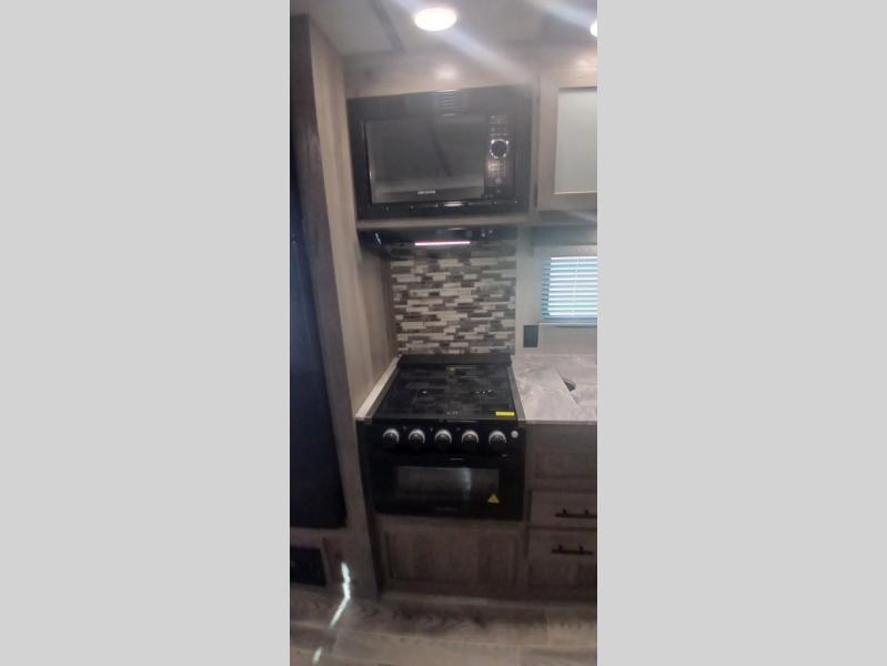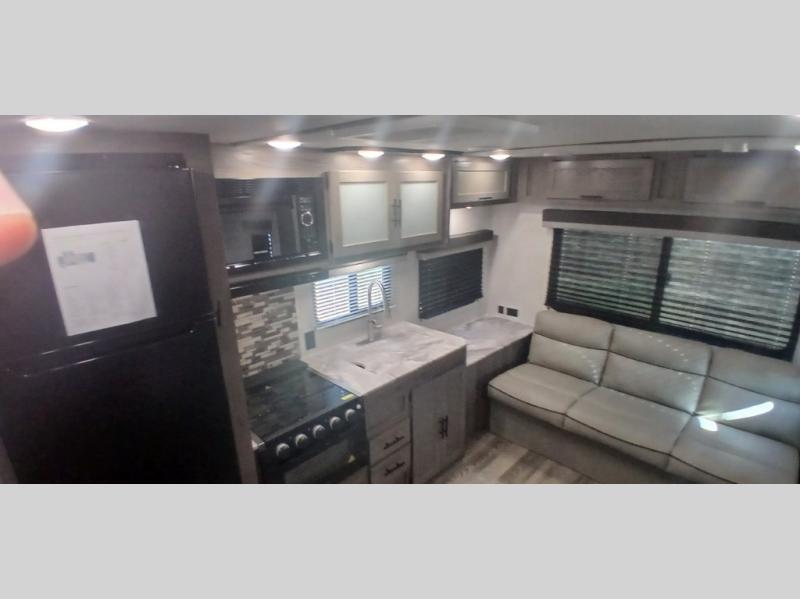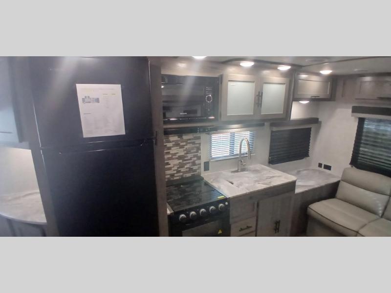 Whether you travel alone or with family and friends, this single slide trailer offers more space in the main living and kitchen area to spread out. You can relax on the rear jackknife sofa, or booth dinette within the slide out, make a meal in the kitchen with full amenities, including a three burner cooktop and a microwave oven. There is also a pantry and a buffet for more storage. The double entry bath is super convenient, and the front bedroom provides a walk-around queen bed with storage on each side and above.