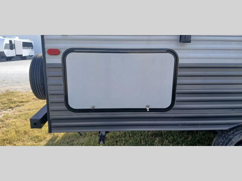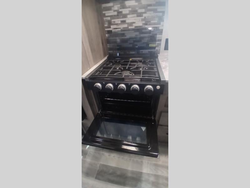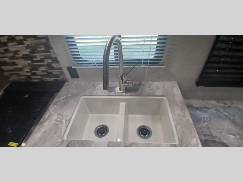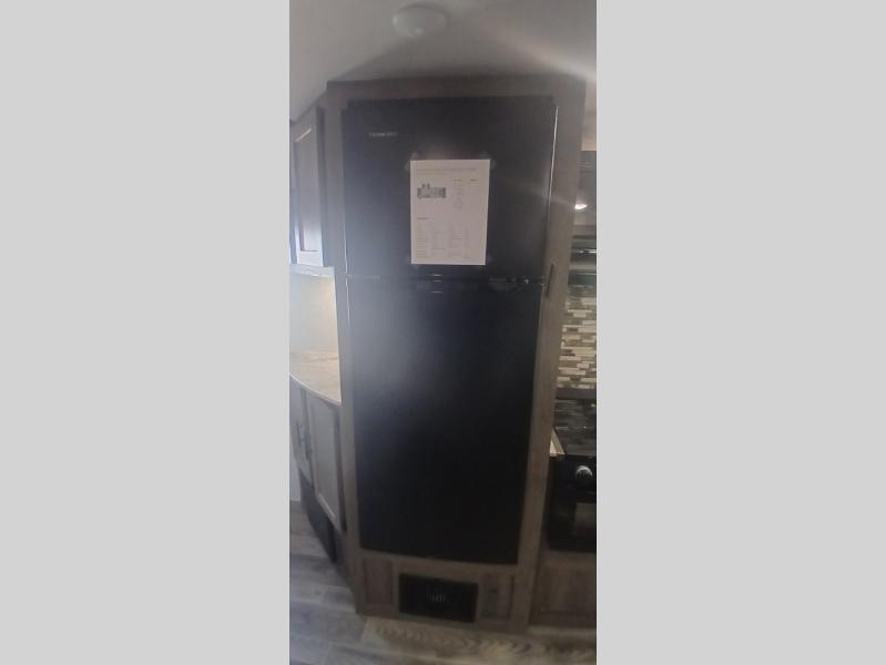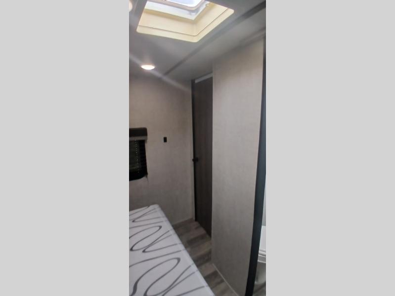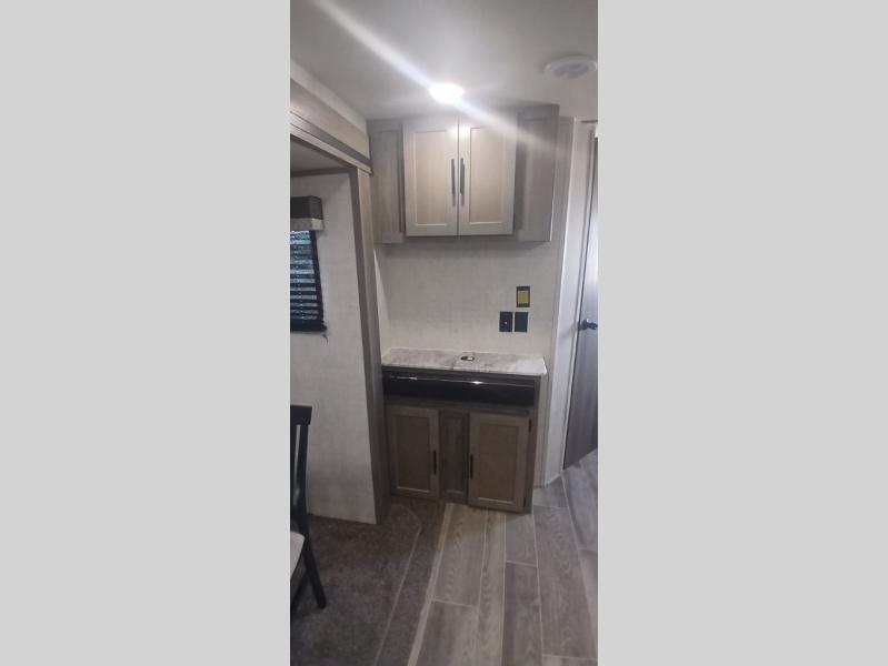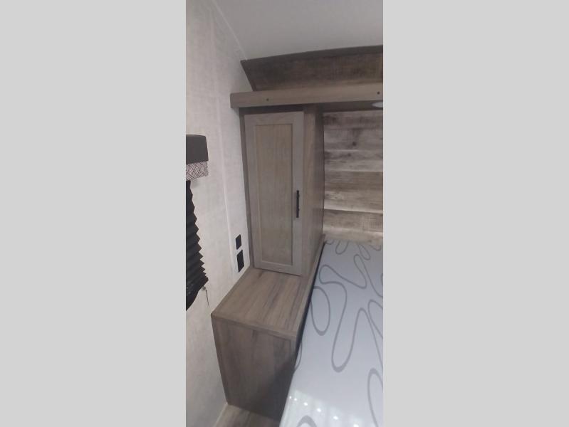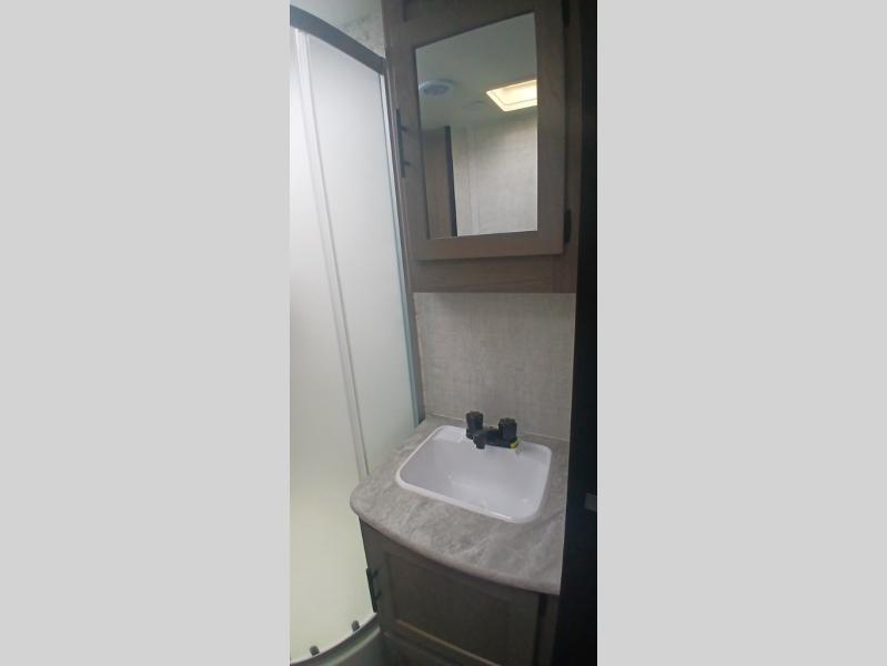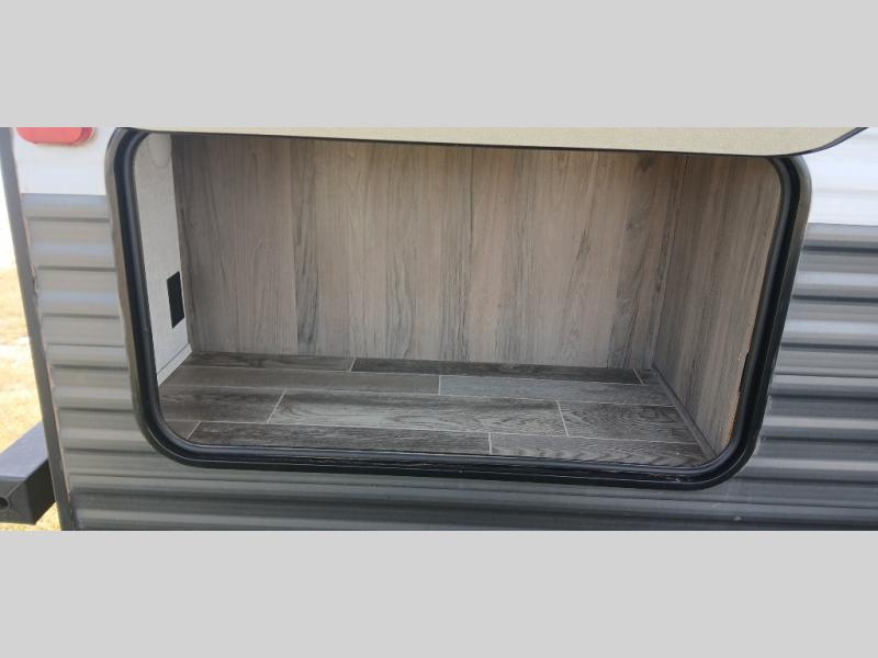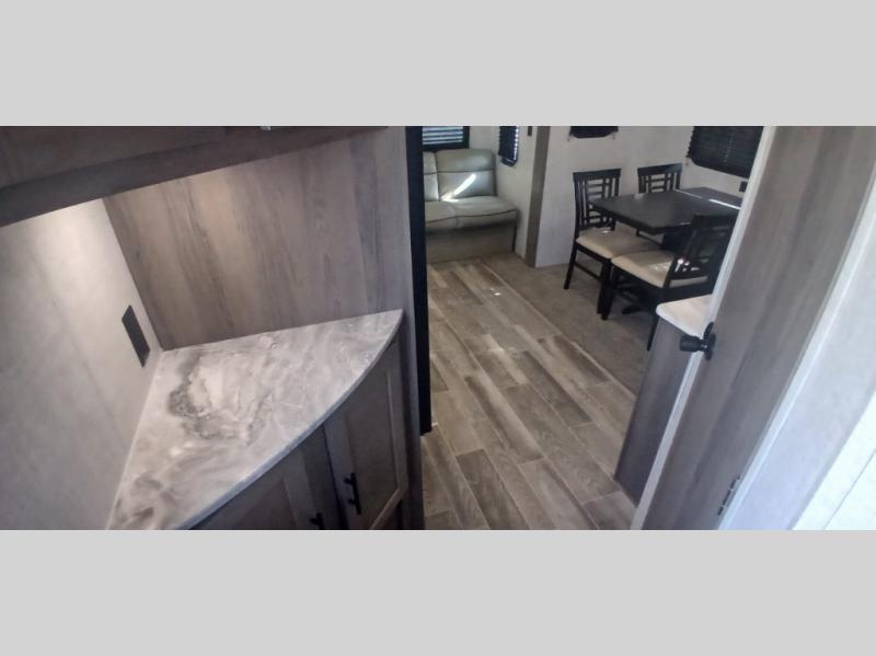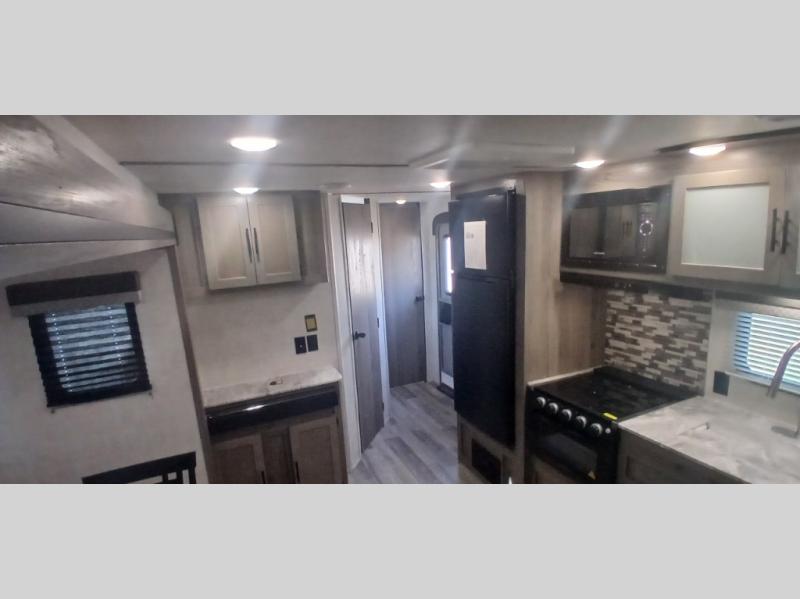 Whether you travel alone or with family and friends, this single slide trailer offers more space in the main living and kitchen area to spread out. You can relax on the rear jackknife sofa, or booth dinette within the slide out, make a meal in the kitchen with full amenities, including a three burner cooktop and a microwave oven. There is also a pantry and a buffet for more storage. The double entry bath is super convenient, and the front bedroom provides a walk-around queen bed with storage on each side and above.